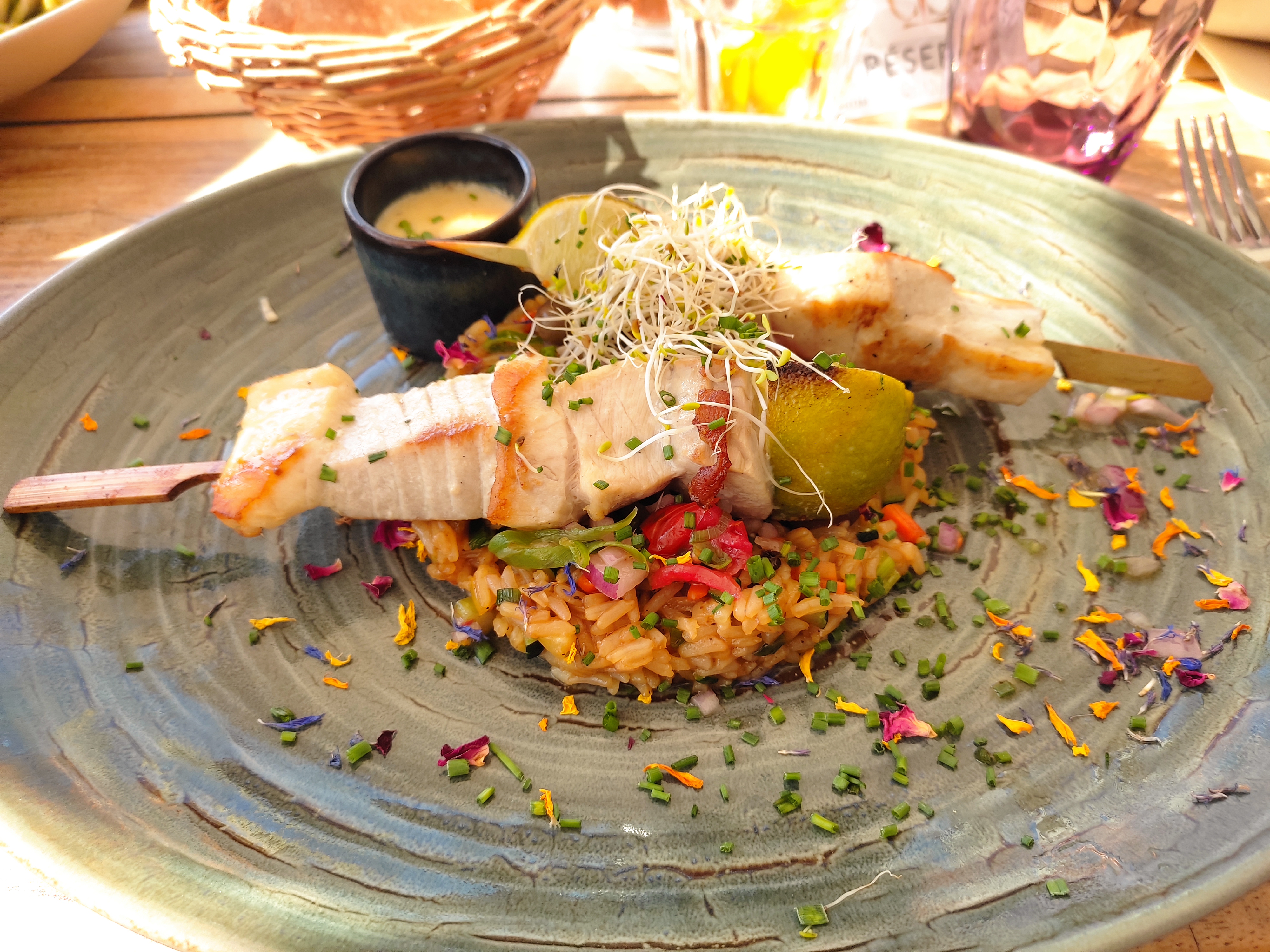 La nourriture était bonne, mais des portions beaucoup plus grandes que ce à quoi nous nous attendions. Nous aurions certainement commandé un plat principal sans entrée si nous l'avions su. Nous avons commencé par l'assiette méditerranéenne, puis les crevettes, les pétoncles et les calamars flambés pour nos plats principaux. Je recommande les crevettes plutôt que les calamars, même si le côté du riz qui accompagnait les brochettes laissait beaucoup à désirer. Se prélasser sur les chaises était super ! Serveurs sympathiques sur la plage et cocktails délicieux.