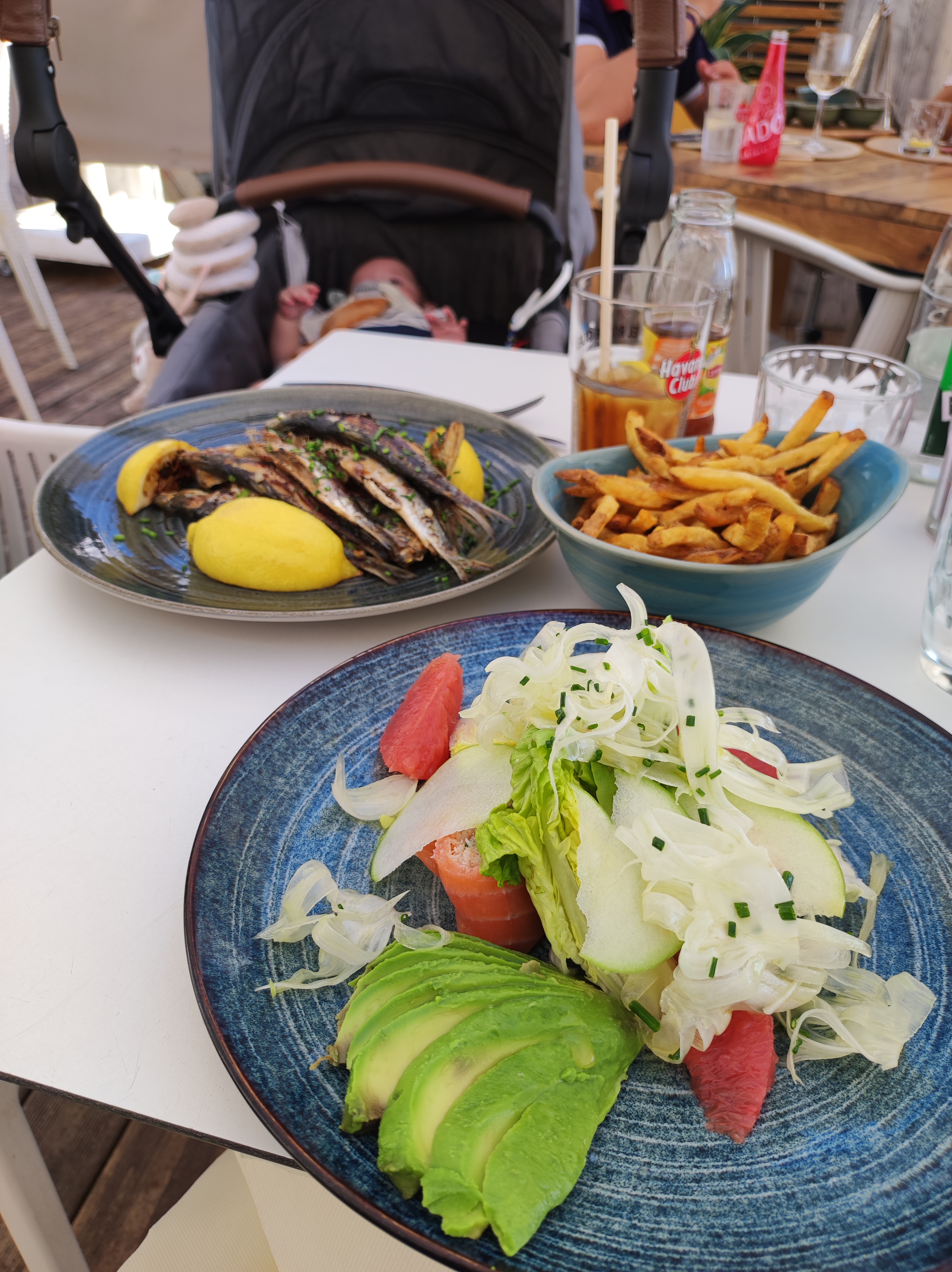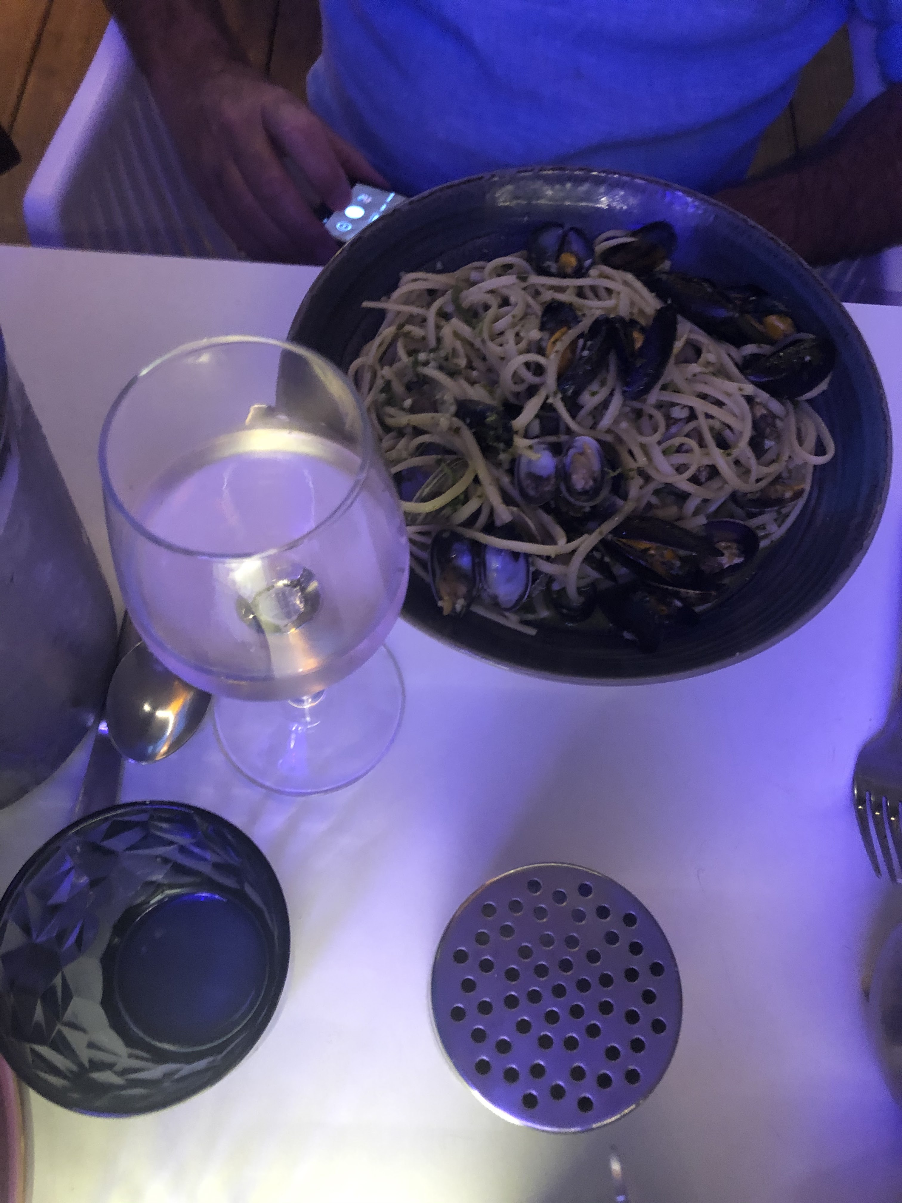 Manger commence à 19 heures. En attendant, nous avons bu un verre de vin sur un transat. La nourriture était bonne. Malheureusement, les tables de la première rangée étaient toutes réservées. Nous sommes partis une heure plus tard et les tables étaient toujours vides au premier rang. Ce froid serait mieux fait. Sinon, nous avons donné 5 départs. Les fruits de mer et les pâtes étaient aldente et délicieux