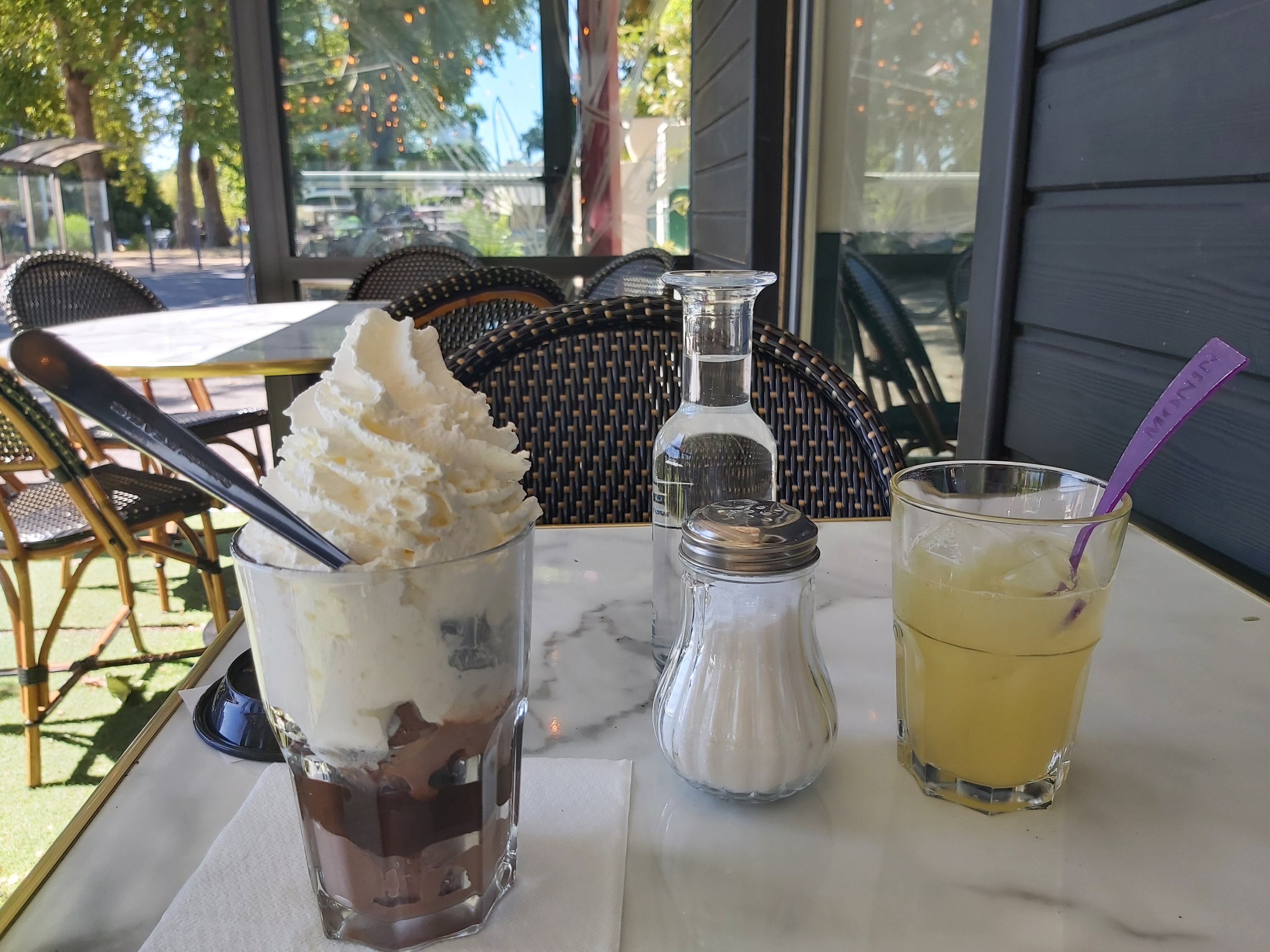 Une petite douceur à l'heure du goûter avec vue directe sur l'Erdre... Les glaces sont bien présentées, la chantilly délicieuse... Et cette carafe d'eau fraîche en accompagnement que l'on n'a même pas besoin de demander...