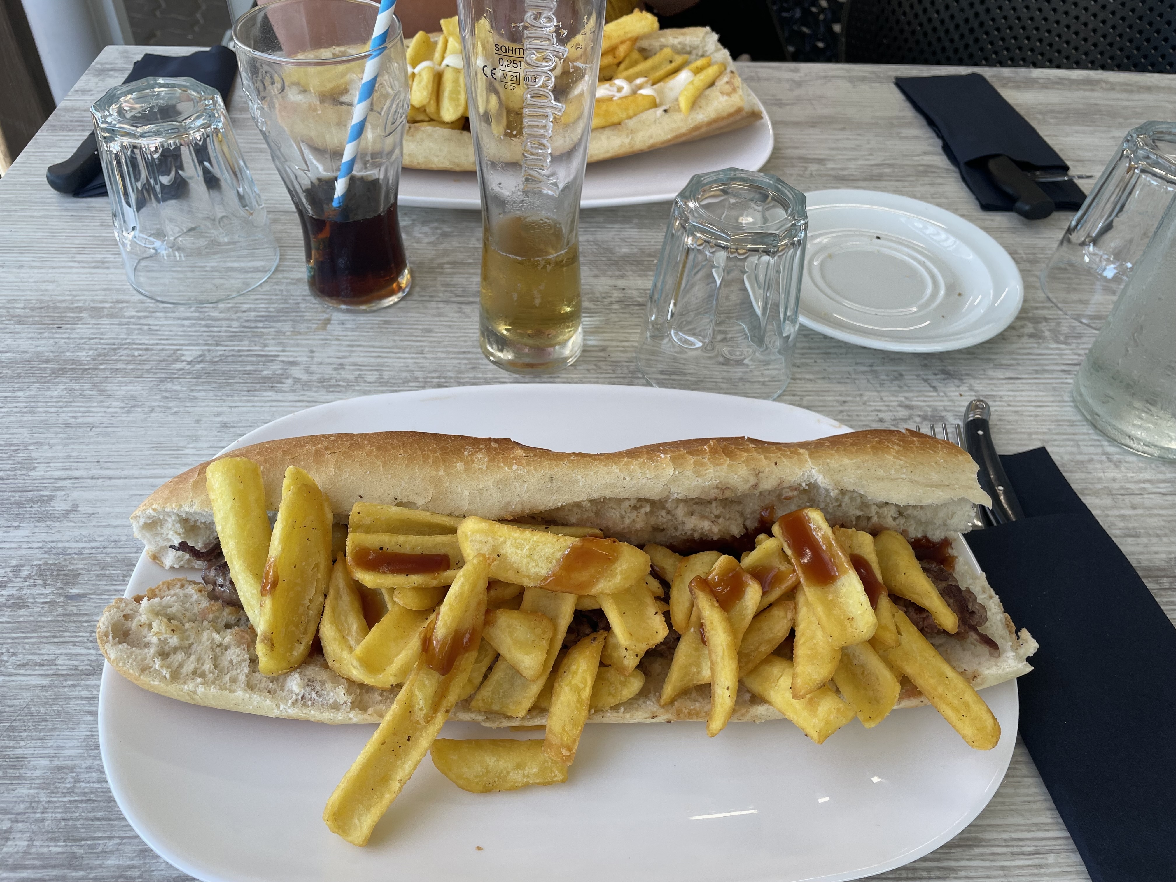 Fin des vacances, on prend un sandwich pour la route. Quelle surprise de voir un sandwich dans une baguette entière ! Pour moins de 7€ en menu avec boisson. C'était un régal !