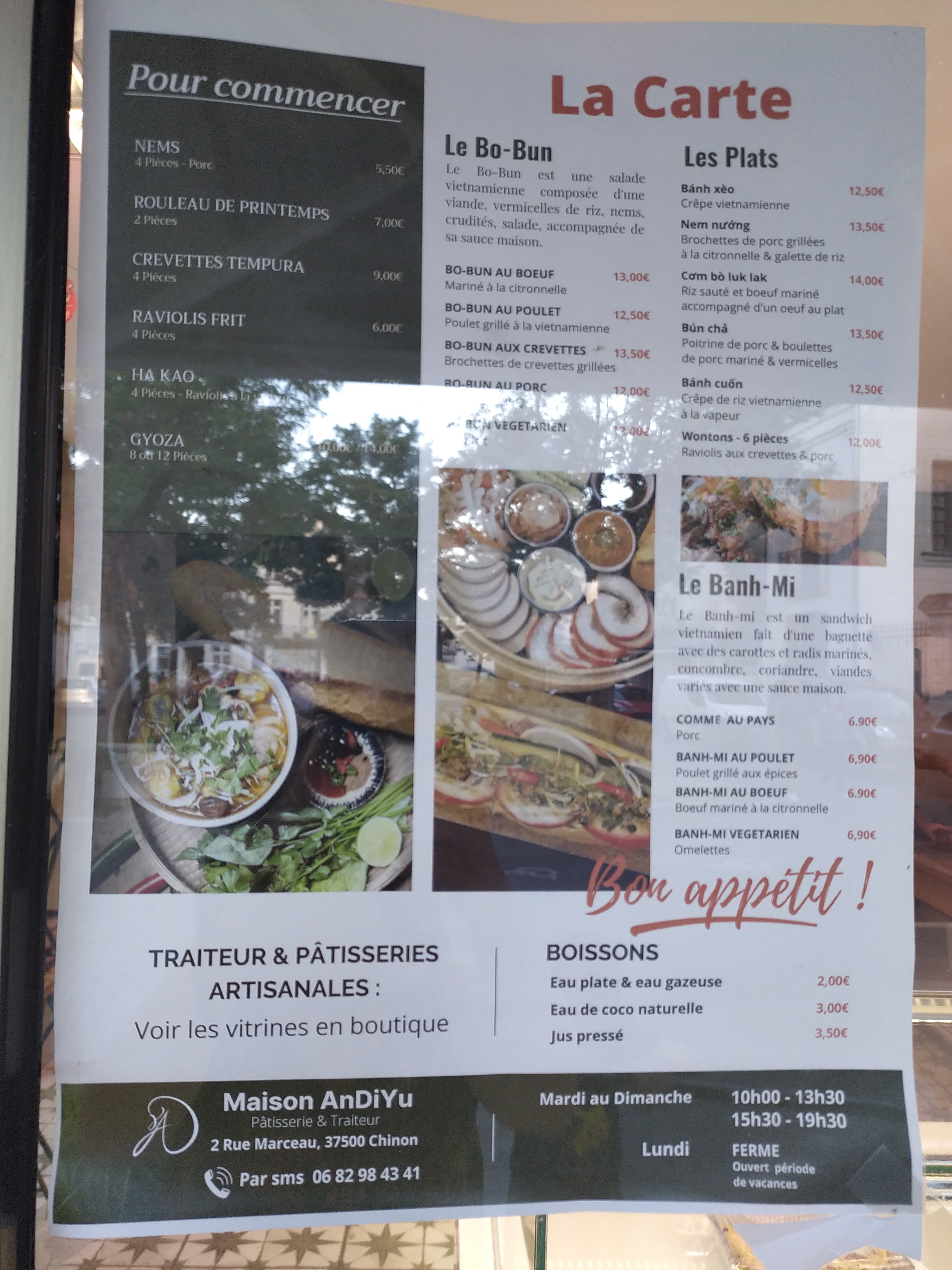 Agréablement surprise de découvrir un traiteur vietnamien sur Chinon ! Des ingrédients de qualité, des plats typiques qui me rappellent la cuisine maternelle, des banh mì !!! Et de quoi satisfaire les végétariens au besoin. A découvrir absolument !