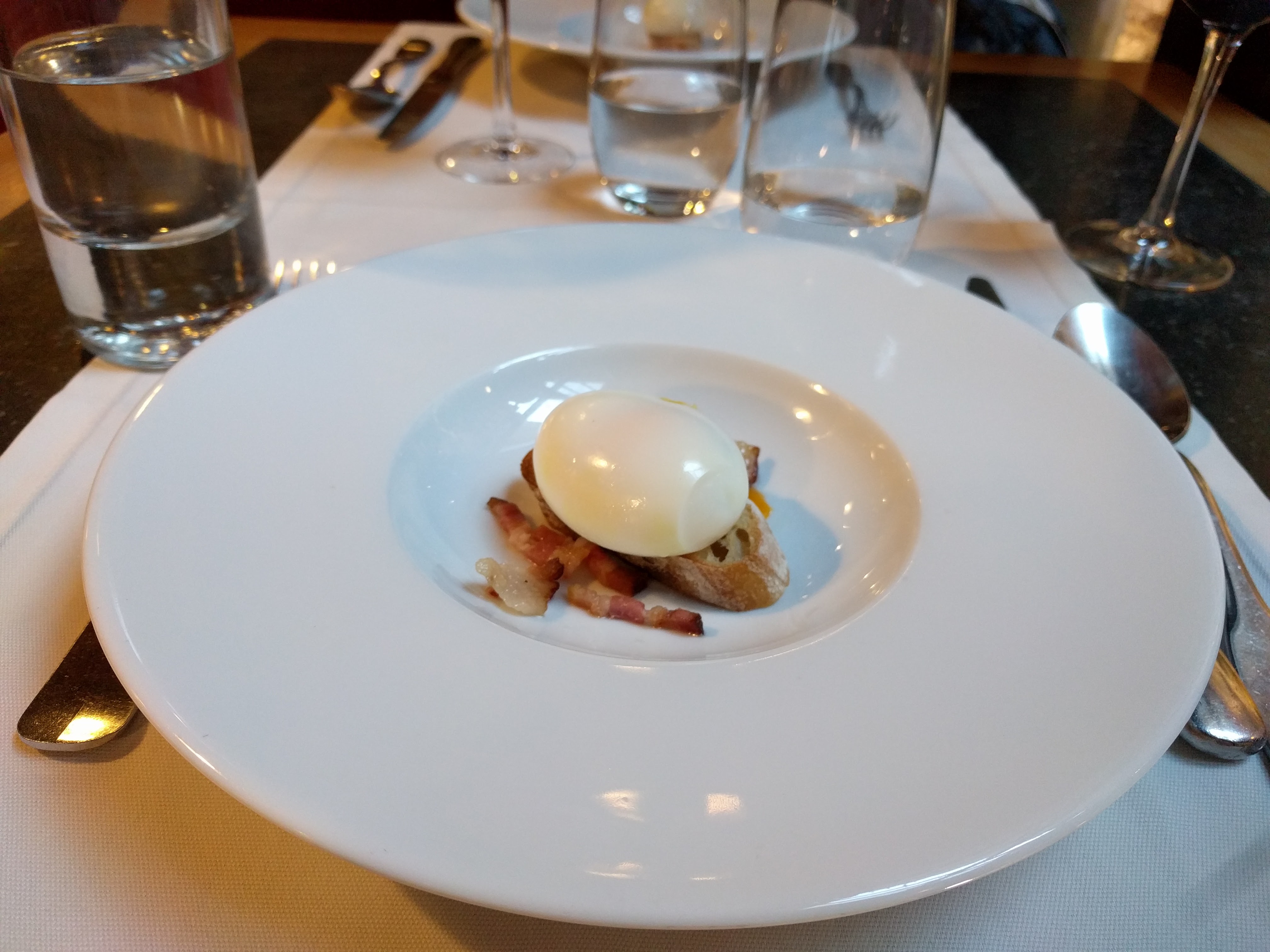 Serveuse négligée tenue pas du tout adéquate dans un lieu superbe. Amuse bouche 1 seul tout petit pour accompagner une coupe de champagne à 13 euros, foie gras glacé sortant du réfrigérateur, œuf meurette complètement raté,bar en croûte parfait. Dessert correct Bref nous n,y retournerons pas Le tout pour 80 euros par personne Dommage