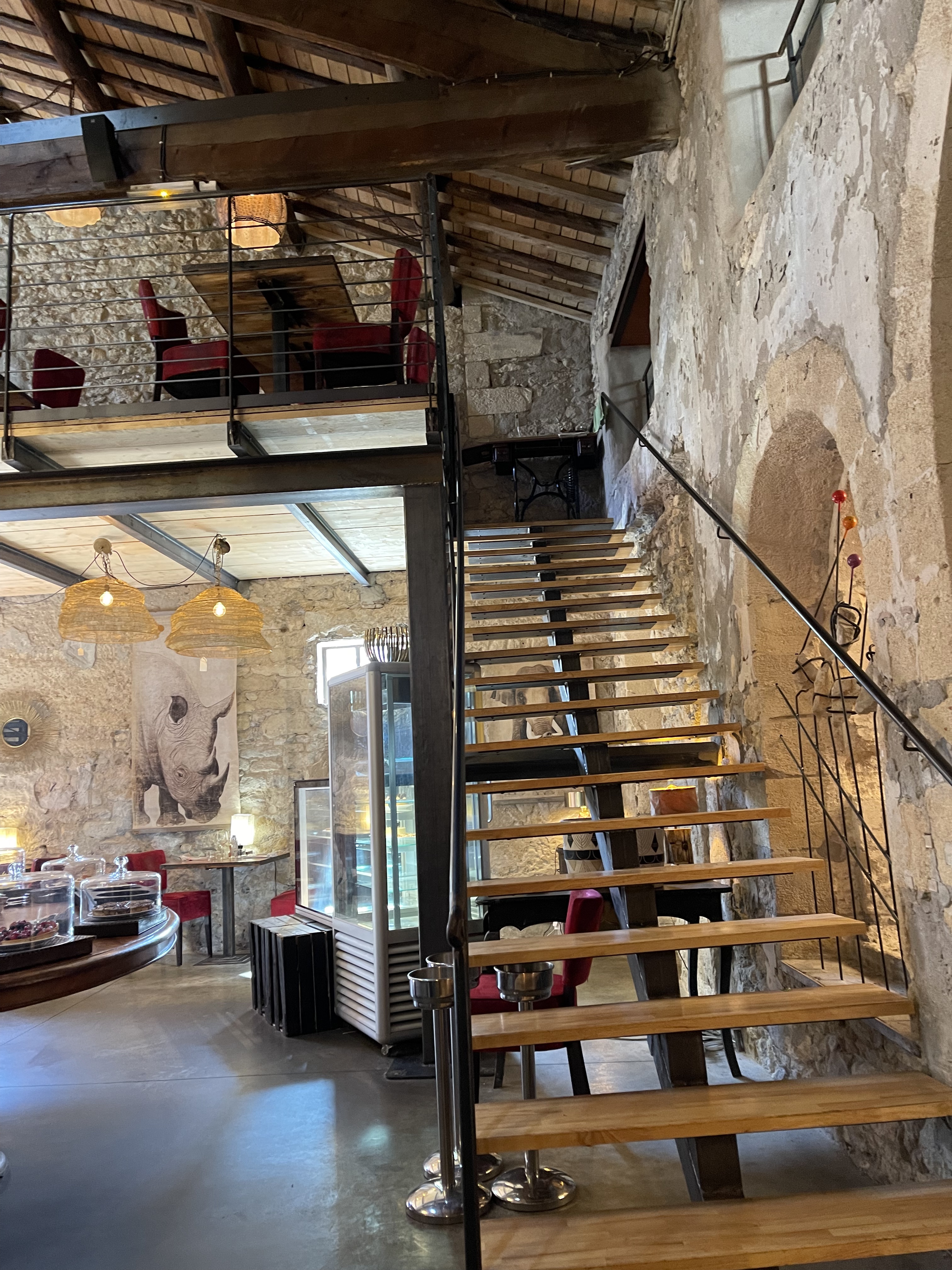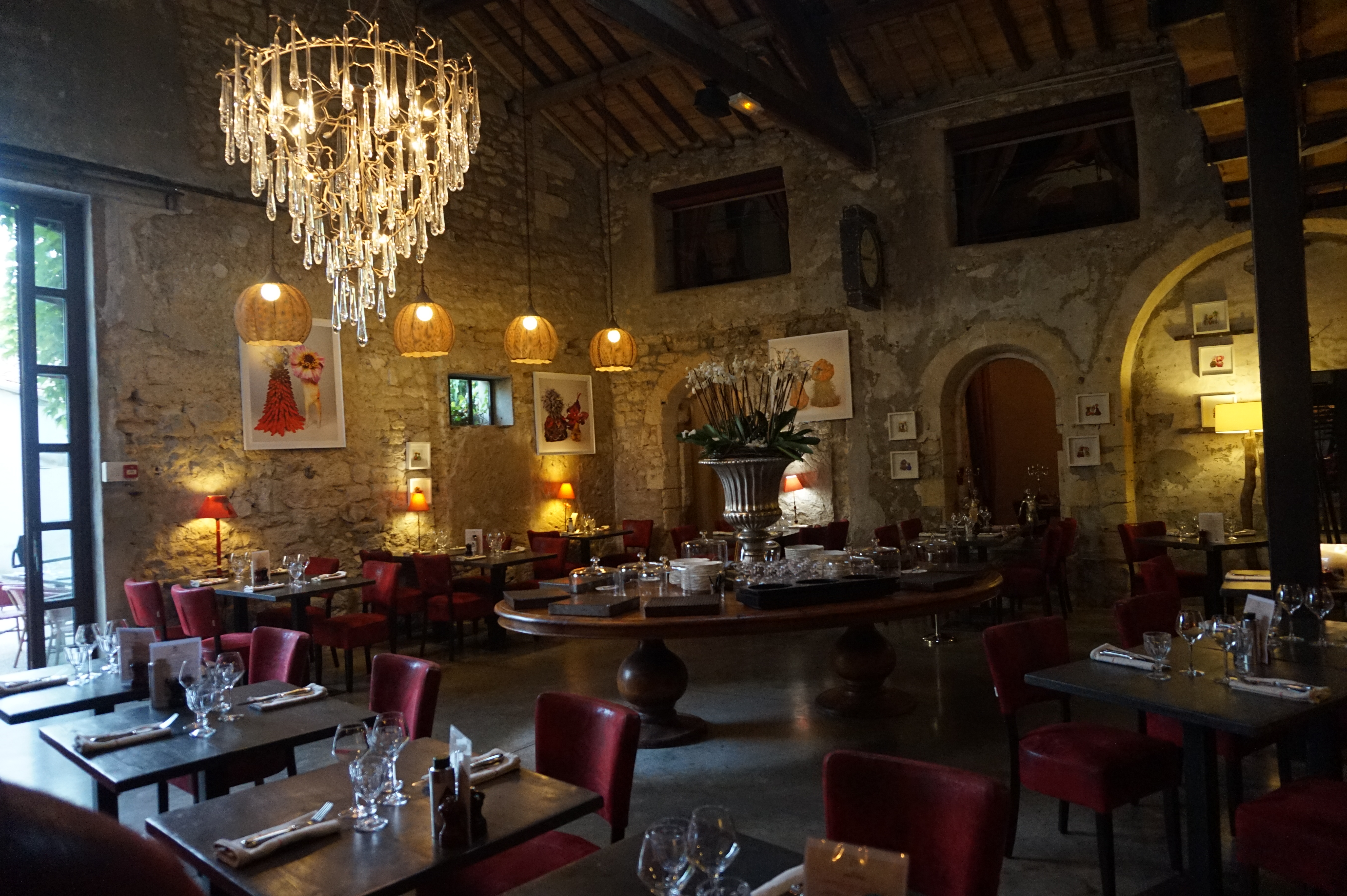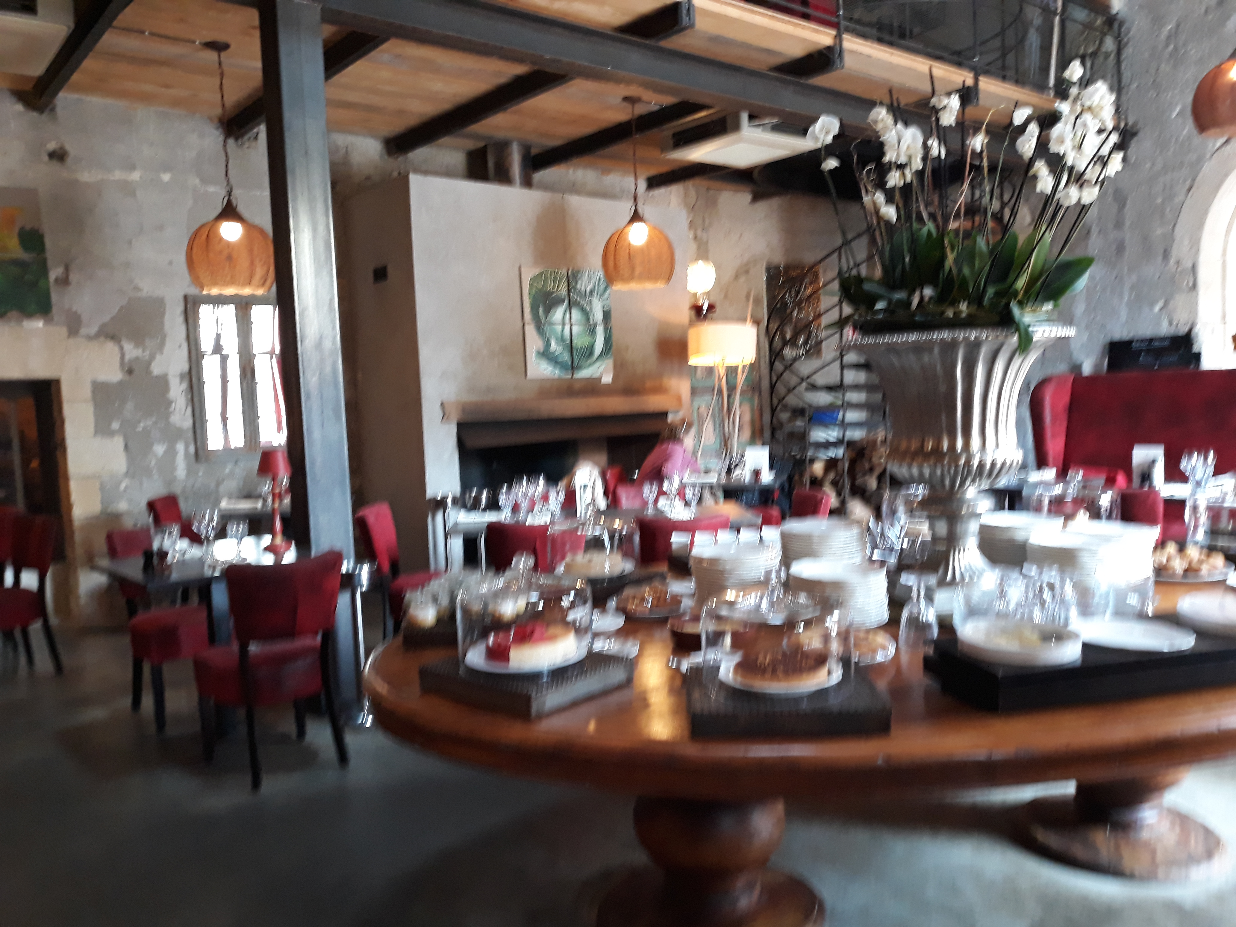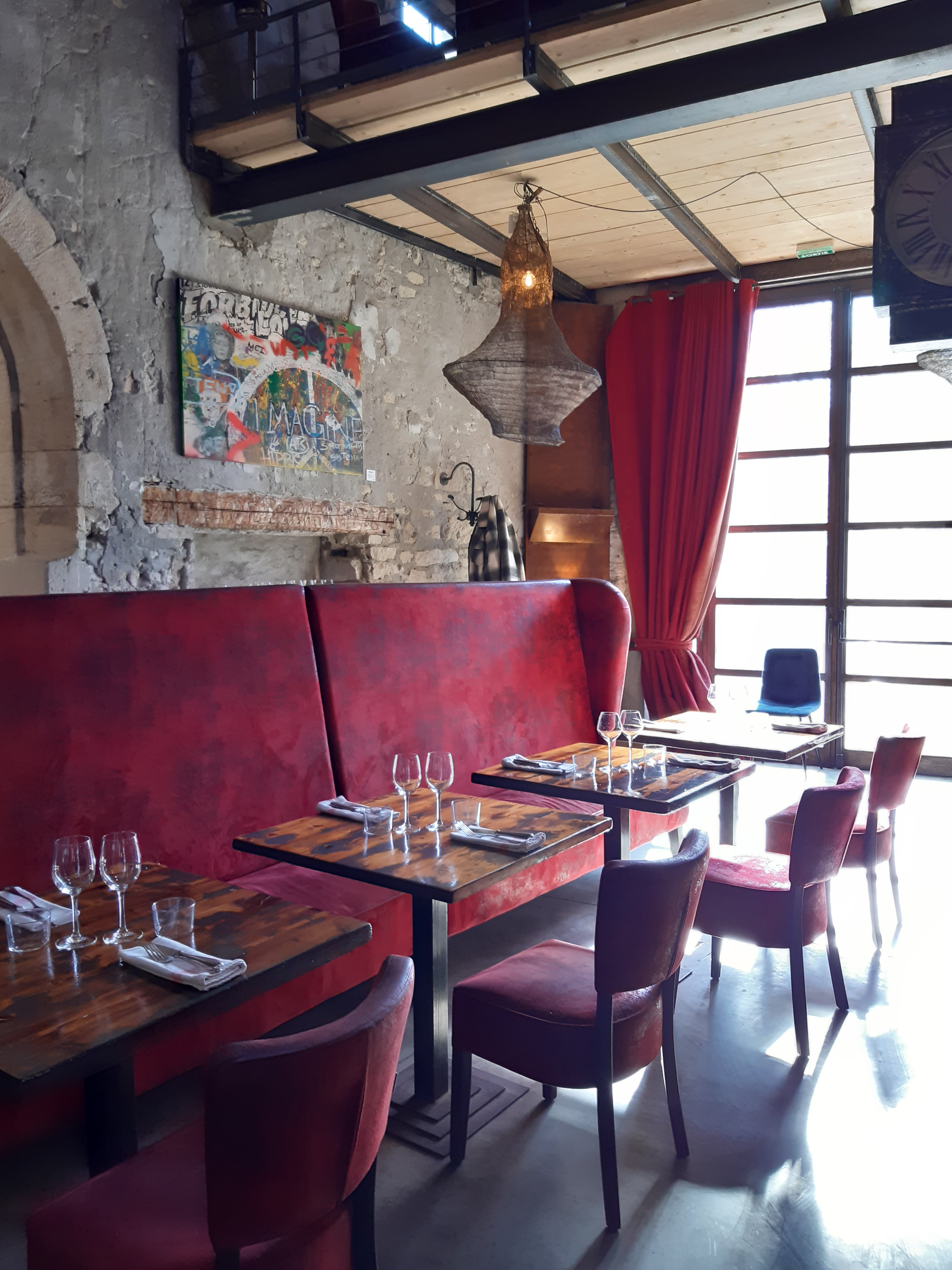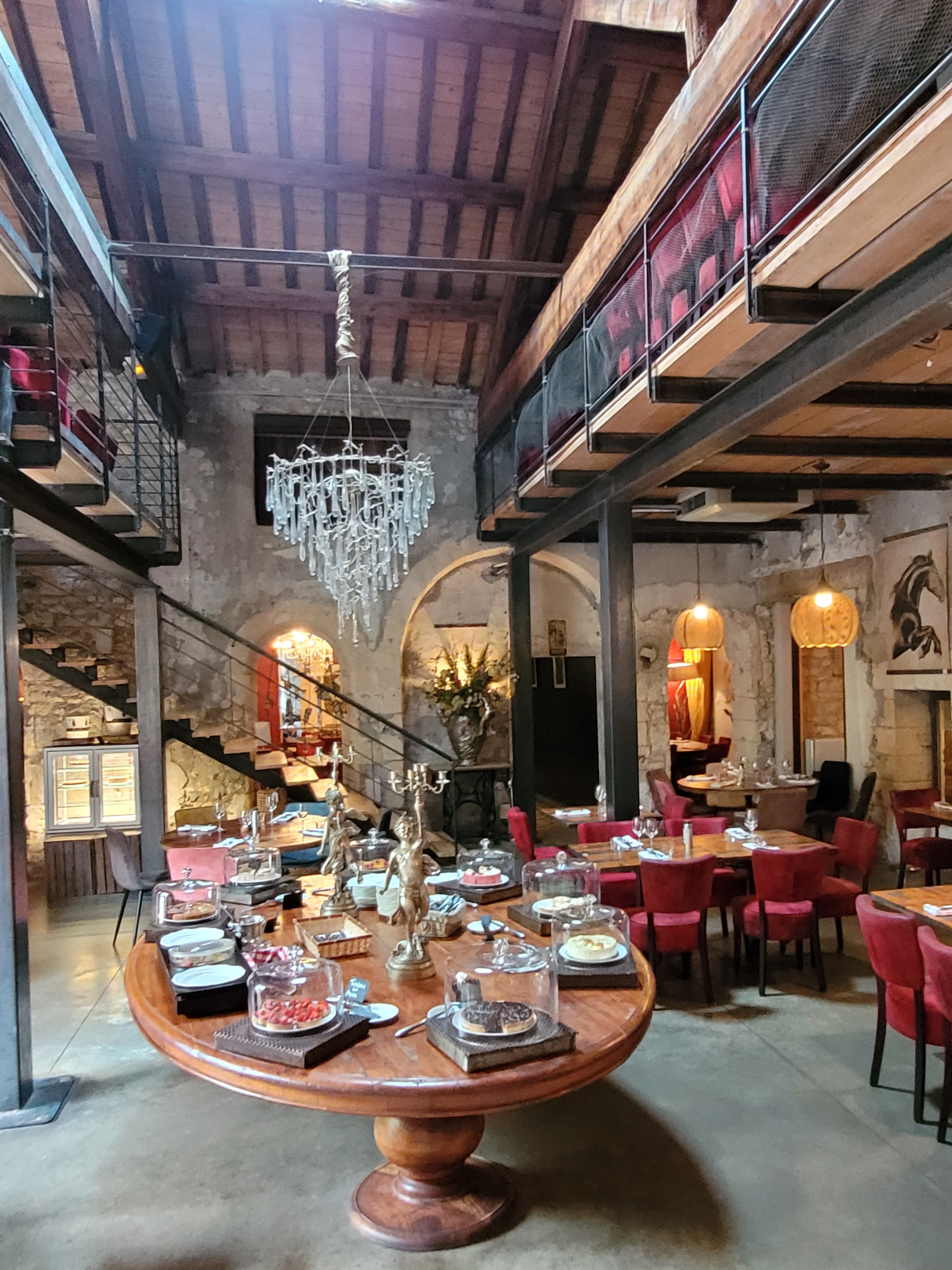Extraordinaire! Magnifique restaurant dans un ancien moulin au cœur de Villeneuve les Avignon décoration rouge métal et bois lieu à la fois feutré et convivial plats délicieux bar à desserts un péché ! Huile Cuvée des Charteux achetée à la Boutique la très souriante Mélania nous explique l'histoire de ce lieu historique,nous montre le bar à tapas et la belle verrière, nous encourage à découvrir le jardin avec ses tables entre les arbres, les tonnelles, le terrain de pétanque et même les poules un lieu où il fait bon se détendre, partager des moments en couple en famille ou entre amis Regardez mes photos Je vous le recommande