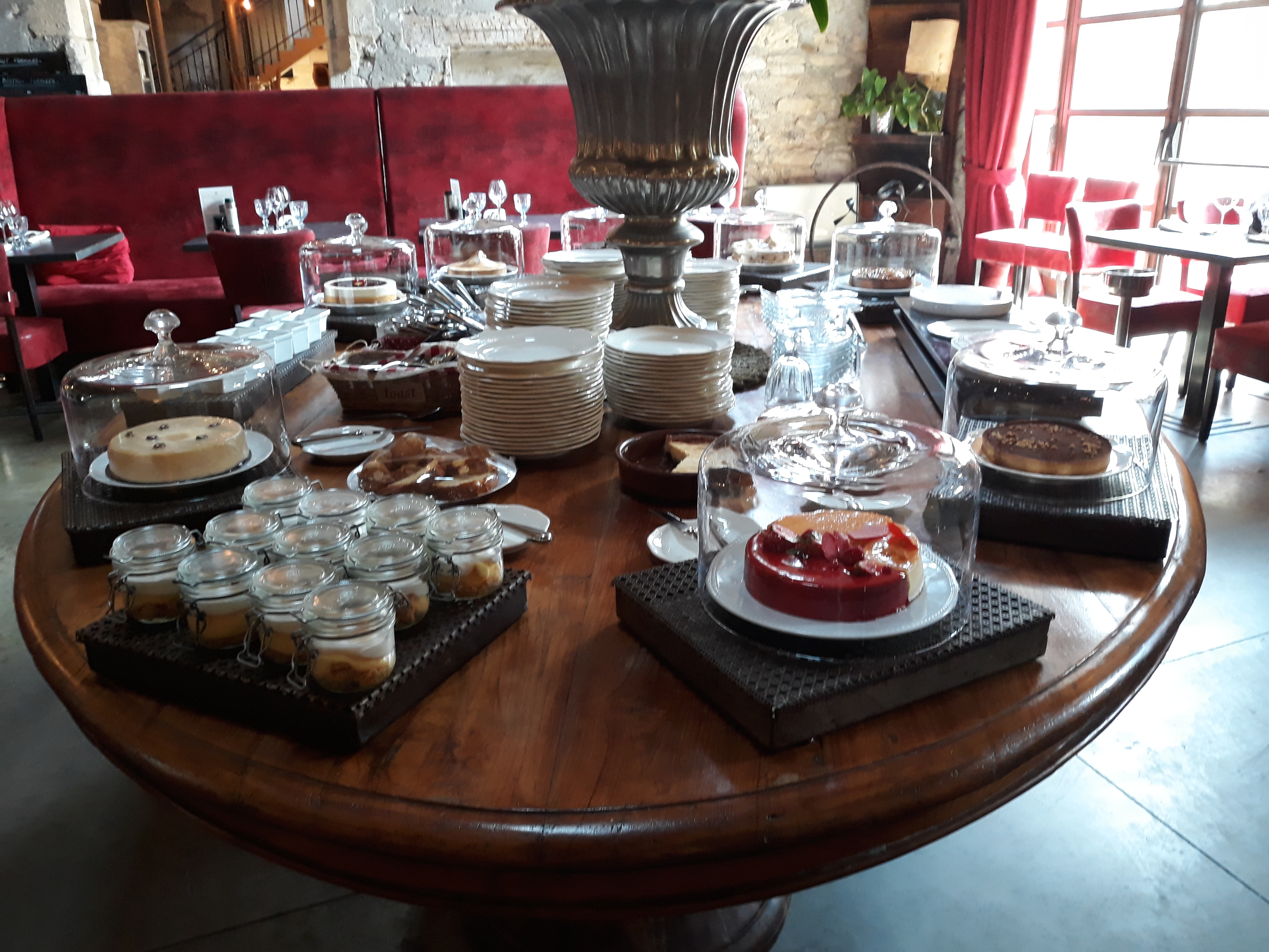 ❝ Table de desserts maison et menu saisonnier dans une ancienne grange aux fauteuils rouges et au cadre stylé. ❞