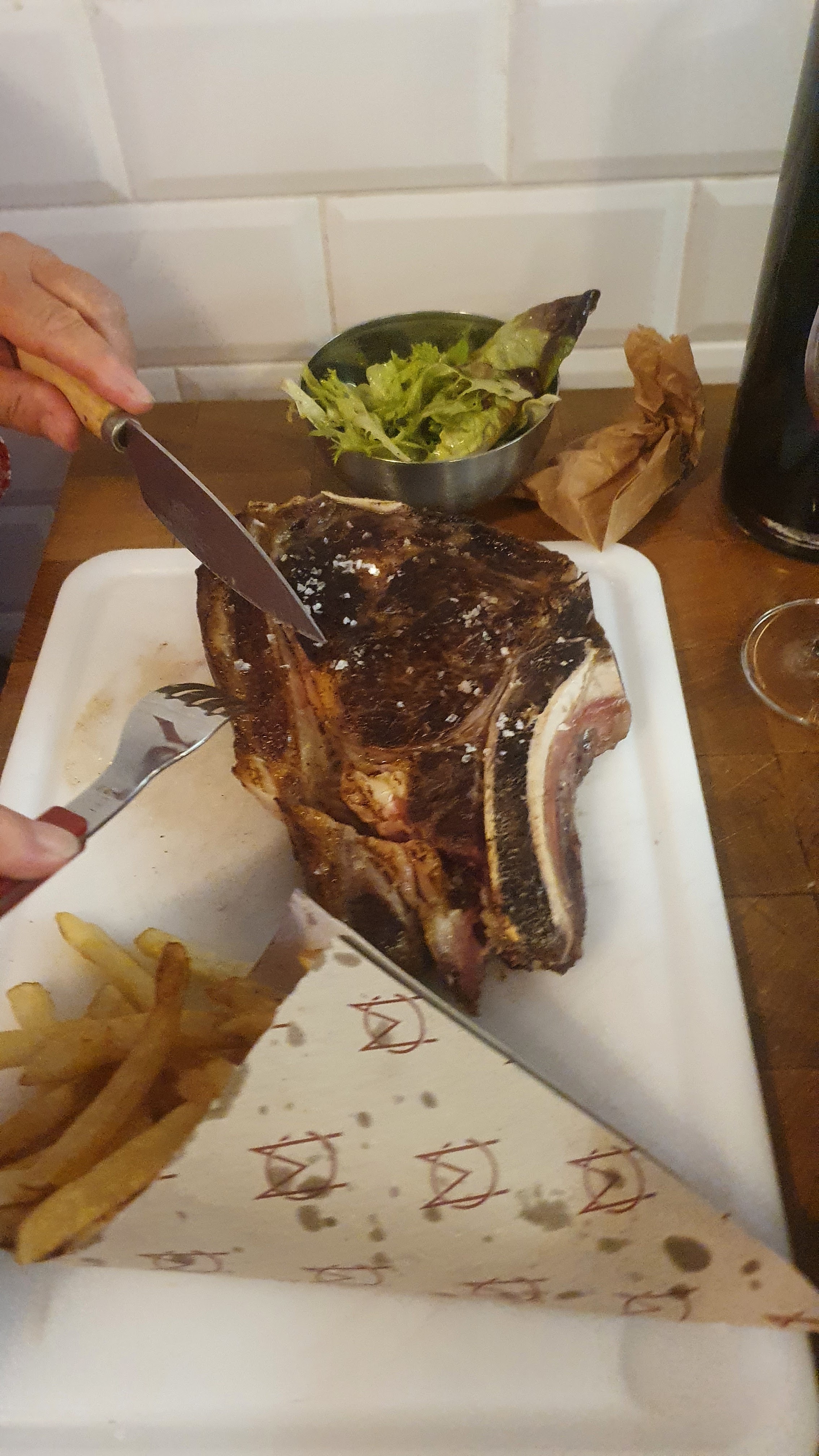 Une seule chose au menu mais ils ont raison ! Une très bonne côte de bœuf, assez confortable pour deux personnes, servie avec de la salade et de très très bonnes frites. Le service était sympathique et heureux d'expliquer le processus en anglais.