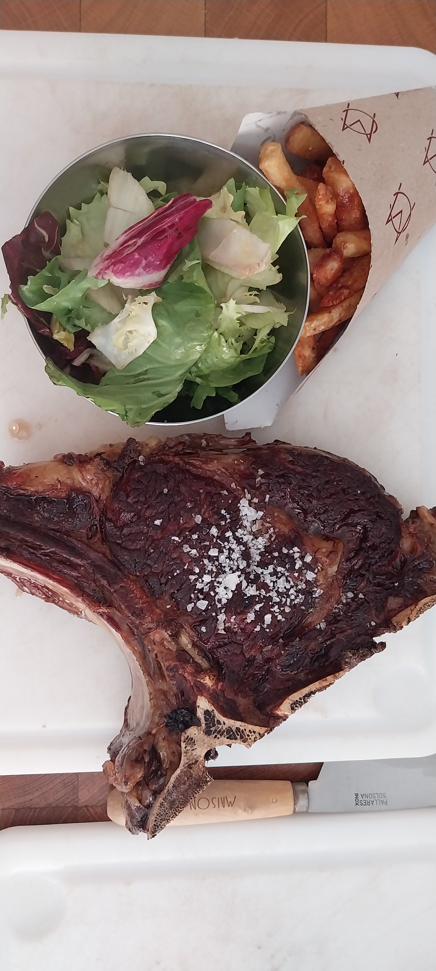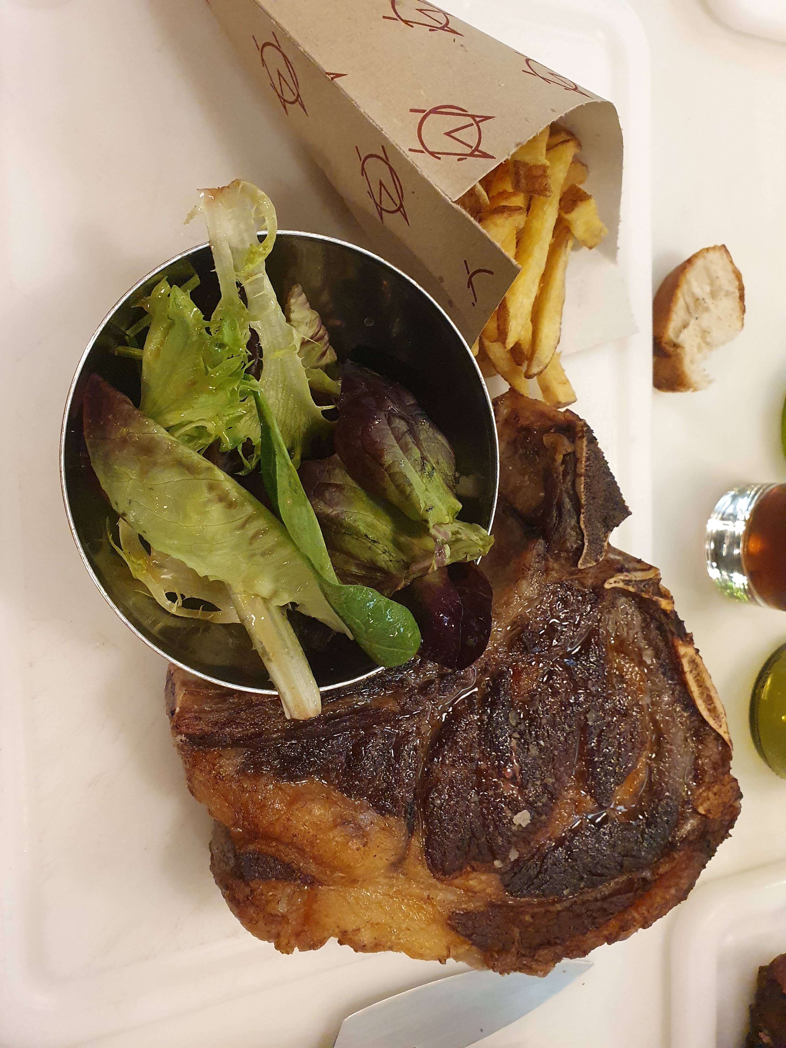 Pour un resto/boucher qui ne propose QUE de la côte de bœuf on s'attend évidemment à ce qu'elle soit excellente. Elle est bonne, mais rien d'exceptionnel. La petite portion de frites et la petite portion de salade c'est un peu pareil, bon mais pas excellent. C'est bien dommage de tout miser sur un seul plat et ne pas l'exécuter à la perfection. Le concept est sympa et le service est pour le coup au top, mais vous trouverez des meilleures côtes de bœuf ailleurs !