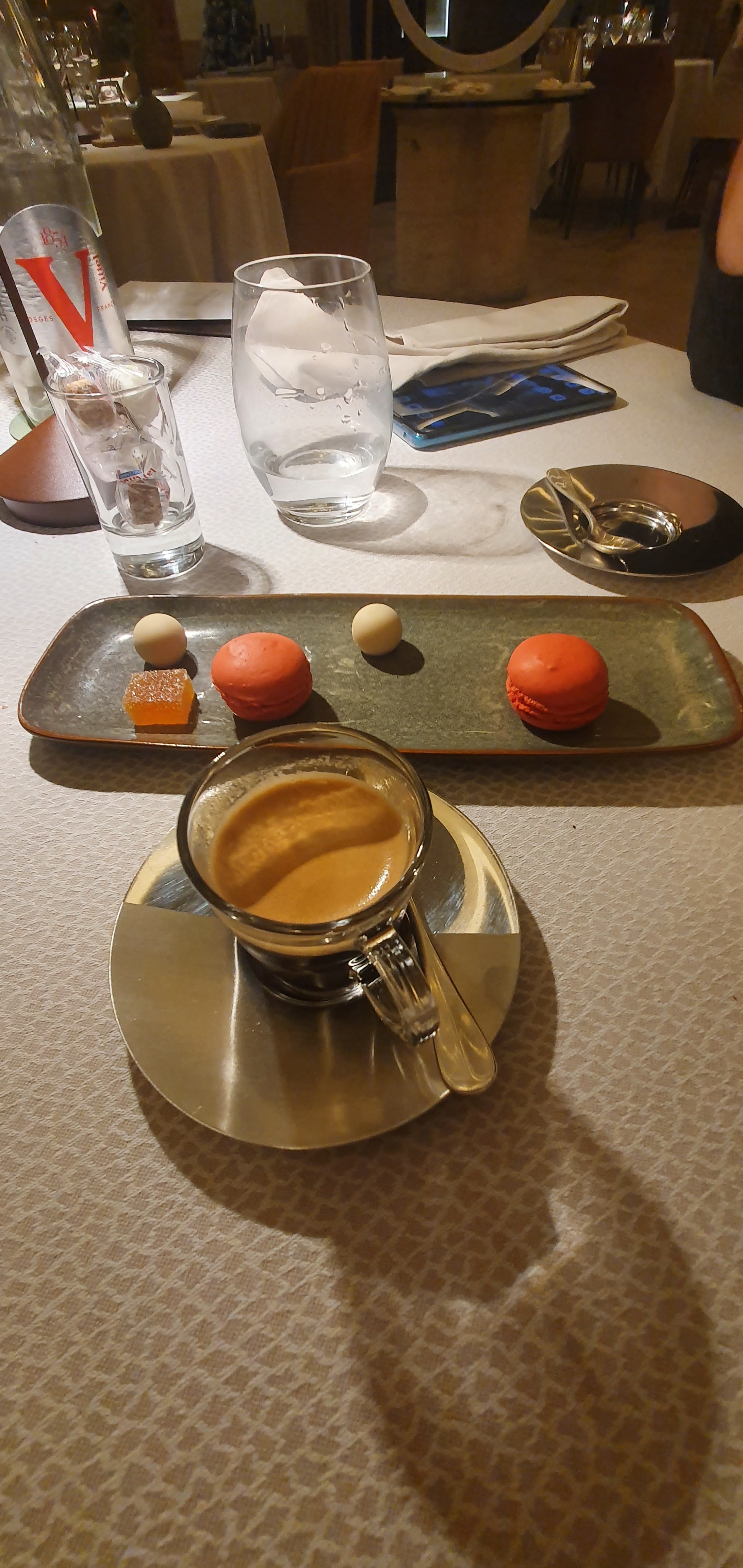 Restaurant gastronomique, serveur et serveuse au niveau. 7 plats avec champagne, vin blanc, vin rouge, eau, café. Excellent produit, très belle présentation ! Meme si le cout est important, je recommande ce restaurant. Ça vaux vraiment le prix !