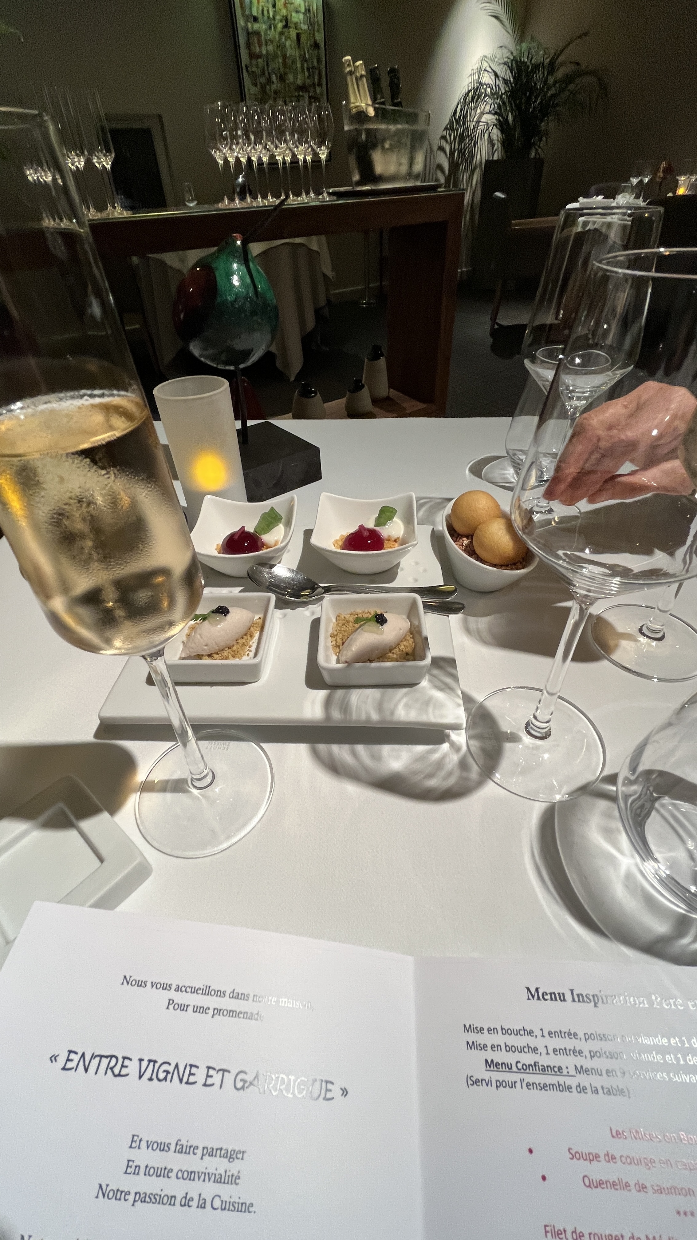 Après des recherches pour trouver un établissement pour fêter nos 15 ans de mariage, je me suis décidé sur vigne et Garrigue..et ben !! Alors que du bonheur... un moment très très agréable, une explosion de saveurs .!! Bref juste une envie d’y revenir !! Bravo à l’équipe salle et aux chefs.. merci pour ce moment inoubliable !! À très bientôt