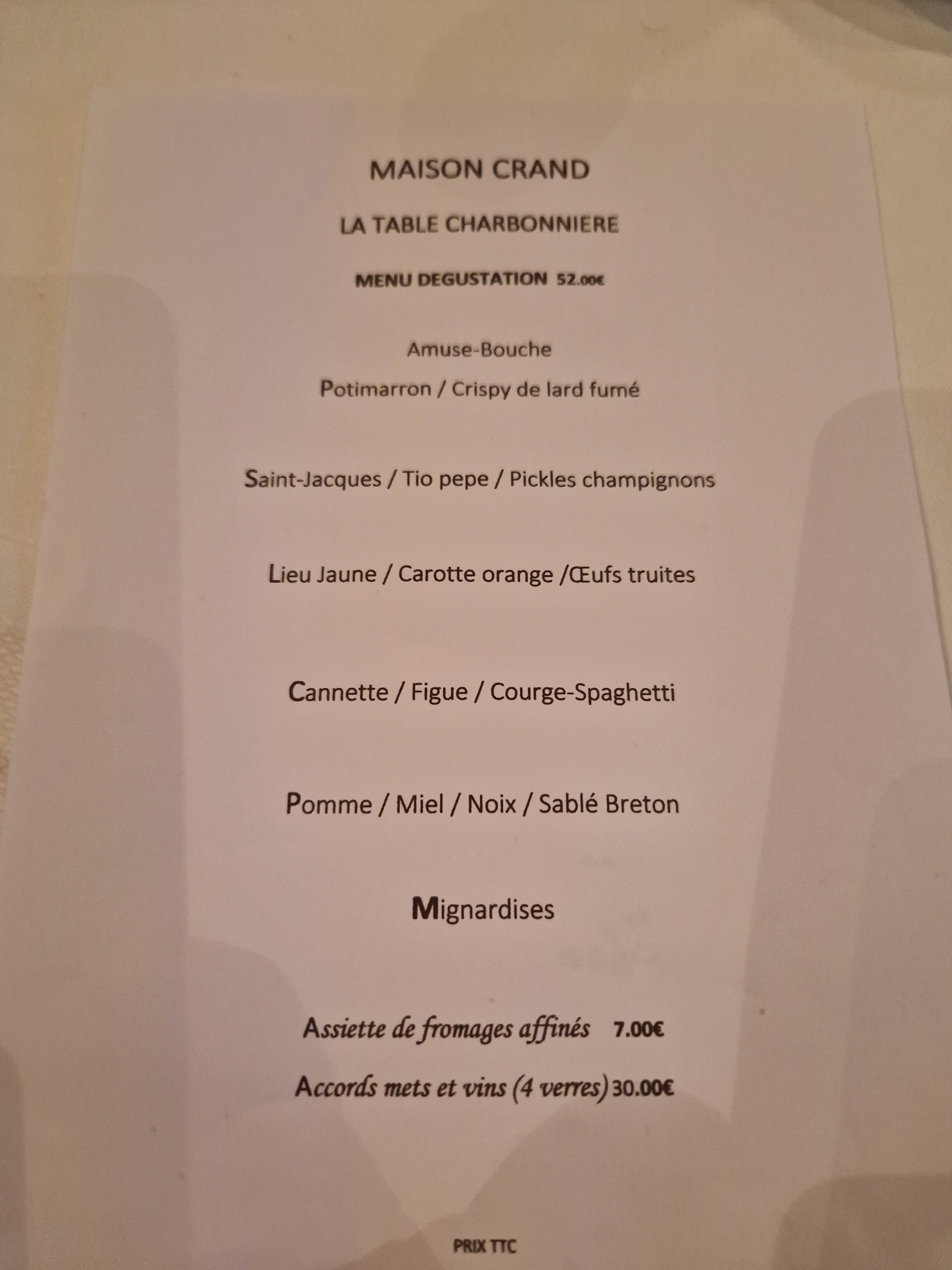 première visite à la maison CRAND. Service agréable , fauteuils confortables , salle un peu sombre et écran pas très utile. Repas : Amuse bouche cherchez l'anguille...;Ballotine de volaille au goût de cervelas, le cromesquis au goût de beignet de crevettes , le poisson cuisson parfaite,beurre trop présent sans goût de d'orange sanguine; la joue de boeuf une tuerie!! dommage que dans un gastro on commence avec des petites pains et que la suite ce ne sont que de simples tranches ; très bons desserts , belle carte des vins . Dommage de ne pas voir le chef en salle . On ne refera pas