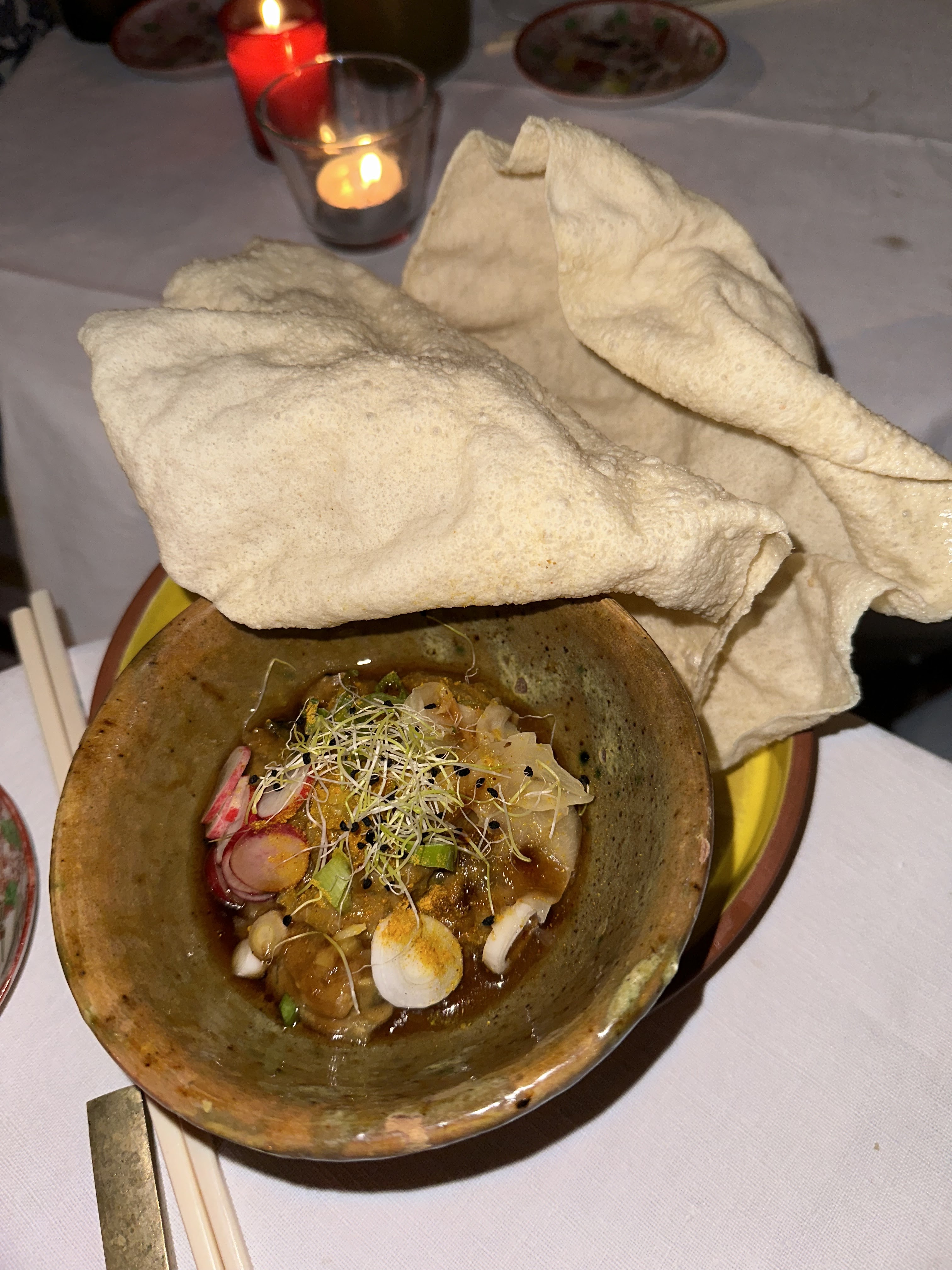 Un vrai voyage culinaire, la multitude de plats que l'ont vous sert mettent vos papilles en alertes permanente. Le tout dans un cadre chaleureux et intimiste. Pas de carte ni de menu, laisser vous guider c'est un bonheur. Encore bravo au chef.