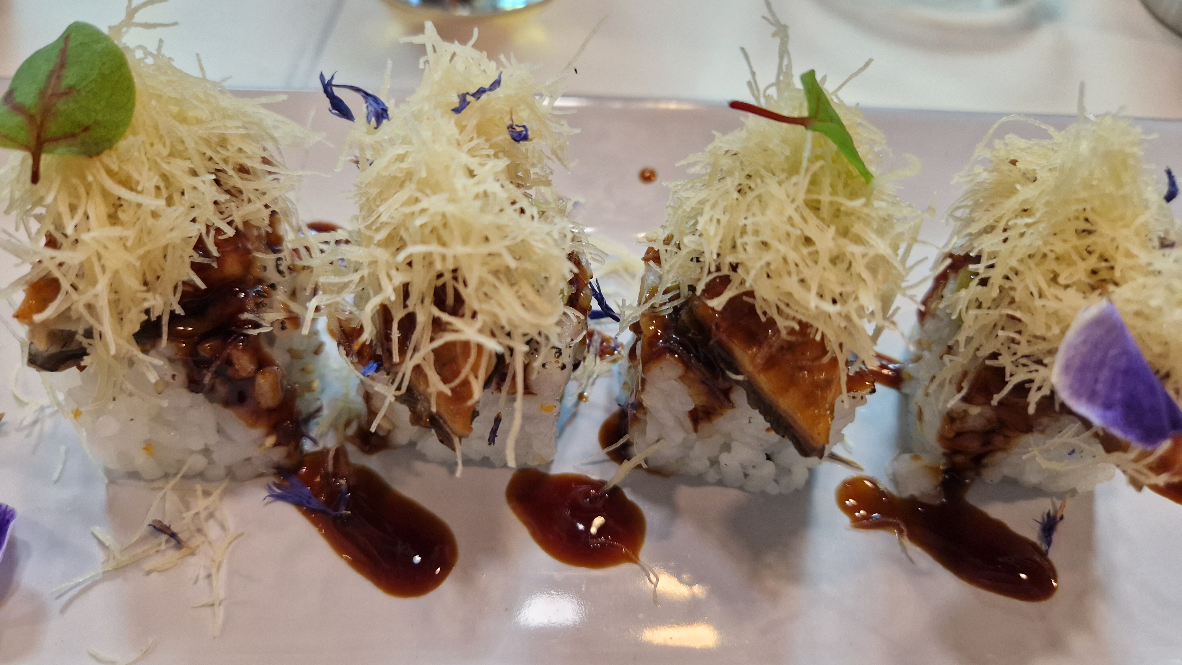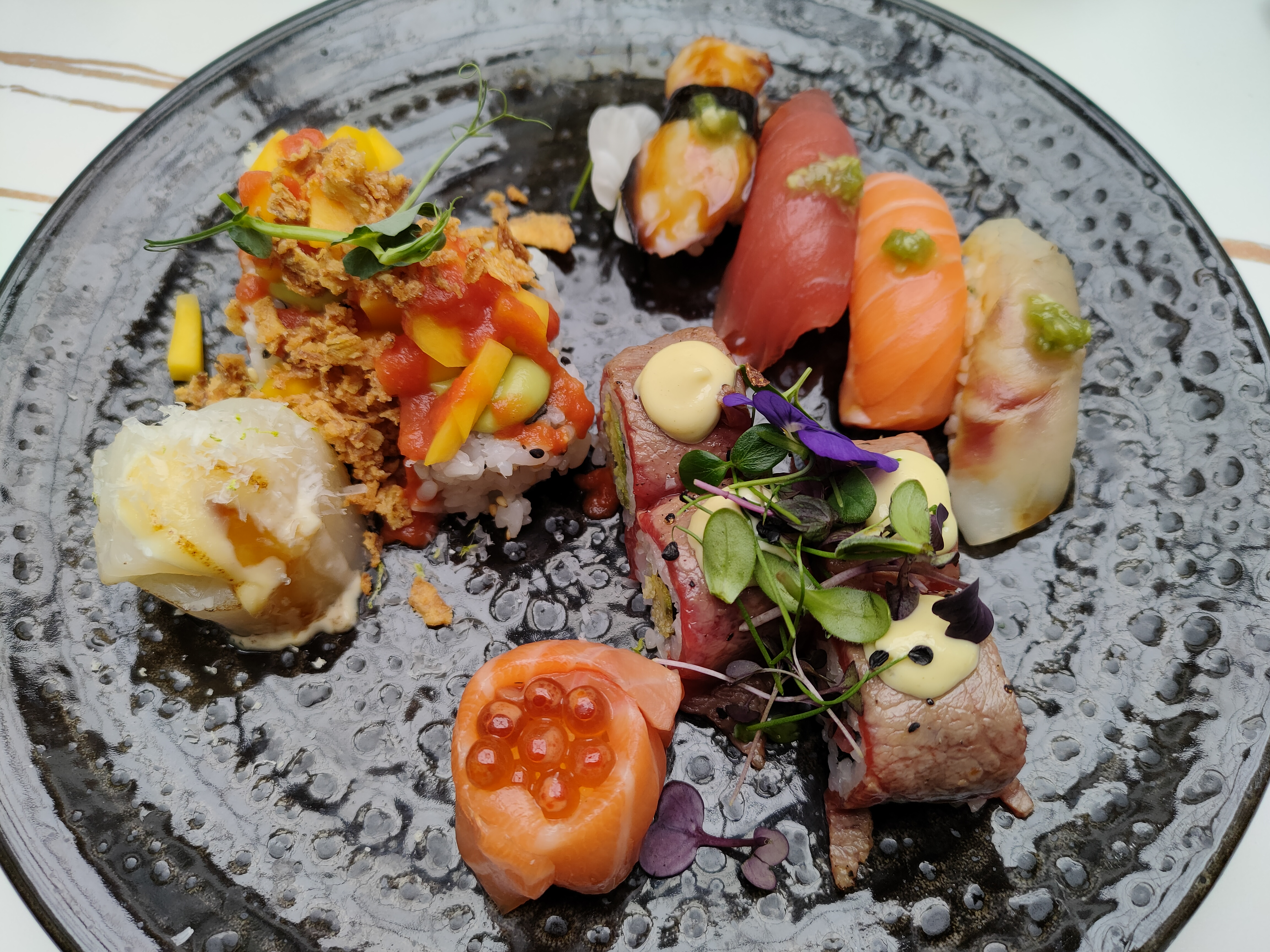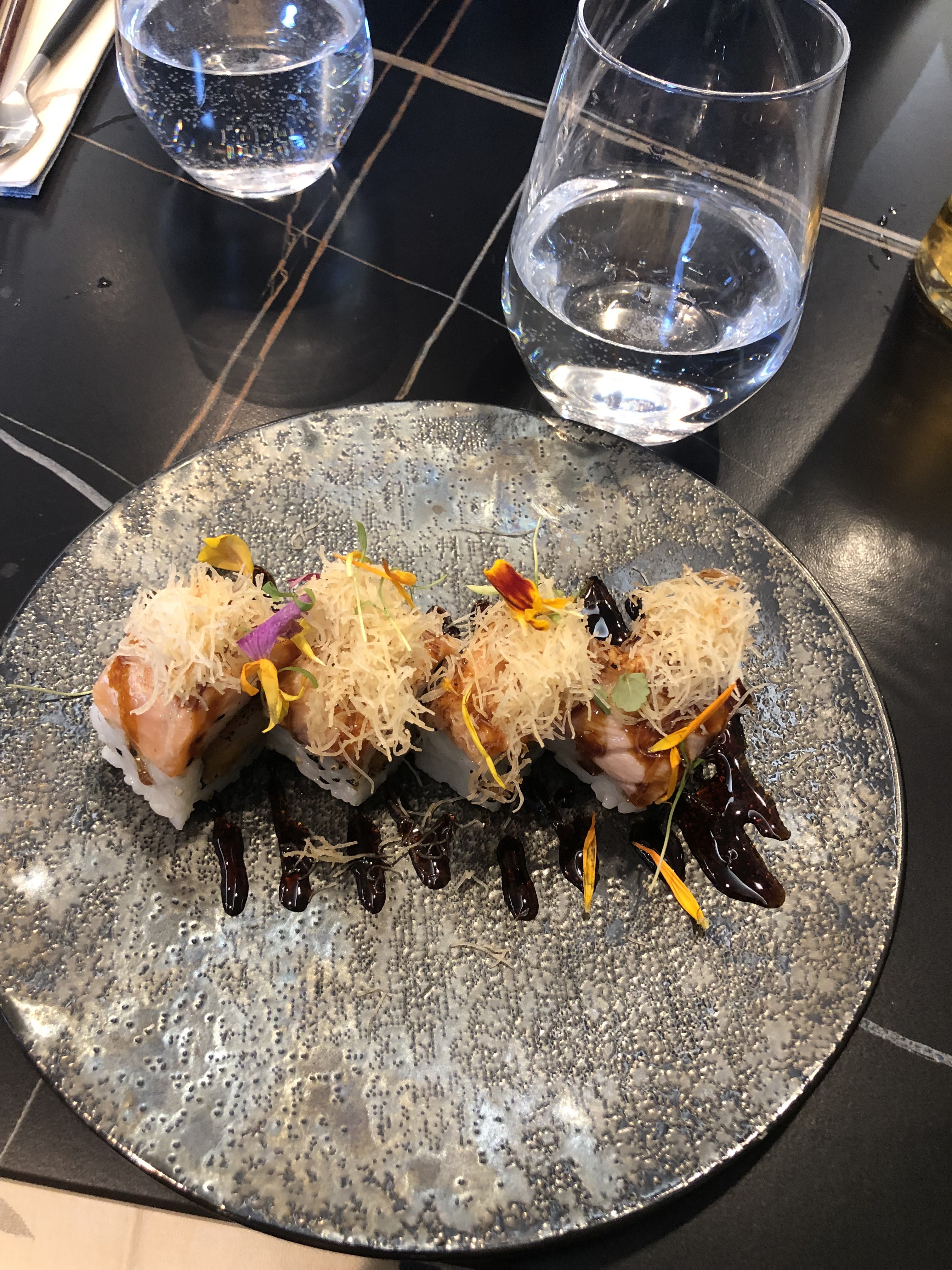 Top, dans l'assiette, ainsi que les serveurs(ses). Très beau restaurant, belle décoration. Produits frais, savoureux. Tarifs plus onéreux qu'un japonais traditionnel mais il s'agit d'un restaurant gastronomique fusion franco-japonais, les goûts parlent d'eux-mêmes. Merci.