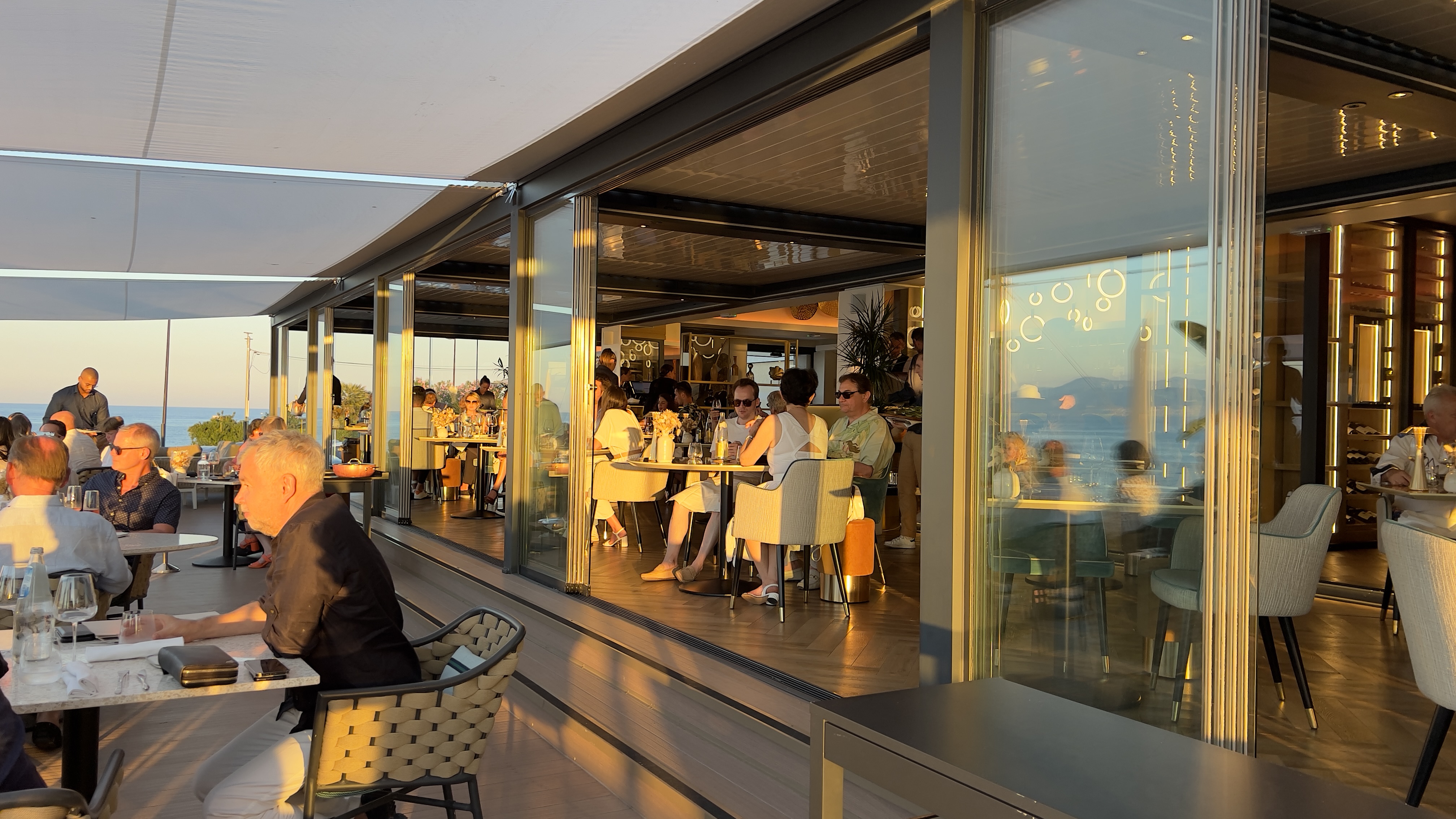 Le cadre on le connaît: la vue est enchanteresse et les travaux de rénovation assez réussis permettent d’en profiter parfaitement. Déçu par le service où les serveurs changent tout au long du repas et donnent l’impression de livrer plus que de réellement servir le client. Seul le Maitre d’hôtel apporte l’attention que l’on attend d’un lieu comme ça. C’est malheureusement un classique de nos jours sur la Côte d’Azur dans la plupart des restaurants. L’entrée était bonne avec des saveurs surprenantes mais quand on commande en plat principal un loup grillé « rosé à l’arête » et qu’on reçoit un loup trop cuit et on est forcément très déçu qui plus est à 250 euros la pièce…. Le verre de champagne commandé en attendant notre table nous sera offert gracieusement mais la déception est bien là. Il serait bien par ailleurs de faire respecter un dress code aux clients: à l’Eden Roc on refuse les clients qui se présentent en bermuda en soirée, ici on les accepte et c’est bien dommage. Un restaurant qui se veut élitiste (voiturier payant et tarifs des plats conséquents) devrait offrir un service et un environnement irréprochable.