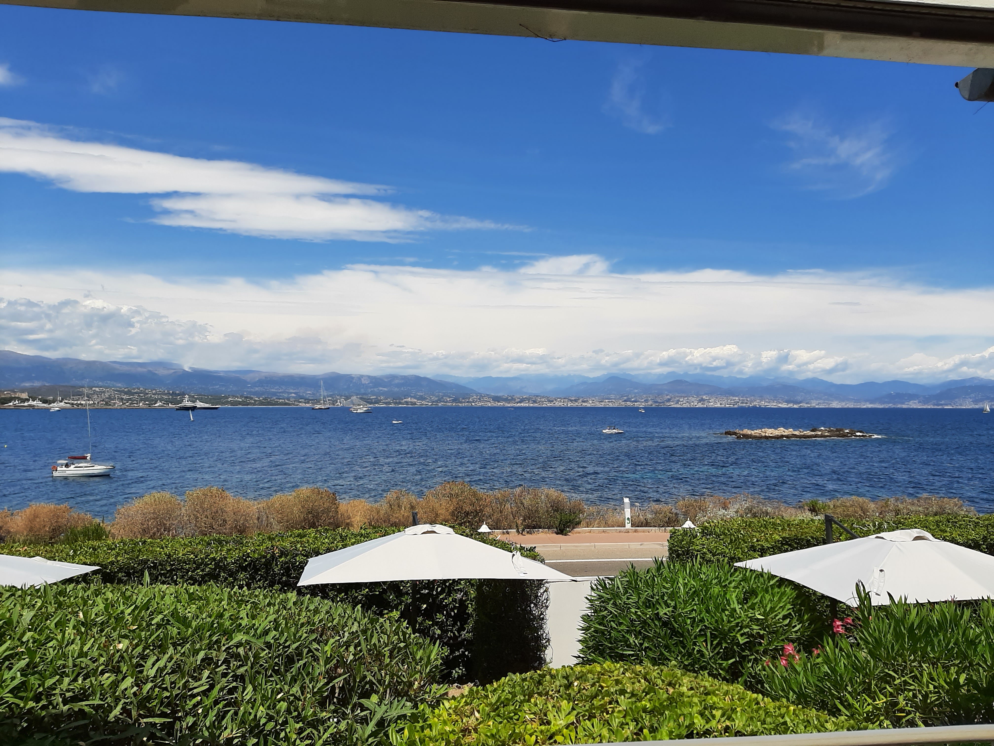 Vue époustouflante sur la mer et la Baie des Anges , les remparts du vieil Antibes, et les ilets de la Grande Grenille ! Très bon menu le midi !