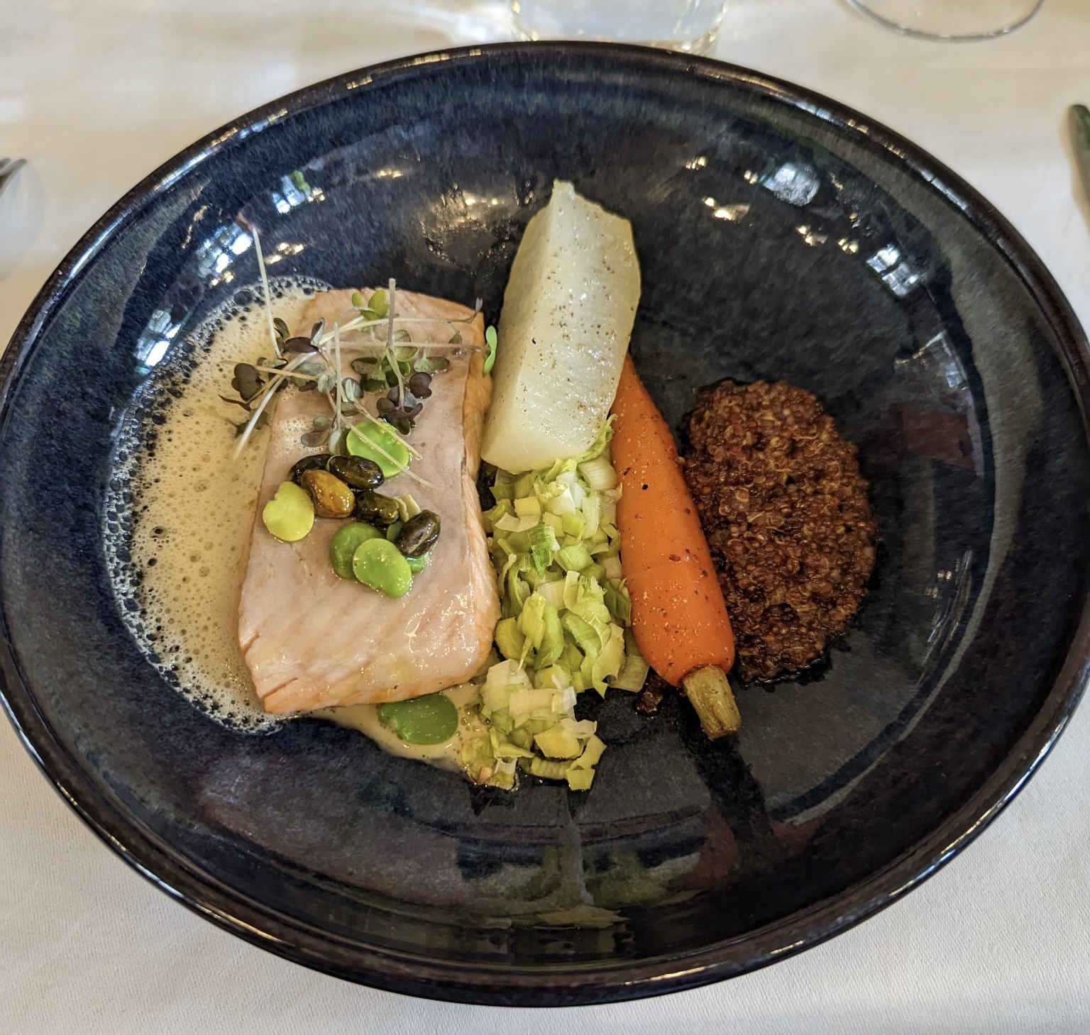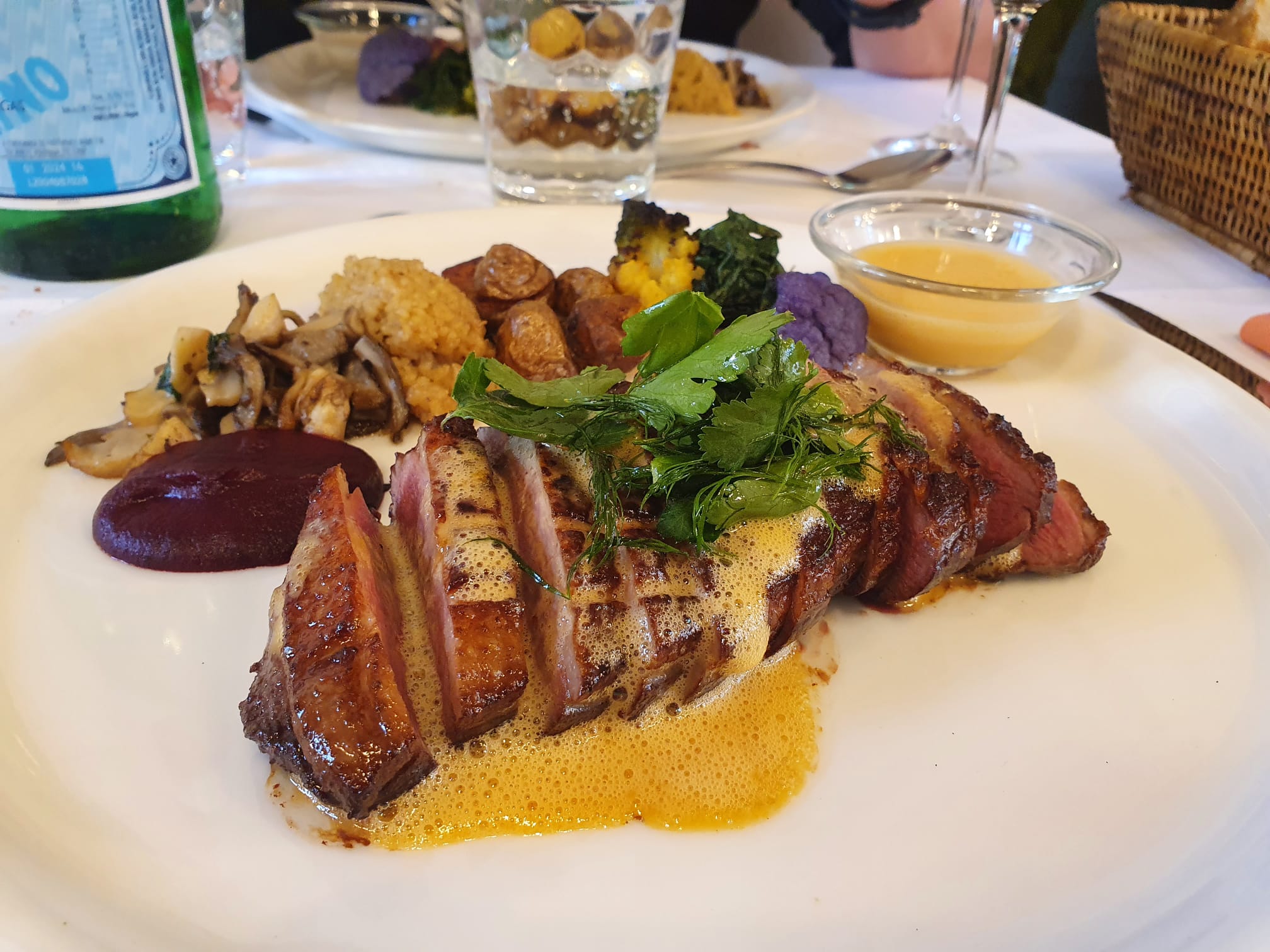 J'avais hâte d'y aller, je suis allé déjeuner. 32 € pour 2 plats, savoureux mais ce n'était que du poulet avec une sauce à la citronnelle. L'option végétarienne ne valait pas du tout le détour, des tranches de légumes nature grillées avec la même sauce et un petit pot de lentilles. Le service a bien commencé, mais lors du nettoyage de nos assiettes, les lentilles ont été renversées par le serveur, bien, mais elles n'ont jamais été nettoyées. Elle n'est jamais revenue, nous avons ensuite commandé du café, cette personne ne l'a pas nettoyé, la personne qui a apporté les cafés ne l'a pas nettoyé non plus. Une grosse cuillerée de lentilles grasses, que nous avons finalement dû recouvrir avec les serviettes en tissu car cela attirait les guêpes. Je pensais que c'était un endroit haut de gamme, c'est basique. Avec 2 boissons gazeuses et un verre de vin, c'était 52 € chacun, malheureusement cela n'en valait pas la peine à la fin. Je n'y retournerais pas et je ne le recommanderais pas