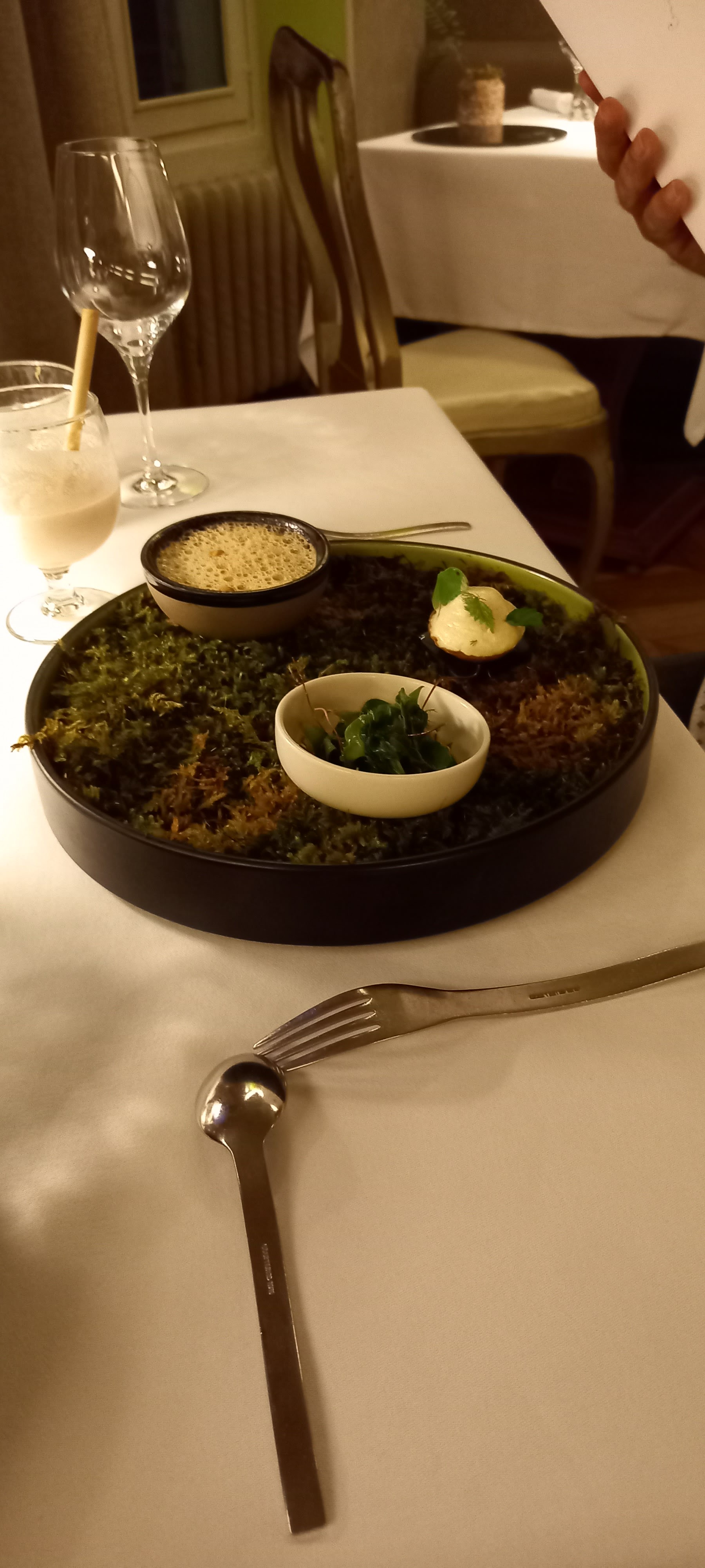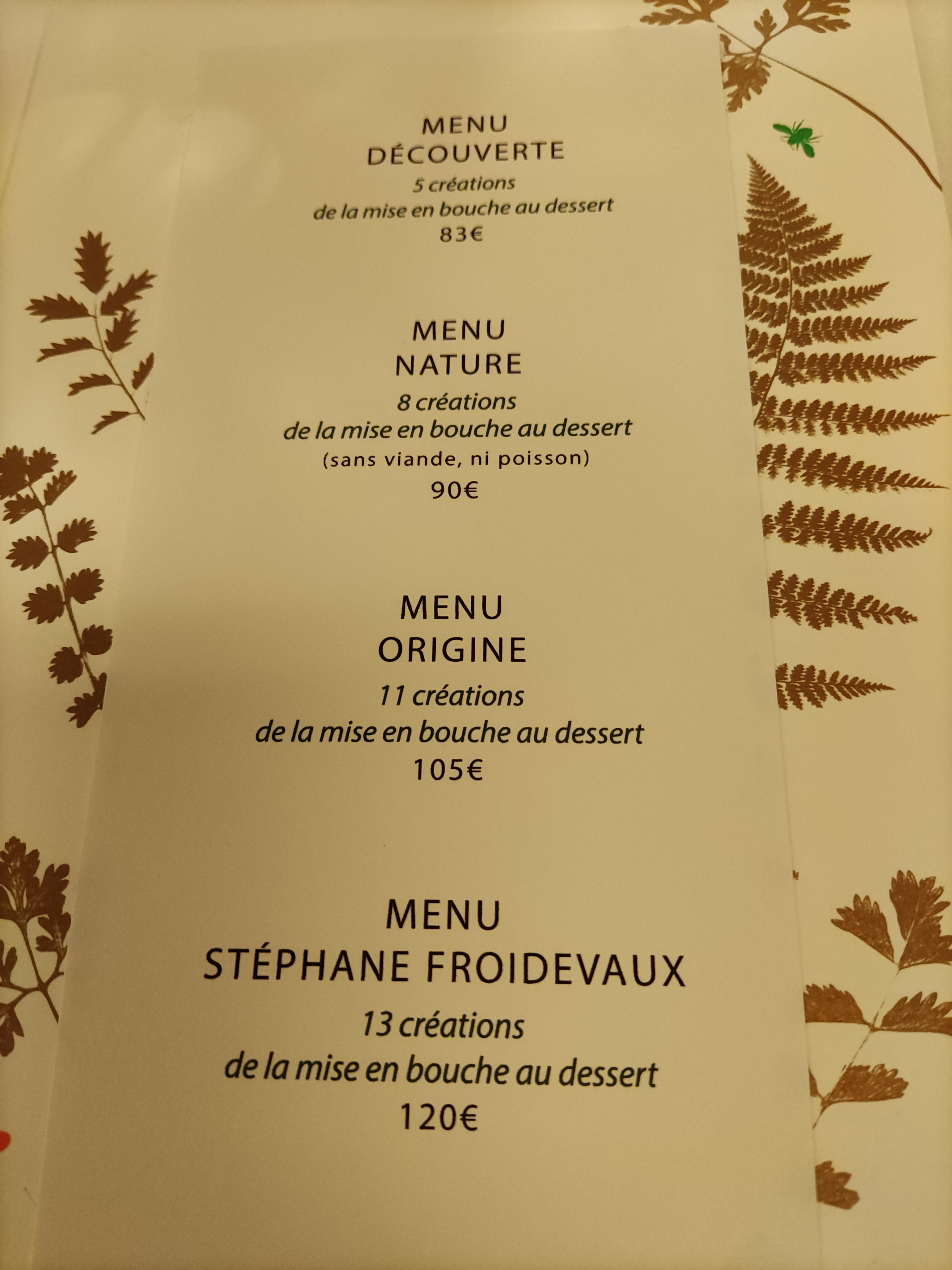 Mon premier étoilé ! alors peu de comparaison mais nous avons passé un agréable moment, la maison de maître est vraiment charmante. Nous avons opté pour le menu Stéphane Froidevaux donc le plus haut de gamme et c'était une belle découverte. Le chef a recherché de l'originalité dans la présentation de ces plats (bois, pierre, feuillage ...) on adore les surprises. Sur les points qui nous ont moins séduit c'est l'absence d'un menu accord mets/vins, on a du choisir un vin pour tout le menu sans pouvoir jouer l'association parfaite. Et le second point qui nous a moins plu porte sur l'utilisation de l'acidité dans les plats du chef, sur 12 mets 7 à 8 mets comportaient une base acide. Même si l'acide en cuisine, j'adore et que cela réhausse les plats, nous avons trouvé que l'équilibre n'y était pas là. Nous découvrirons d'autres tables étoilées dans l'avenir et pourrons comparer ! Belle découverte à vous.