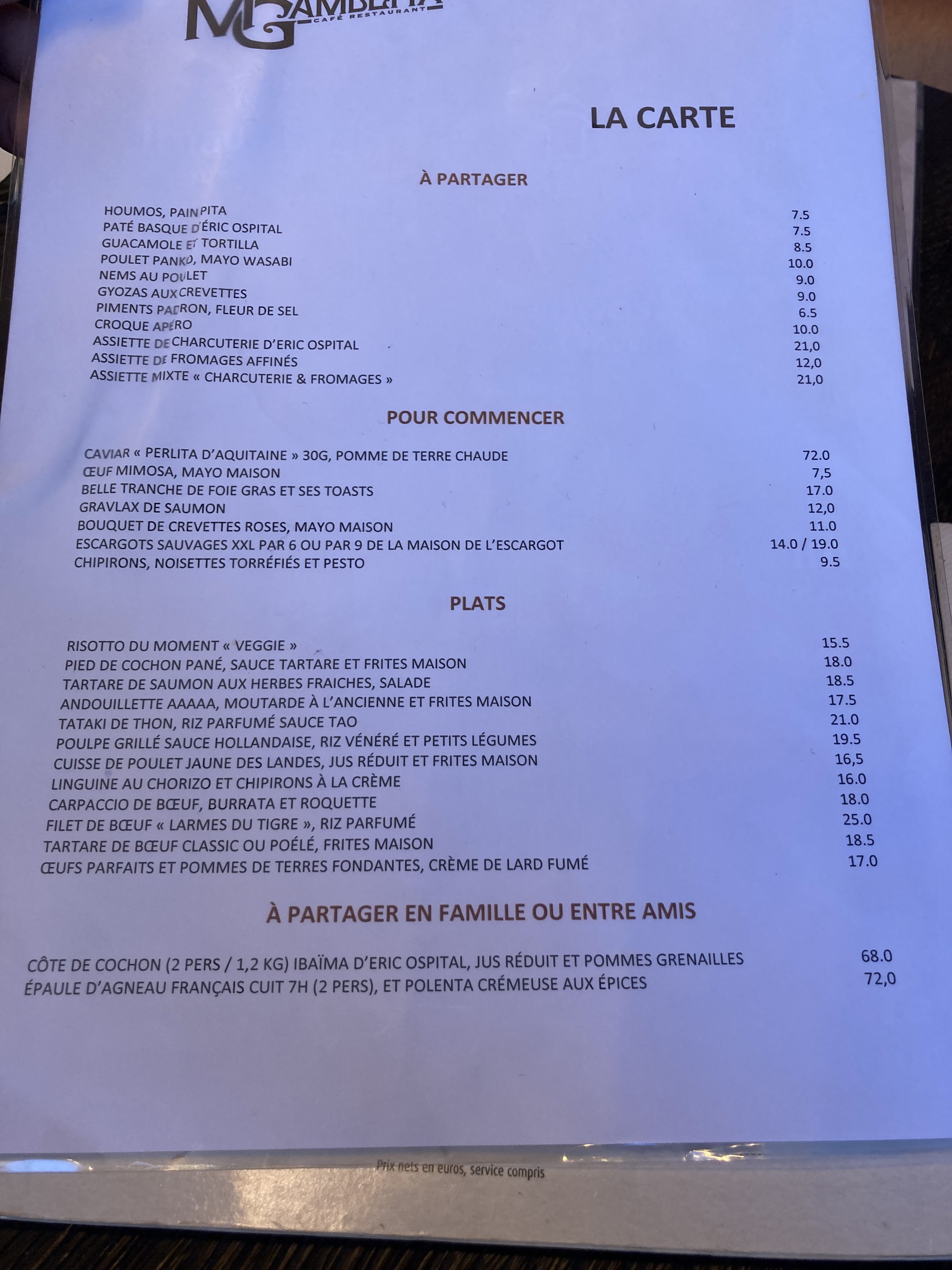 Changement de carte. Très déçue. Prix prohibitifs. A revoir l’état des toilettes. Nettoyage à revoir Pas de savon disponible pour un restaurant cela pourrait laisser penser à un manque d’hygiène. Service rien à dire serveuse sympathique