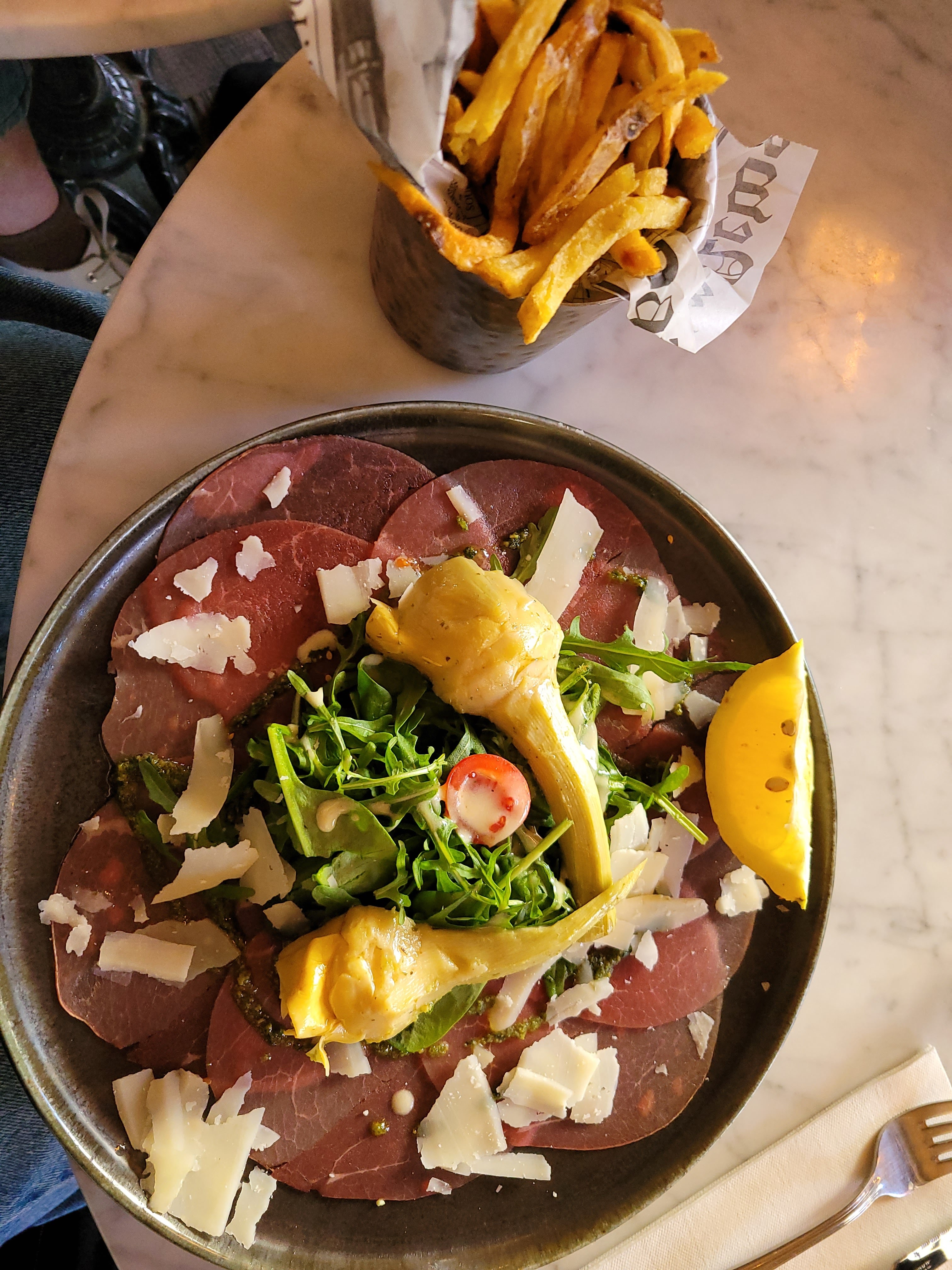 Très belle découverte. Nous y sommes déjà passés plusieurs fois pour prendre un café et là nous avons décidé de franchir le pas d'y manger. Ambiance très sympa, type bistro parisien mêlé à une atmosphère des tavernes anglaises. Options végétariennes très appréciées. Le tataki de thon était juste divin, à couper à la fourchette. Un régal. Pour l'apéro, l'assiette de fromage est plus que généreuse. Au niveau du service, c'était très bien. De jeunes petites serveuses étaient bien veillantes et se donnaient comme il faut pour satisfaire la clientèle. Nous reviendrons sans hésiter.