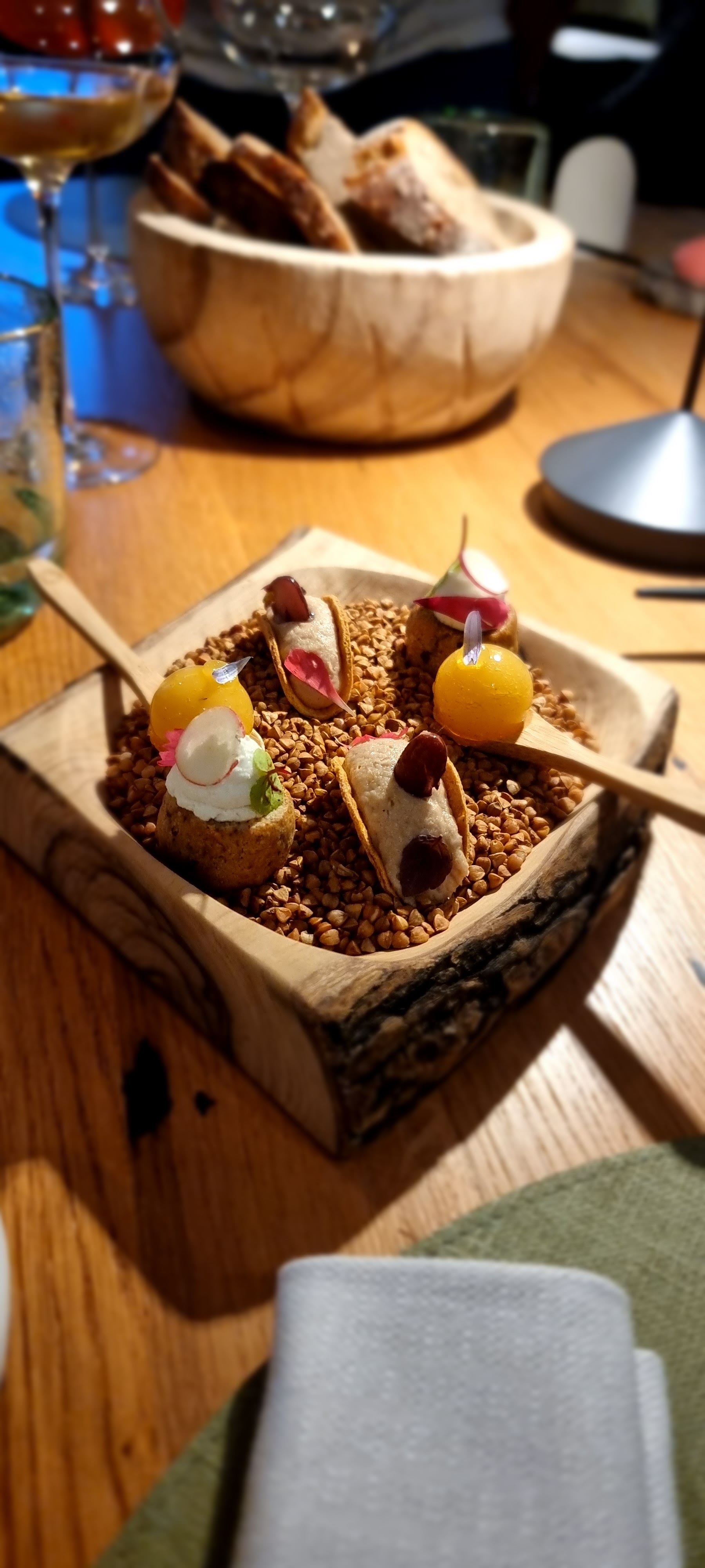 Dîner en 5 plats Un vrai délice que ce sois pour les yeux ou pour les papilles Seul bémol, l'insistance des 3 serveurs pour que l’on prenne du vin. Entre chaque plat la même question x3, cela fait un peu vente forcer .. mais le reste est top