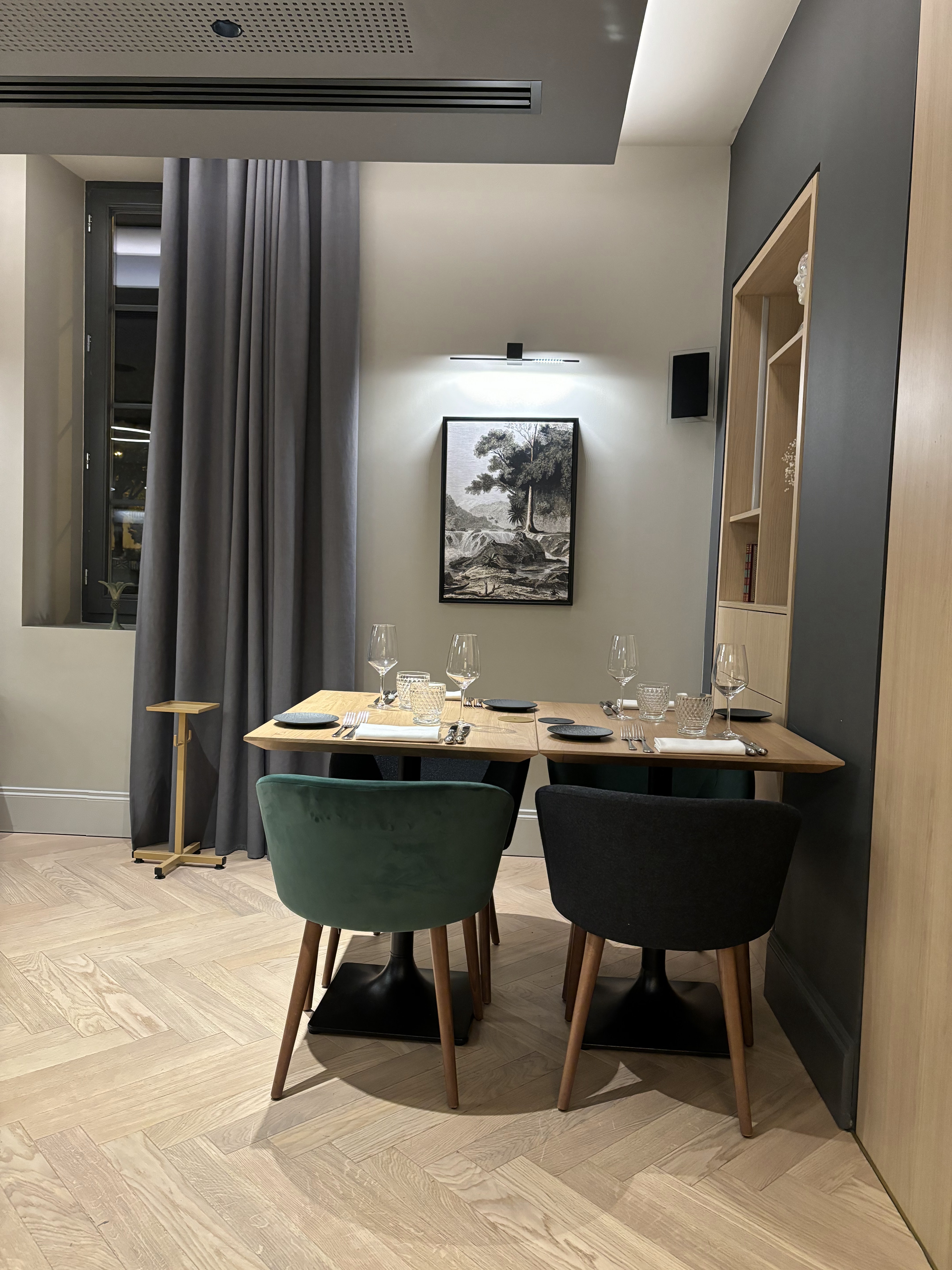 Ce restaurant est vraiment très beau niveau déco et mobilier, une machine est à notre disposition à l'entrée pour nettoyer nos mains ! J'ai trouvé ça vraiment super ! L'accueil et le service était vraiment au top les serveurs sont très agréables ! J'enlève tout de même une étoile car : - les plat manquer de saveur et étaient trop salé.. dommage pour le prix. Et je me suis fait avoir sur les renseignements des menus sur internet.. effectivement je suis venue un soir pensant prendre le menu entrée et plat qui est proposé mais en arrivant sur place j'ai vu que cette formule n'était disponible que le midi. Donc attention le soir il n'y a que la formule entrez plat et dessert