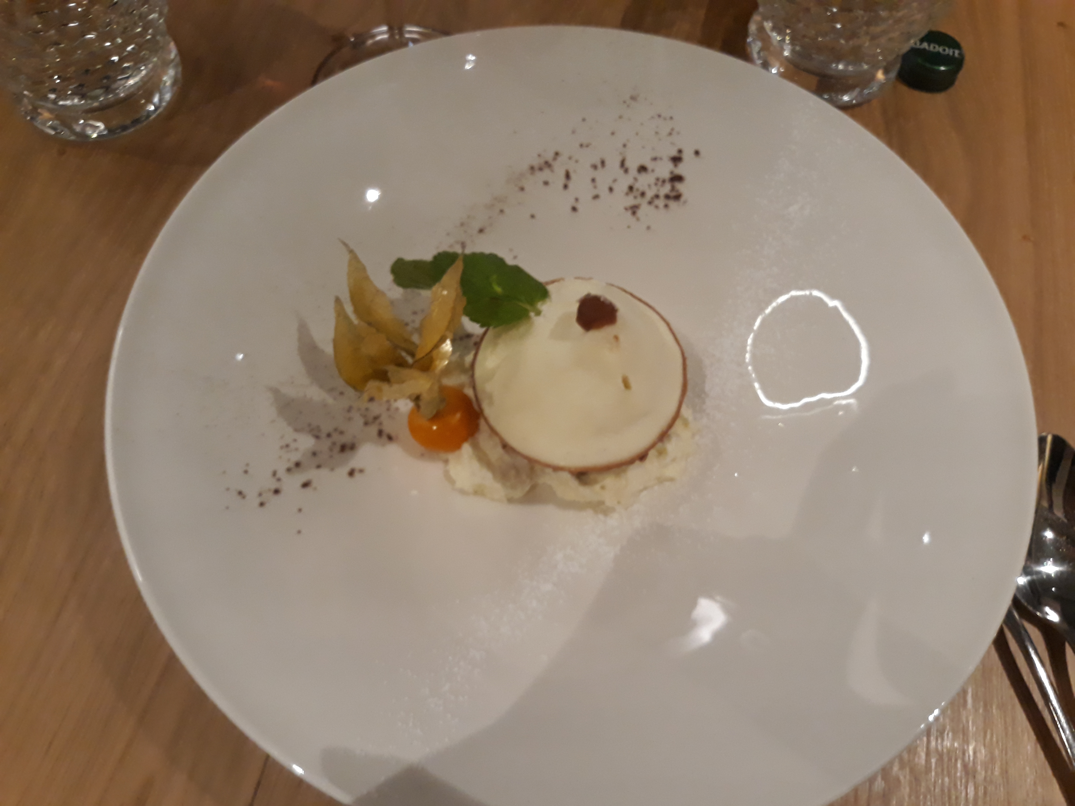La qualité des mets était bien là mais la quantité de ce que nous avions dans l'assiette nous a laissés pantois. Le plat à la carte était une jambonnette de chapon accompagnée de gratin dauphinois et de cardons. En guise de gratin, 2 rondelles de pommes de terre et deux morceaux de cardon !!! Pour une entrée pourquoi pas mais en tant que plat principal....... Par ailleurs, les plats nous ont été servis alors même que nous n'avions pas terminé notre coupe de champagne et le verre de vin nous a été apporté une fois les plats terminés..... Le dessert quant à lui reste exceptionnel, qu'il s'agisse du Mont Blanc ou de la bûchette à la clémentine.