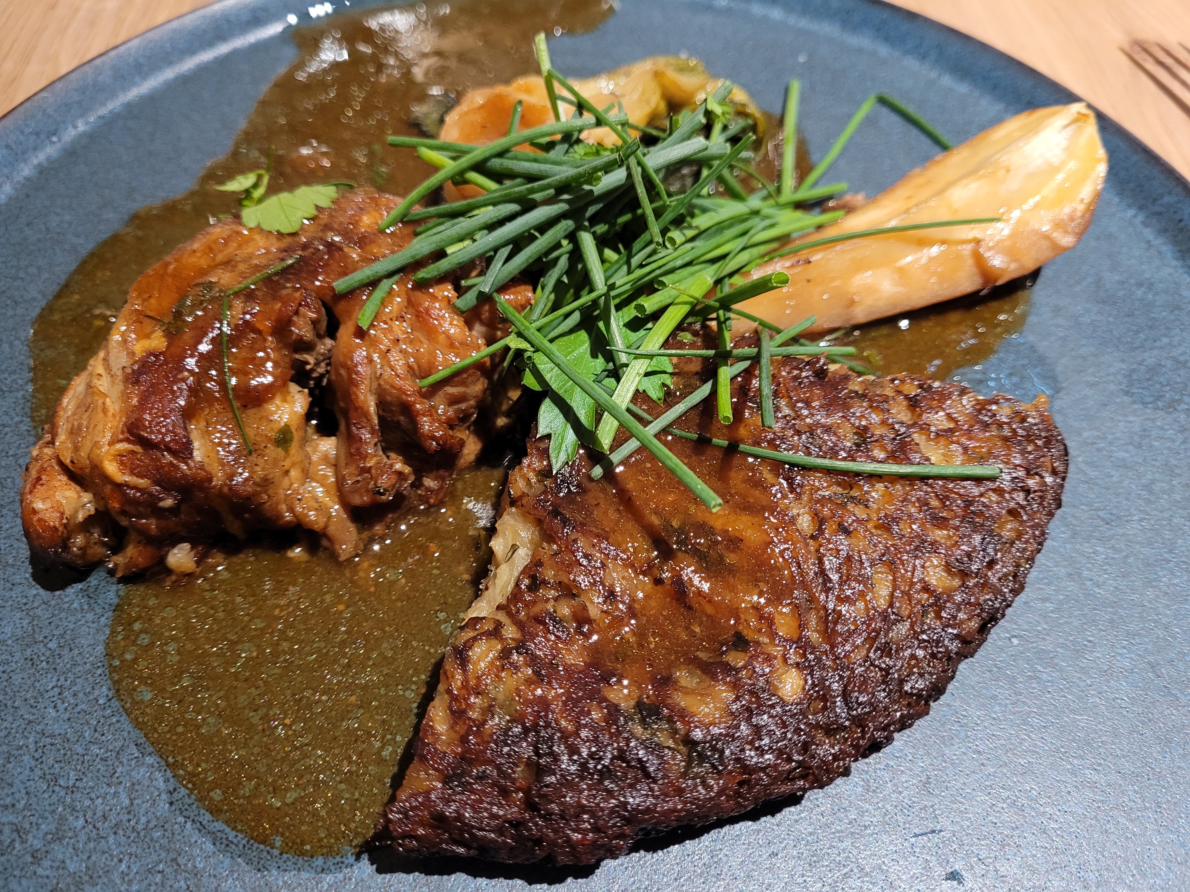 Très bonne expérience avec un accueil et un service impeccable dans un cadre bien décoré un peu décalé/contemporain (bonus pour la lampe lièvre). Grande sélection de vin (cave) mais rien n’obligera à casser votre tirelire, la sélection au verre est déjà très bonne. Une carte qui donne envie de tout goûter et des desserts raffinés et travaillés. Les quantités sont ajustées pour profiter du menu entrée + plat + dessert. Peut être un gros mangeur en voudrait en peu plus ? Nous avons passé un très bon moment , Il n’est pas exclu que nous repassions pour tester la prochaine carte.