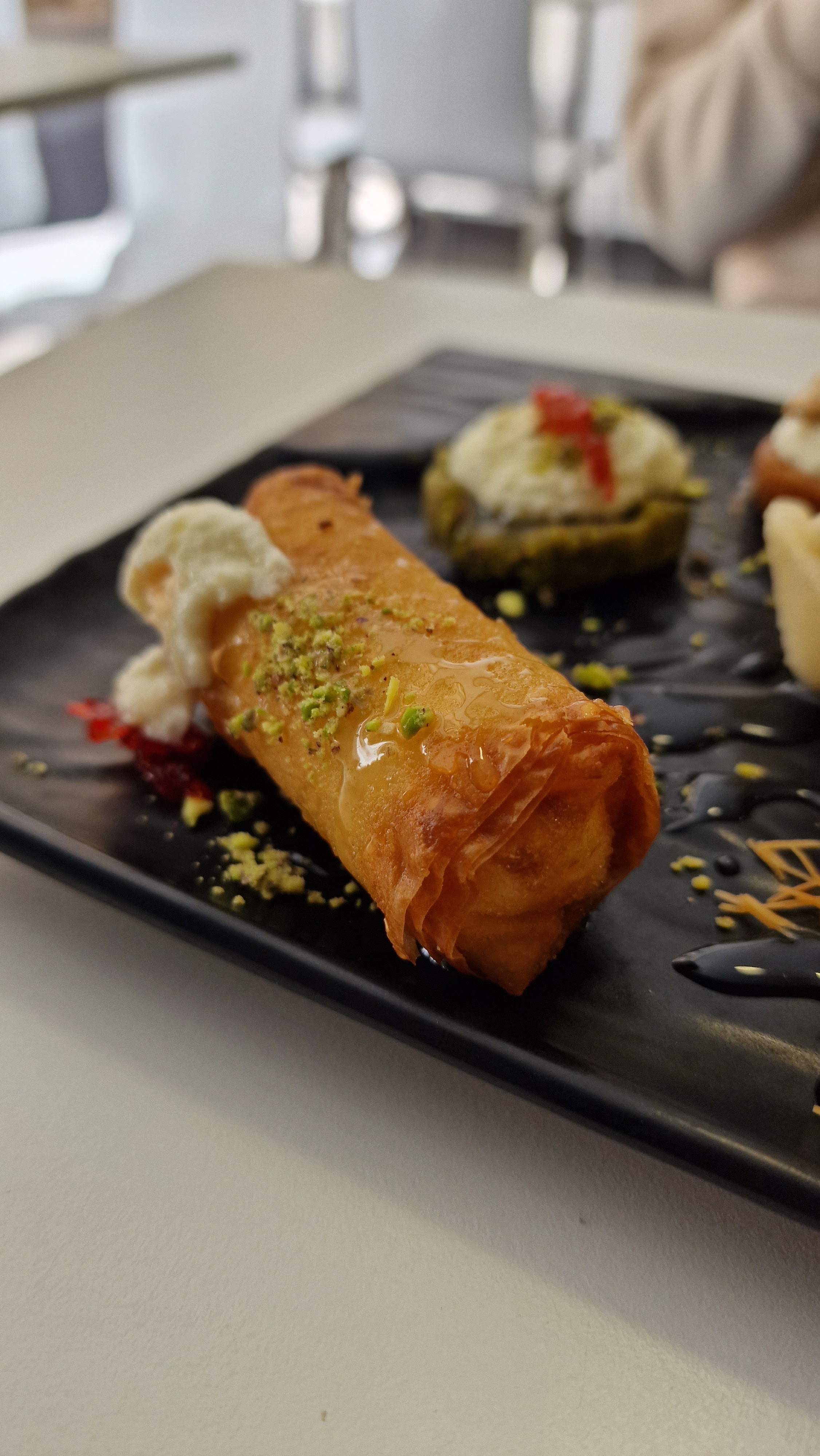 Nous sommes passés main dans la main pour entrer. Nous avons été accueillis par le propriétaire qui a été extrêmement serviable et poli, nous expliquant la grande variété de friandises (pas seulement) disponibles. Nous avons eu une tranche de knafa et des baklava qui étaient incroyables ! Recommande fortement!!