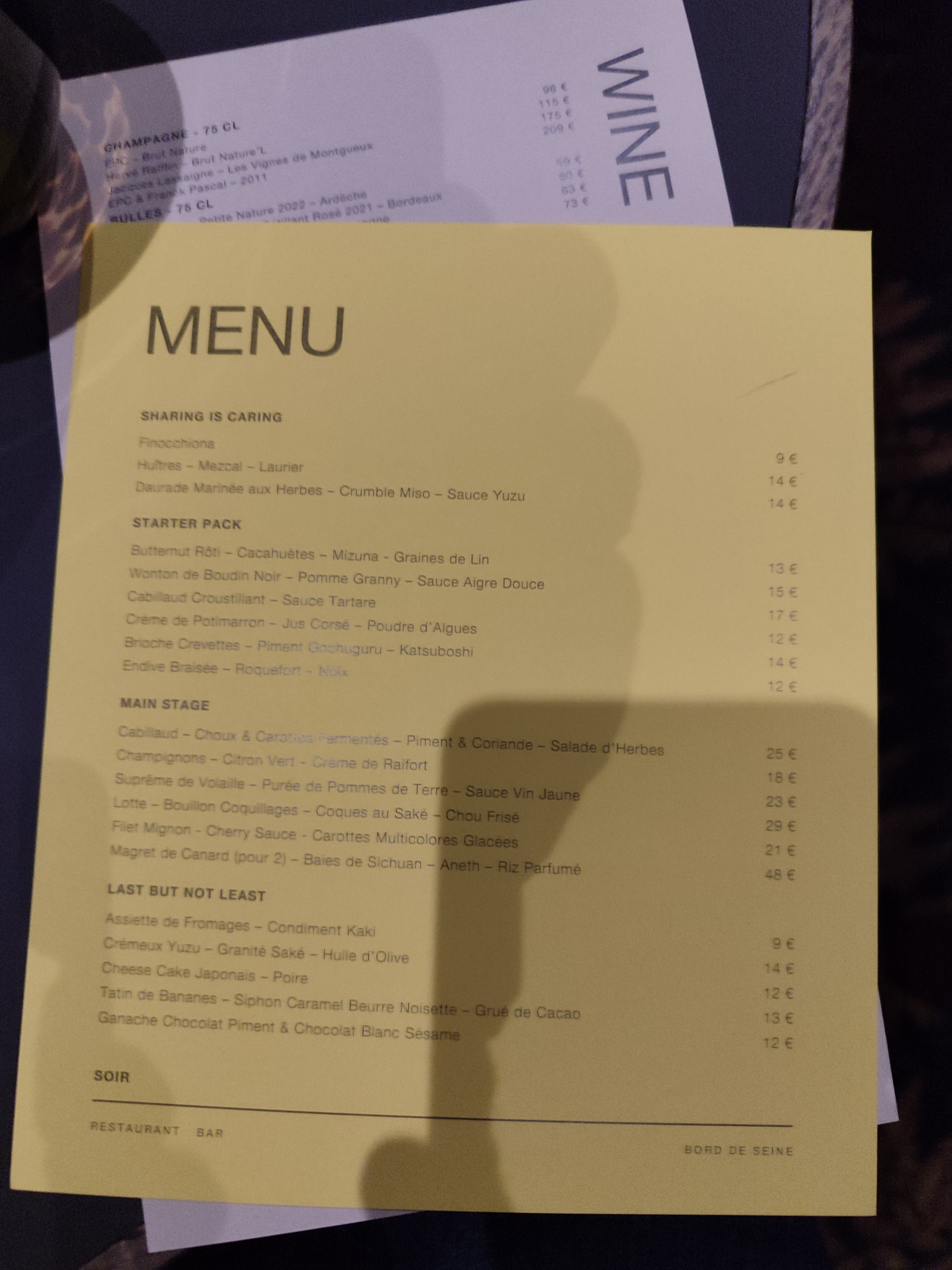 Belle soirée, la péniche est chaleureuse, l’espace est bien utilisé et laisse de l’intimité à chaque table. Côté assiette, belle recherche de saveurs et jolie inspiration japonaise. L’opportunité de partager les entrées est sympathique et permet de goûter à plusieurs choix. On termine sur un feu d’artifice des desserts qui sont parfaits, le crémeux de yuzu délicatement acidulé et la ganache chocolat à tomber! Merci pour cette belle harmonie et le service discret et efficace.