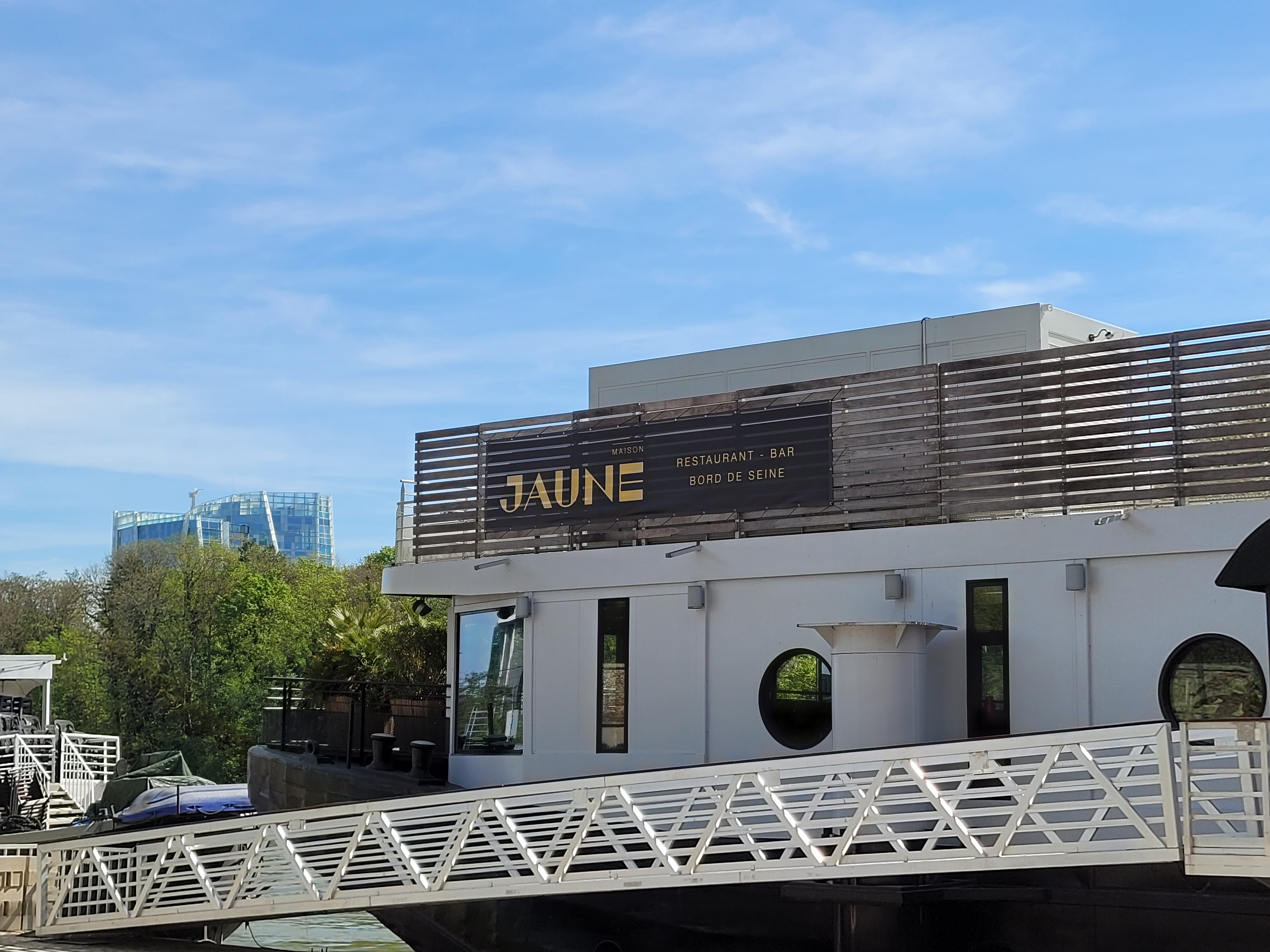 Un restaurant barge avec une vue époustouflante. Carte bistronomique et belle carte des vins. Vivement cet été et la terrasse qui surplombe la Seine face à l’île saint germain.