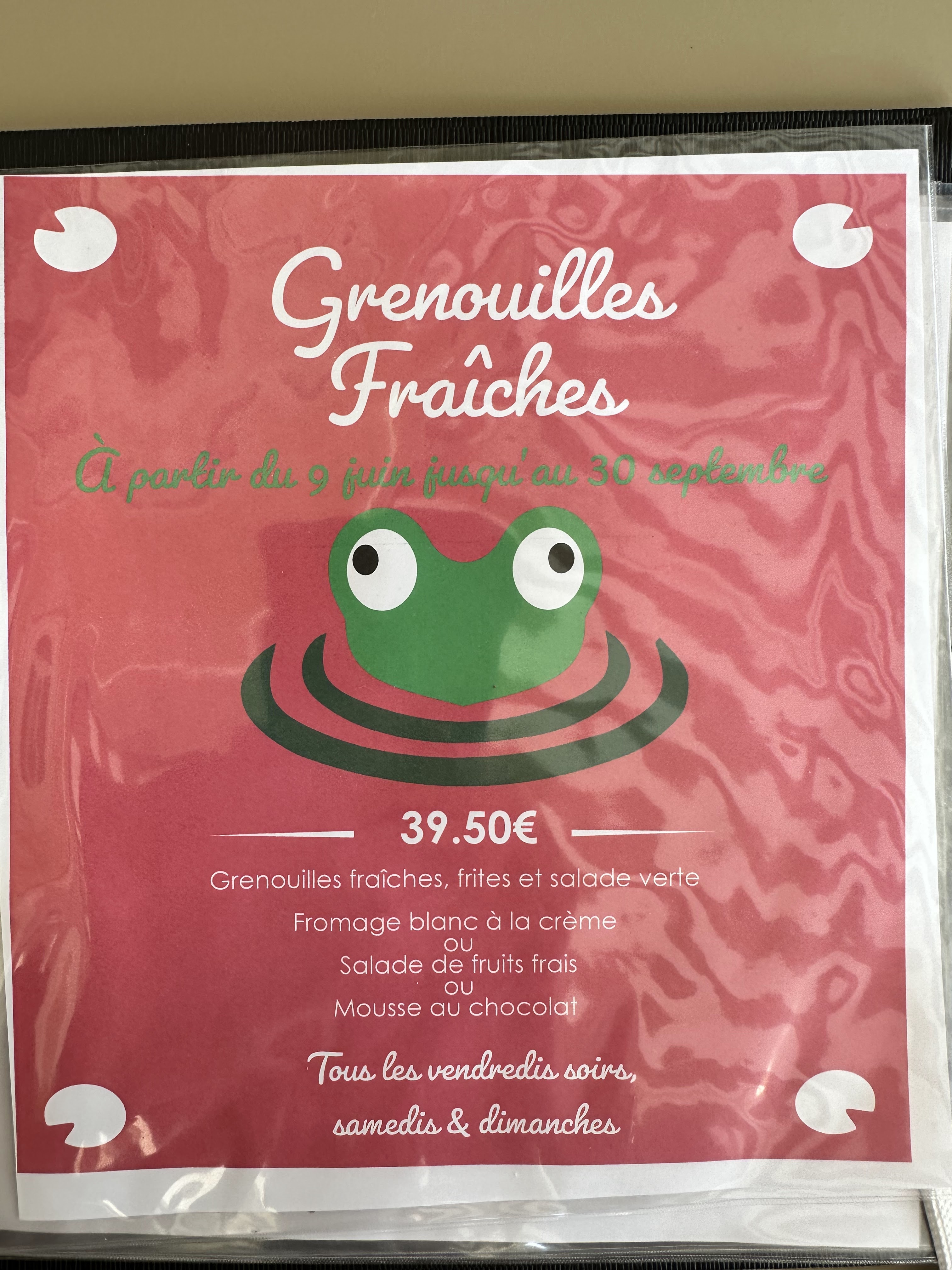 Le cadre est super mais le rapport qualité/prix ne me paraît pas très correct. (38 euros pour un menu avec une assiette de grenouille et un dessert, je trouve cela cher...). Nous y avons été un dimanche, donc le menu le moins coûteux n'était pas disponible. Peut-être que cela vaut plus le coup de venir en semaine. Par contre, bravo aux serveurs qui sont très agréables et rapides vu le monde présent.