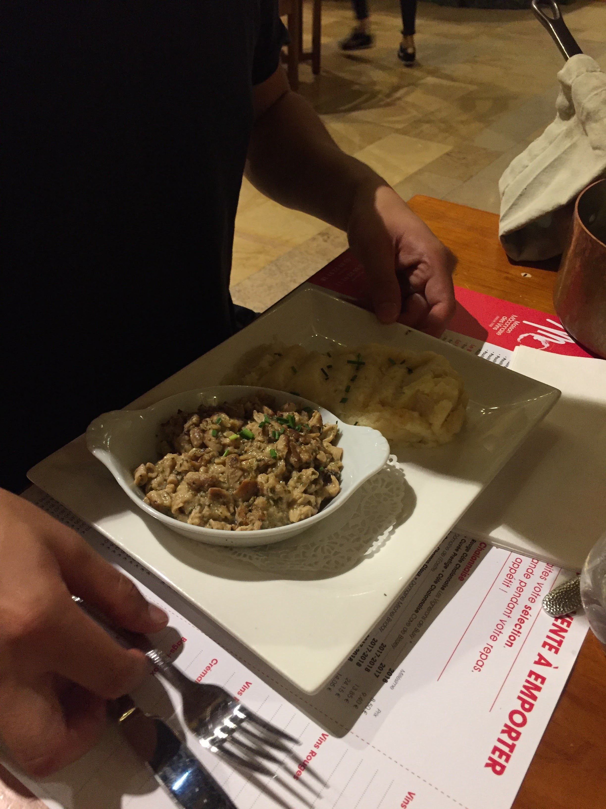 Repas très bon entrée...vol au vent de ris de veau super....et chaude ...souris d agneau bien aussi ...petite ratatouille peu chaude ...mon mari 1 peu froid ...les autres légumes bien ...le dessert bien ...c était le menu fêtes des mères...la musique 1 peu trop forte....l orgue de barbarie ...