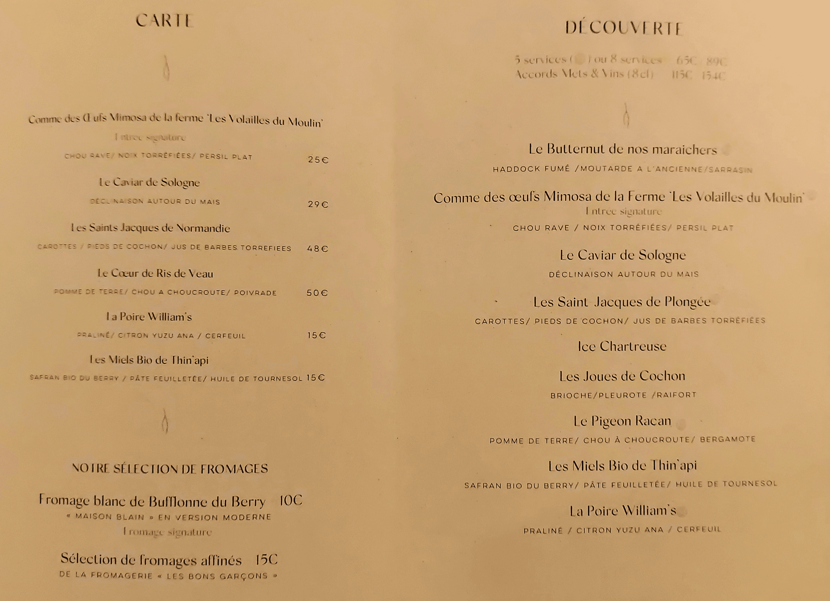 Personnels discrets, professionnels et très agréables. Les plats délicieux et tous ces mélanges à découvrir…très sympa, décoration admirable vaisselle dans des supports différents et de très bon goût (Pillivuyt de Mehun). Un très bon môme pour mes 80 ans.