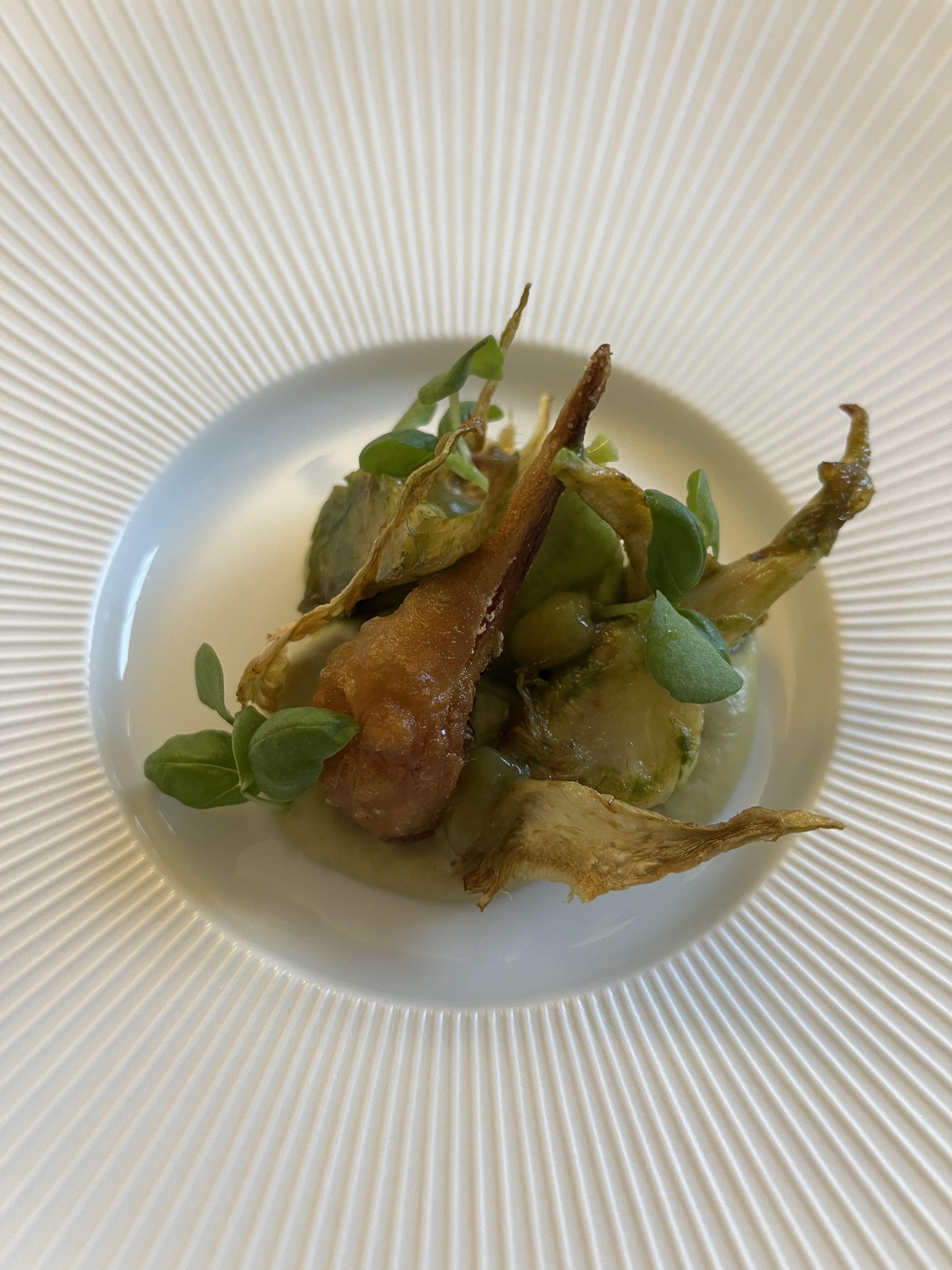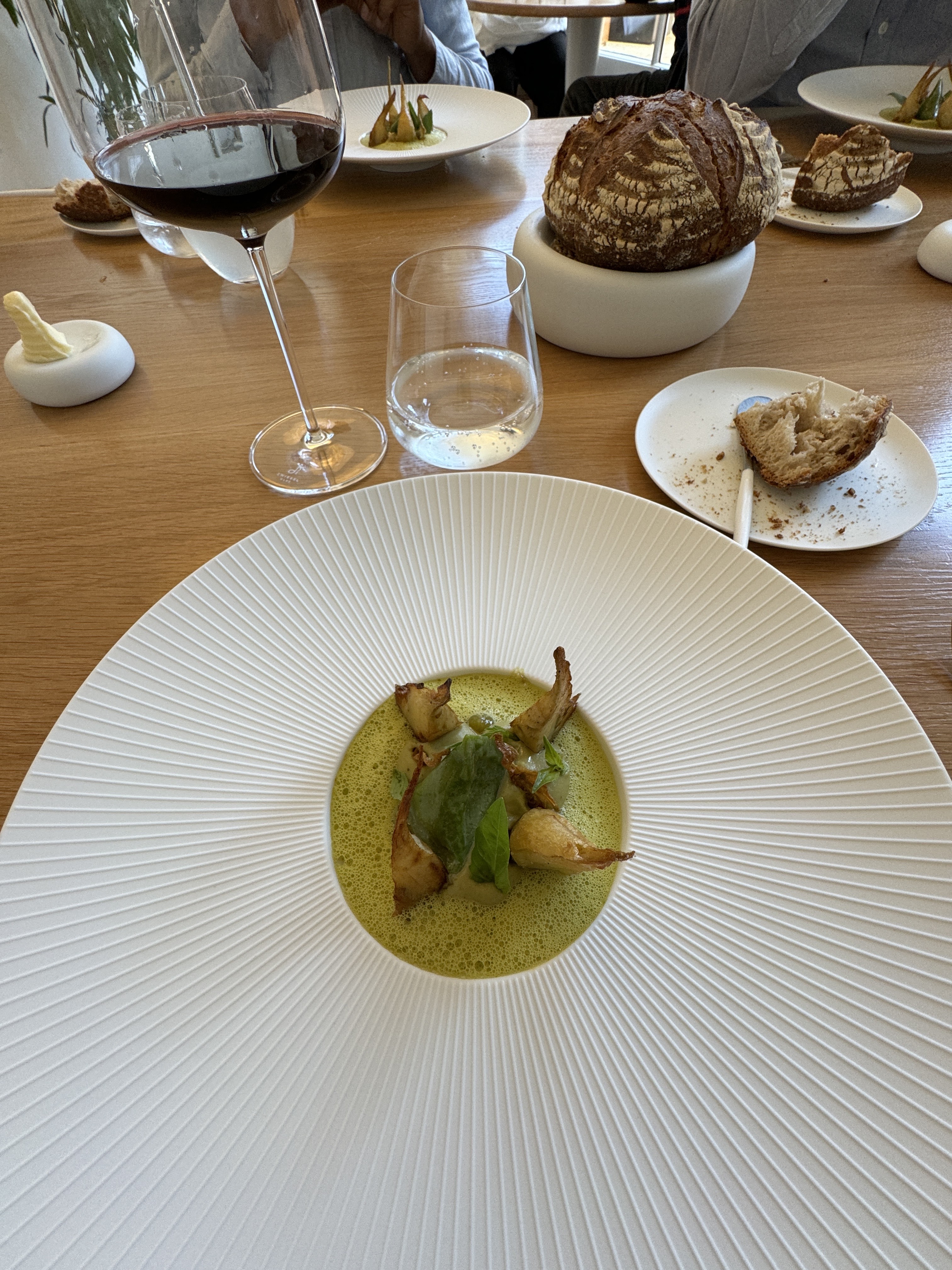Dans ce lieu tout blanc, épuré, au service impeccable, cuisine de produits frais travaillés en texture et goûts. Le goût est là, le plat avec les artichauts en était très réussi, mention spéciale pour le fromage révisité Chaque plat nous est bien expliqué. Merci au chef d être passé à chaque table nous parler de son travail. Je recommande.