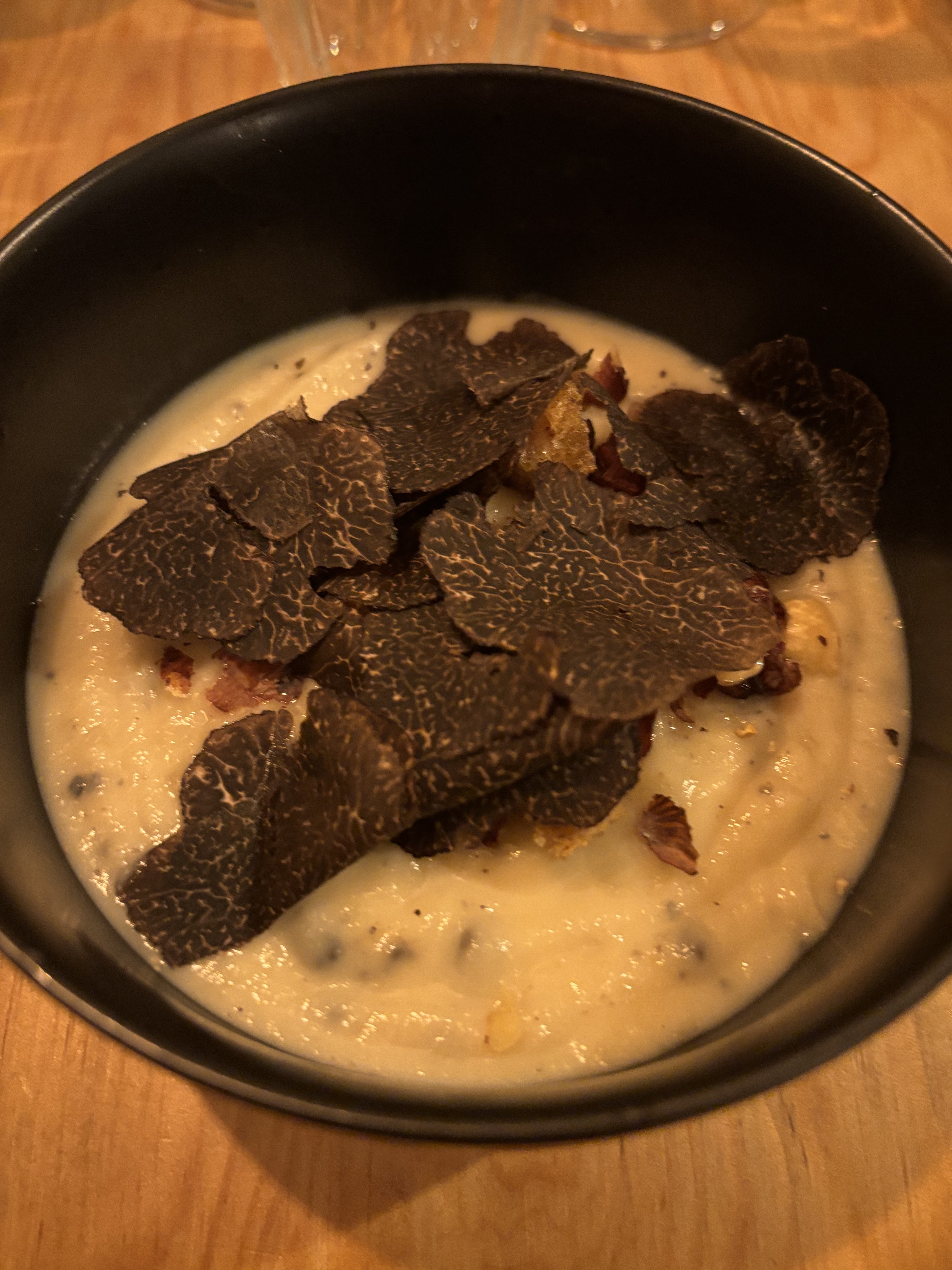 Nourriture bonne mais un peu chère pour le portionnement. Mon filet de porc était majoritairement gras, savoureux, mais décevant. Le poulpe avait l'air délicieux et mon partenaire aimait le tartare. Quand la nuit tombe, les lampadaires s’allument, compromettant l’atmosphère.