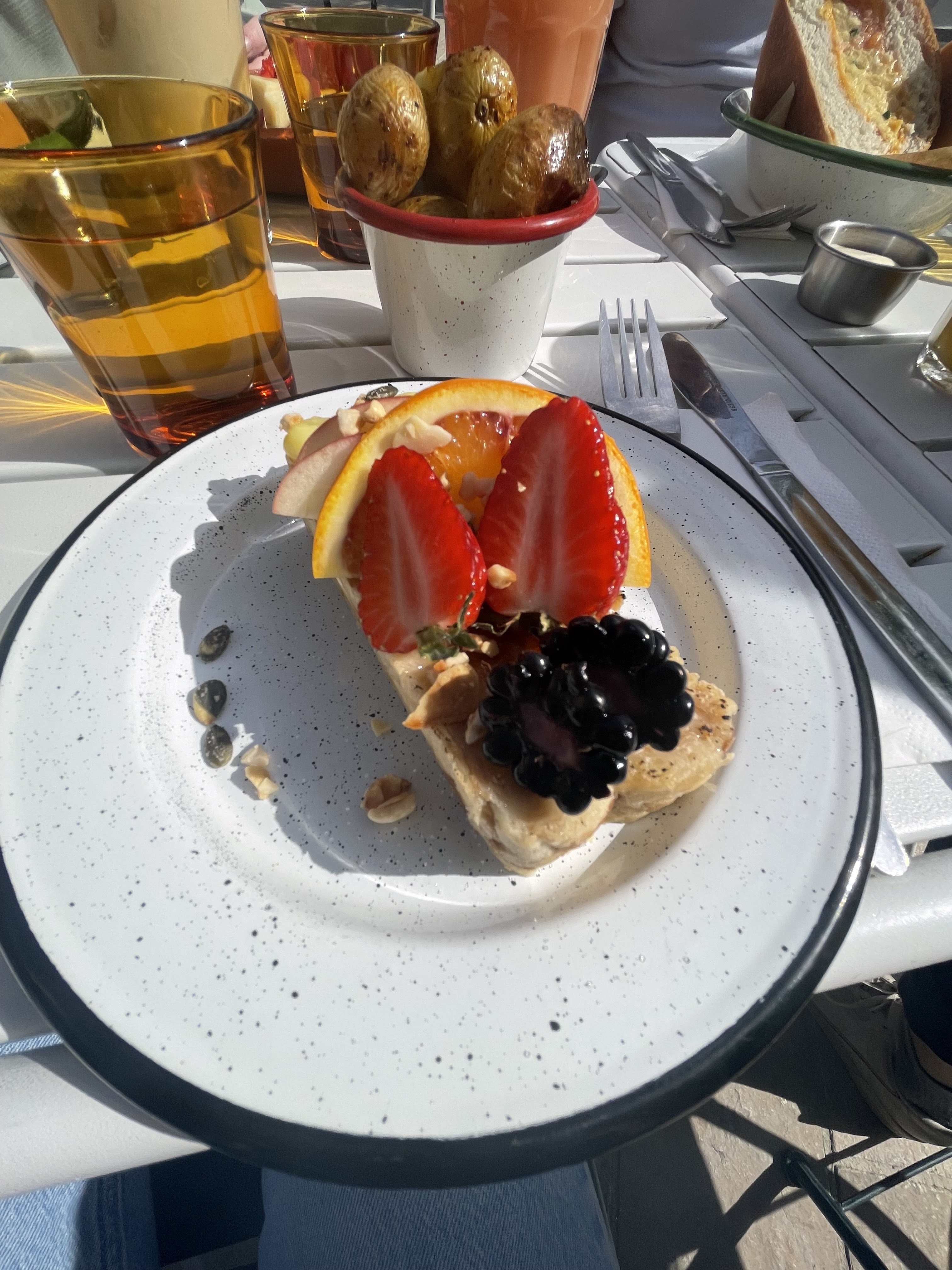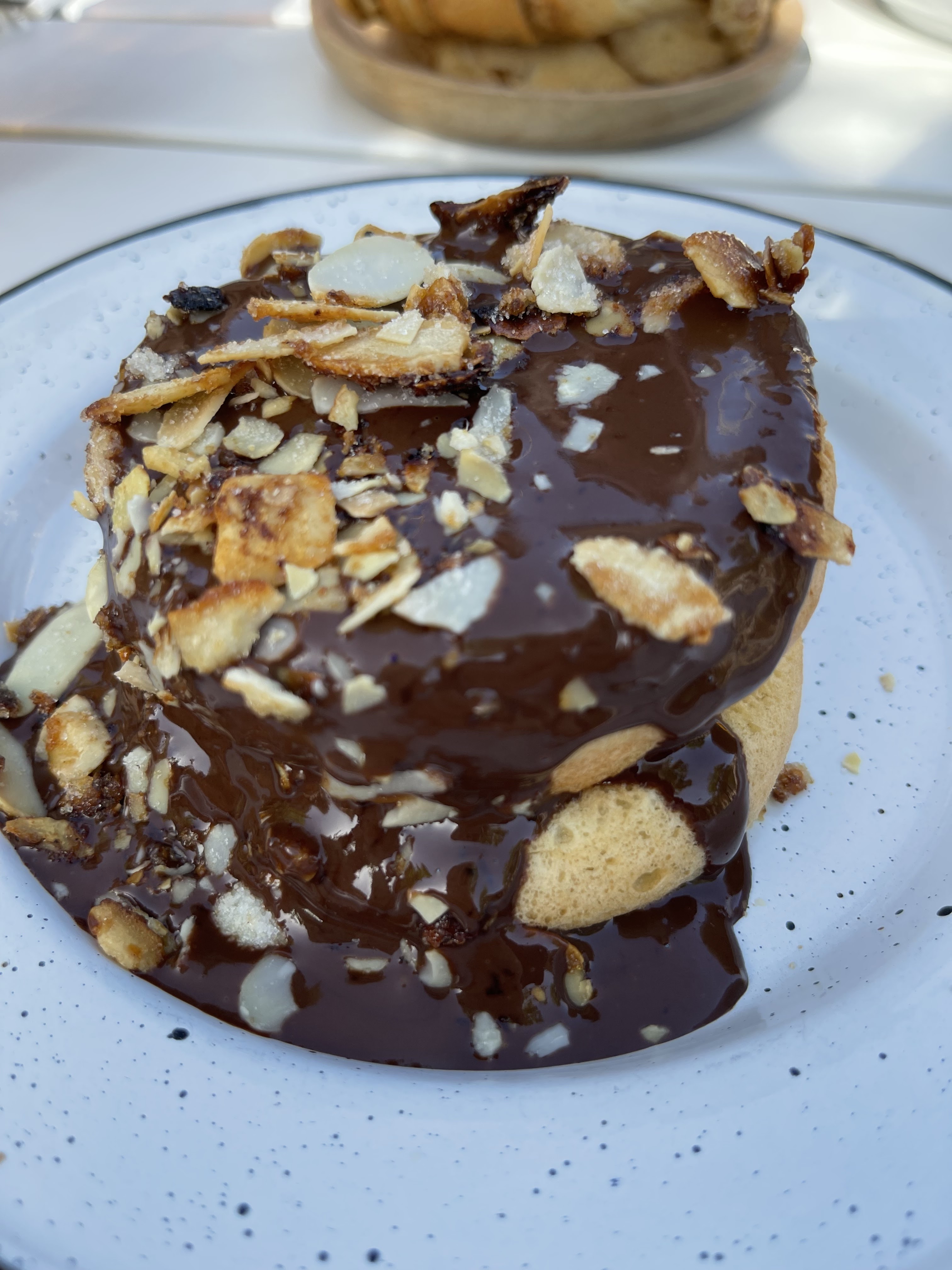 Un brunch des plus mouvementés, nous avons eu un vrai déluge (vent, pluie et orage en même temps) et malgré cela, toute l’équipe de Nosh a su gérer la situation et nous a tous abrité à côté de l’office de tourisme avant que ça n’empire. Autrement, le brunch était délicieux et copieux. Les petits pains briochés allaient parfaitement avec les œufs brouillés et la fêta et les pancakes à la nocciolata étaient très gourmands. Très agréablement étonnée par la citronnade au gingembre, très rafraîchissante !! Un excellent brunch pour le dimanche ! 🥰