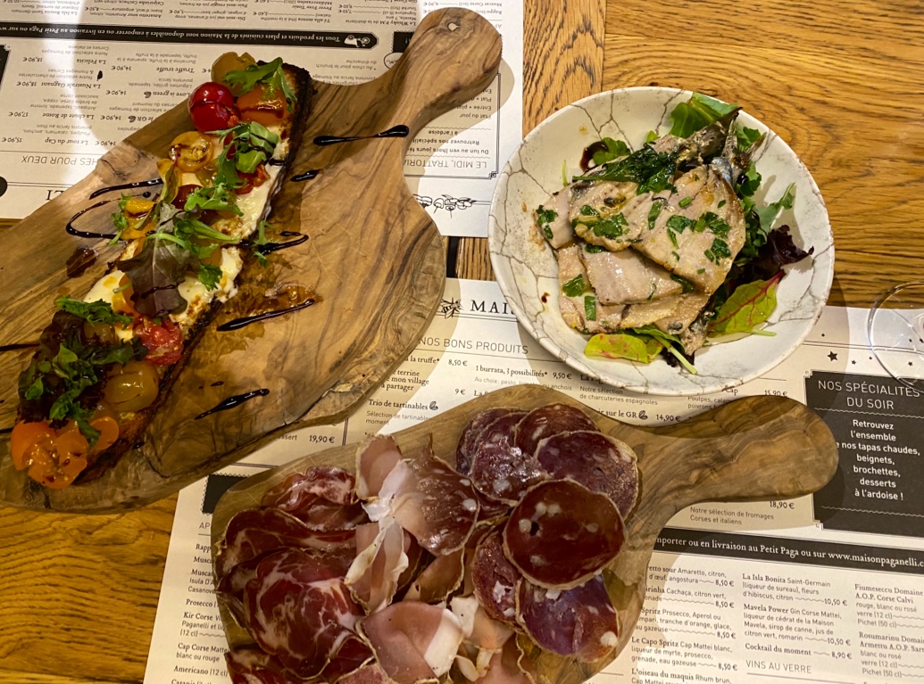 Ici le soir, dégustation des spécialités. Nous avons choisi entre amis, des planches charcuteries et fromages à partager. Un bon vin rouge corse pour affiner la note gourmande. Bon accueil, belle ambiance et bon concept. Il en reste à découvrir 😁