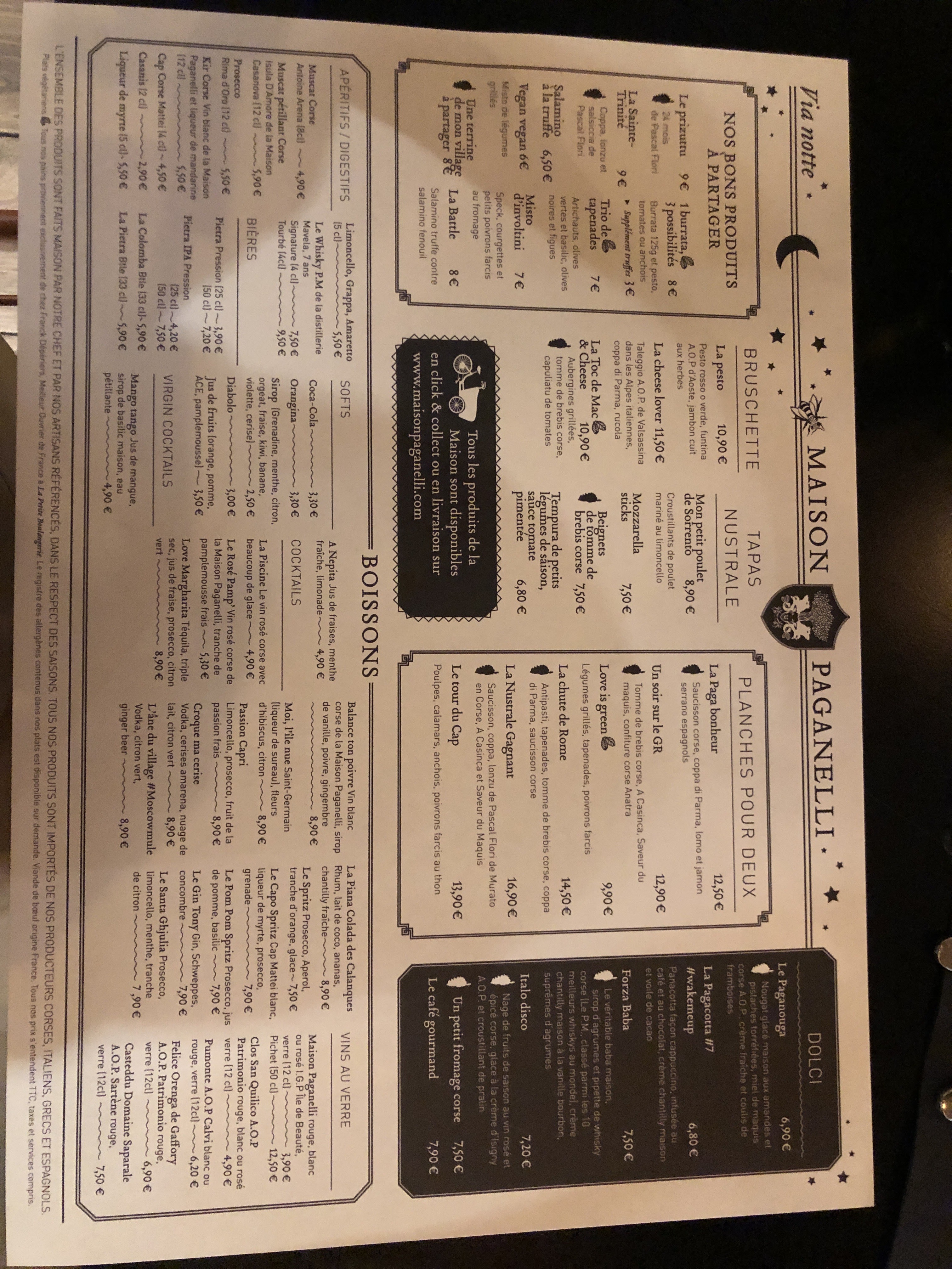 Pour une soirée entre amis nous avons réservé ce restaurant. L'ambiance correspond au terroir corse et commence donc à nous faire voyager Le voyage s'arrête très rapidement à l'ouverture de la carte. On ne comprend pas grand choses à part les prix qui s'annoncent conséquant. La serveuse habillé en tenue traditionnelle de type Adidas nous explique la carte. Restant positif on se dit que la quantité sera présente. Pour 19e vous aurez 12 tranches de charcuterie et 4 petits bouts de fromages.... Nous avons goûté une tapenade,insipide au possible. Du jamais vu. Dans le doute je viens d'effectuer un test covid car j'ai cru de nouveau avoir perdu le goût. Les serveuses ont l'air d'être au bout du rouleau. Dans ce restaurant seul l'amabilité des serveuses et la bière pietra font résonance à la corse. Par contre honnêtement vin est très bon. Voilà le topo... A ce prix là un aller retour en corse est plus rentable. Ne voulant faire pas faire preuve de mauvaise fois Cordialement.