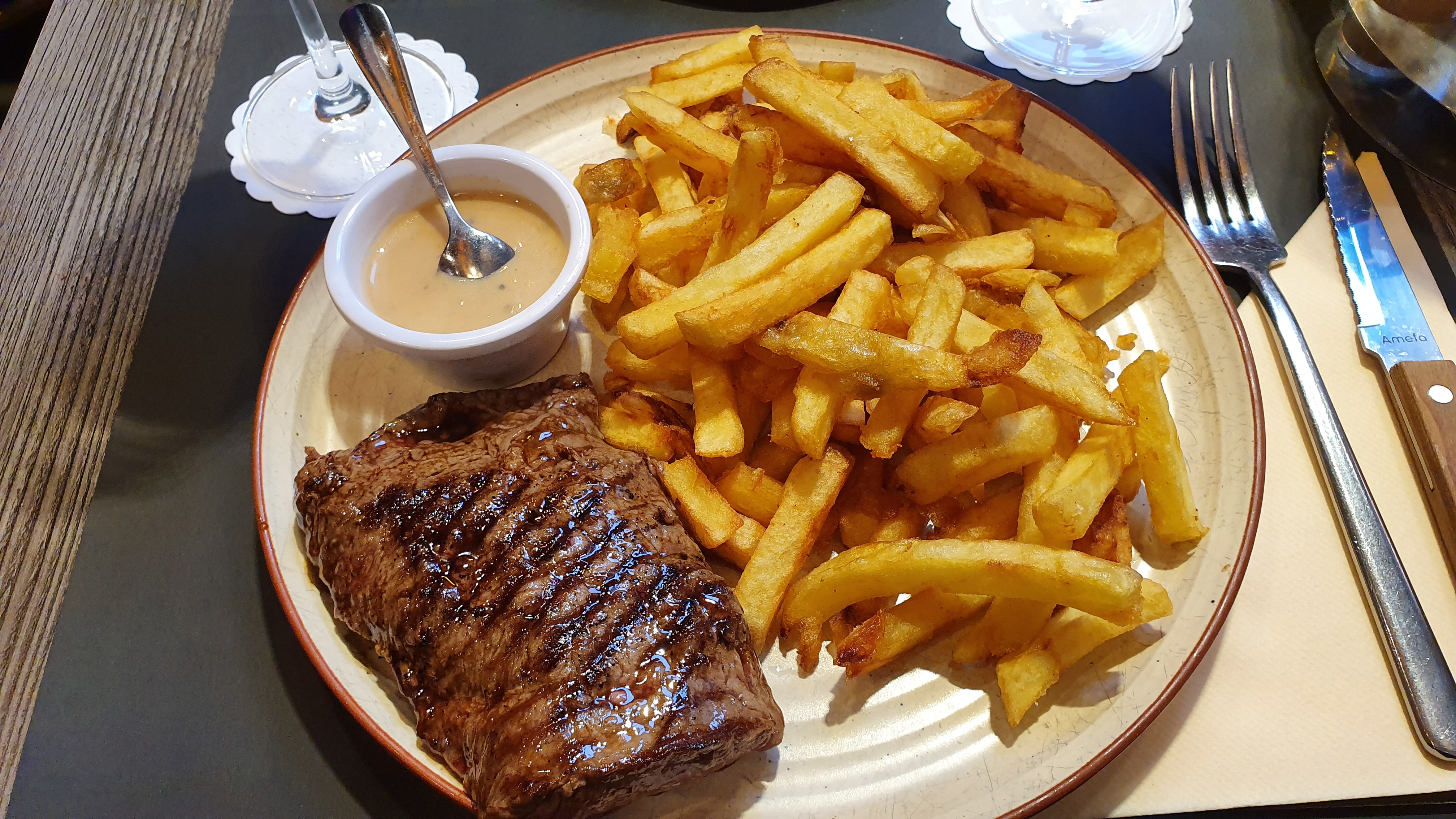 Pour un déjeuner entre amies, nous avons pris toutes les deux le rumsteak au poivre. La viande était fondante, les frites, fraîches, délicieuses, et la serveuse charmante. Un agréable moment.