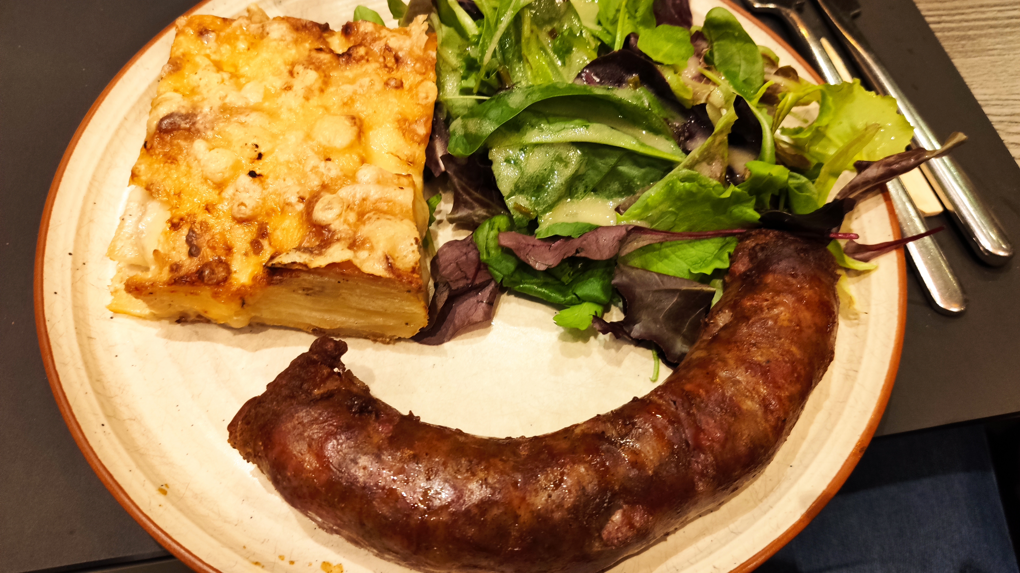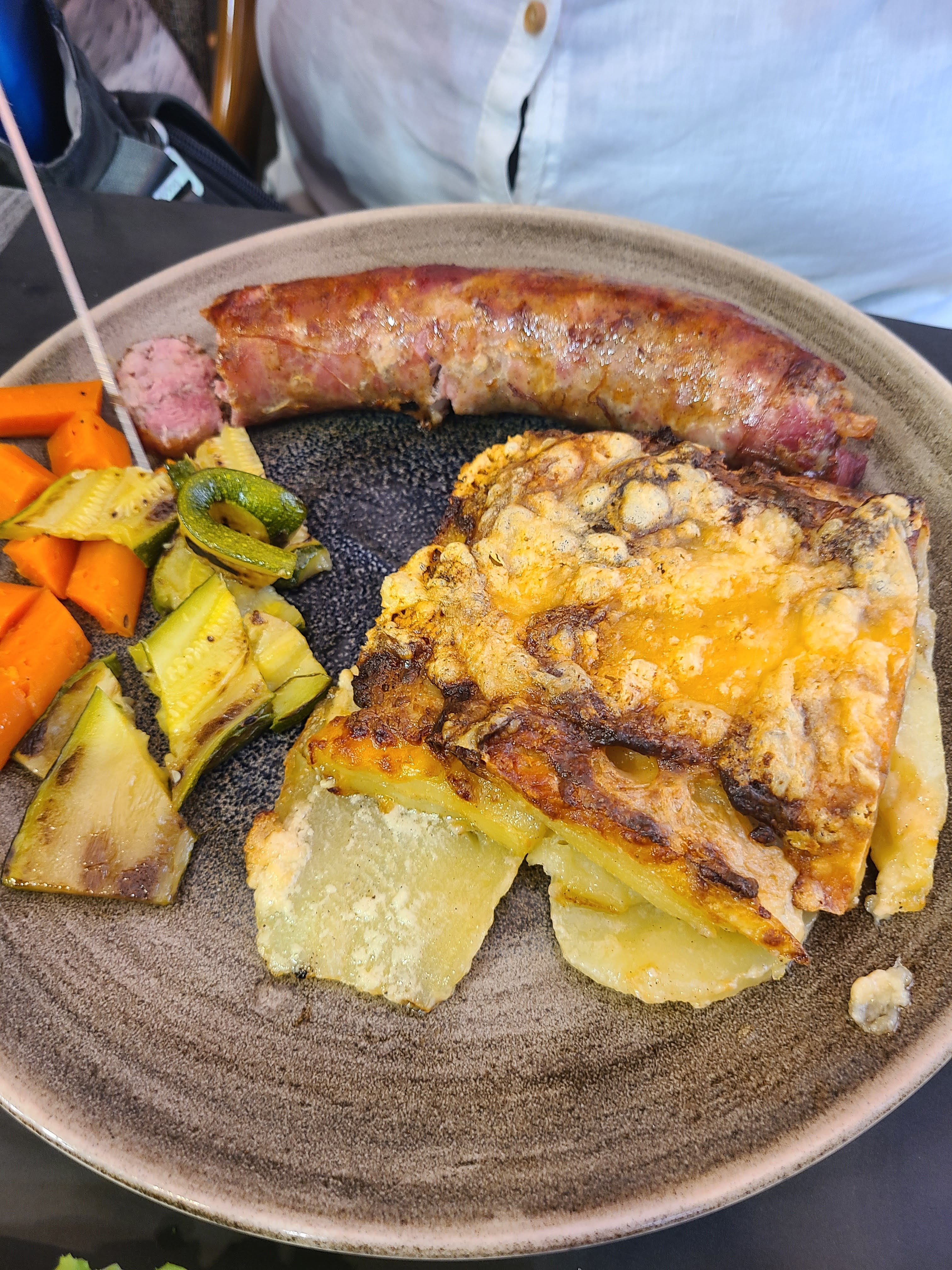Saucisse réchauffée et brûlée… gratin également… service compliqué…. Peut être ne suis je pas au même niveau d’exigence des touristes qui m’entourent…