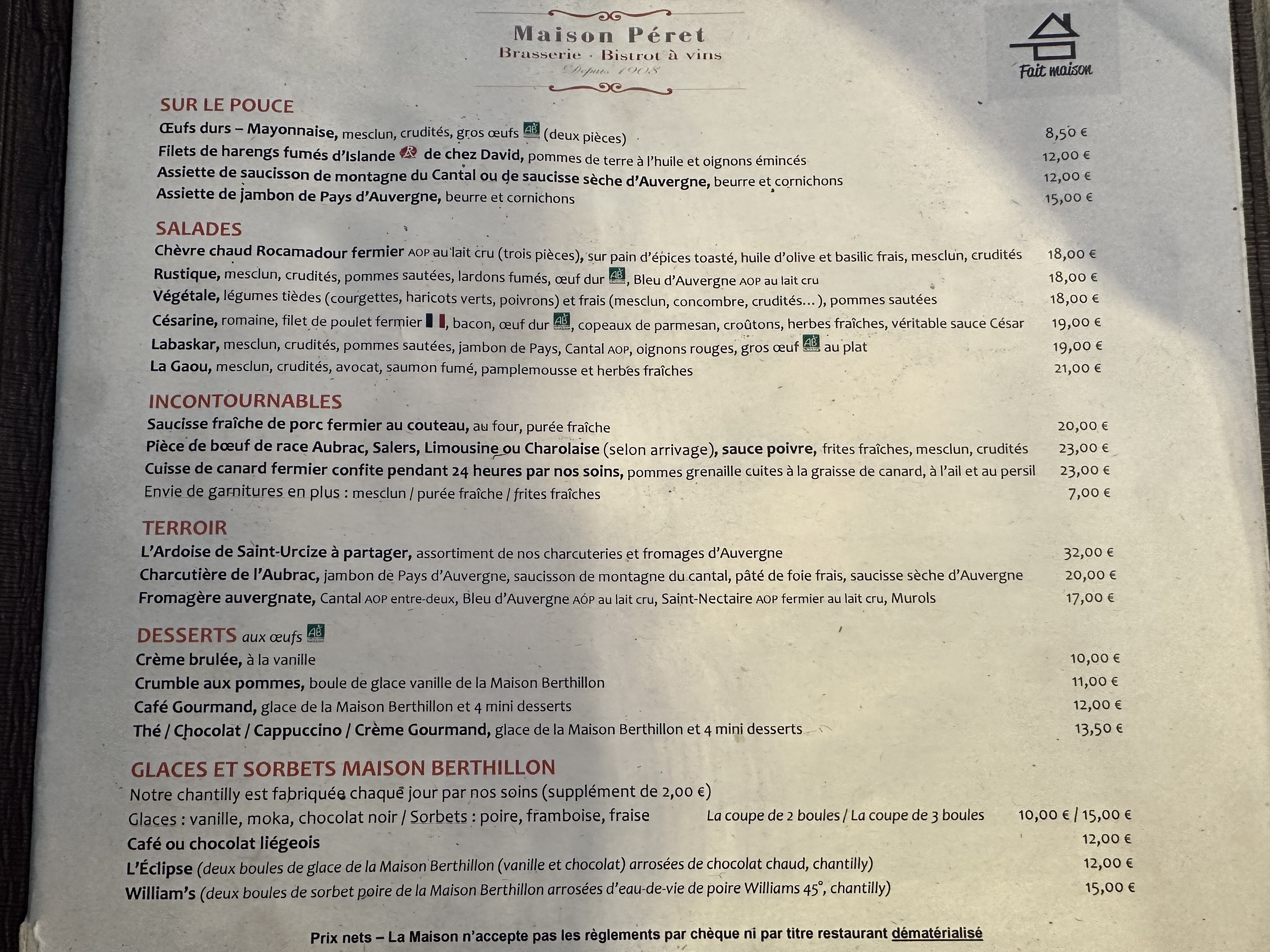 Superbe Maison à la cuisine authentique, où il est toujours agréable de se retrouver entre amis. La qualité des produits est au rendez-vous et l'équipe de service est très sympathique et toujours de bon conseil. Mention spéciale aux escargots sauvages et aux pièces de boeuf. La carte des vins est remarquable avec de jolies trouvailles. Seul ombre au tableau, la carte qui ne comporte pas d'apéritif à la gentiane de bonne qualité (un seul choix bas de gamme). Décevant pour une maison avec de si bons produits d'Auvergne.