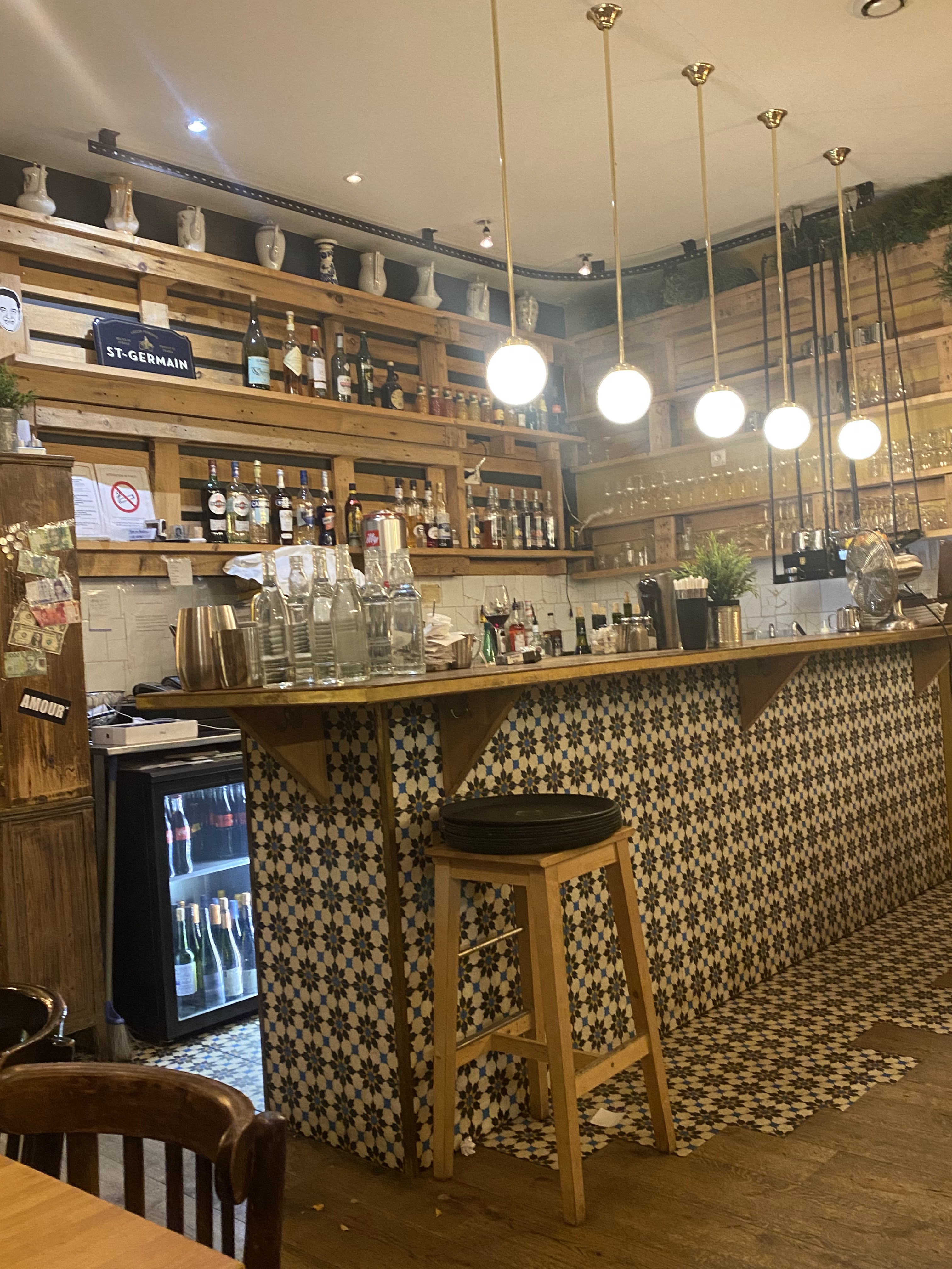 Un petit bijou avec une carte basique mais savoureuse à des prix raisonnables pour Paris. Les happy hours de 16h à 19h font baisser le prix du vin et de la bière de quelques euros. Très accueillant pour notre jeune famille.