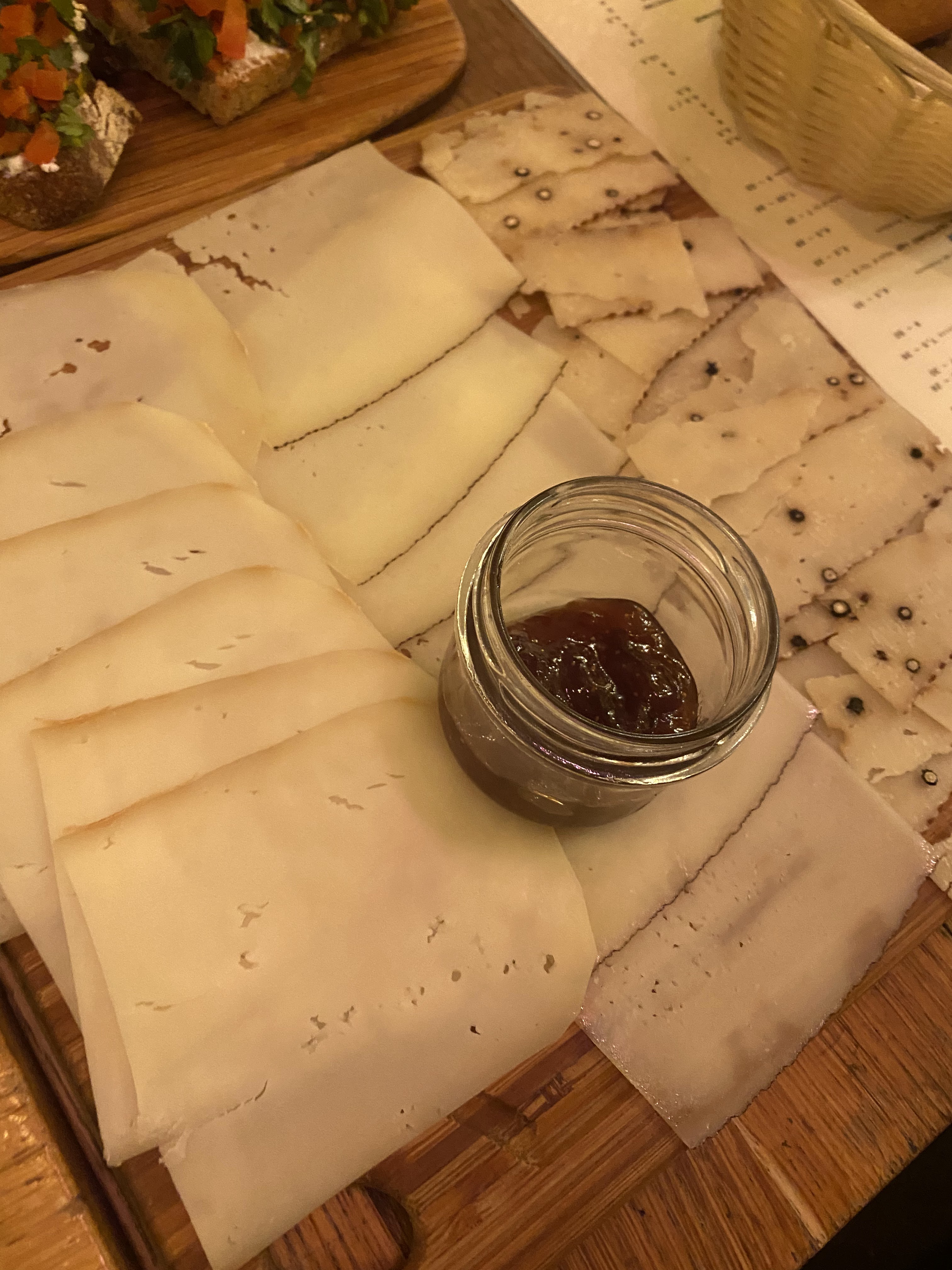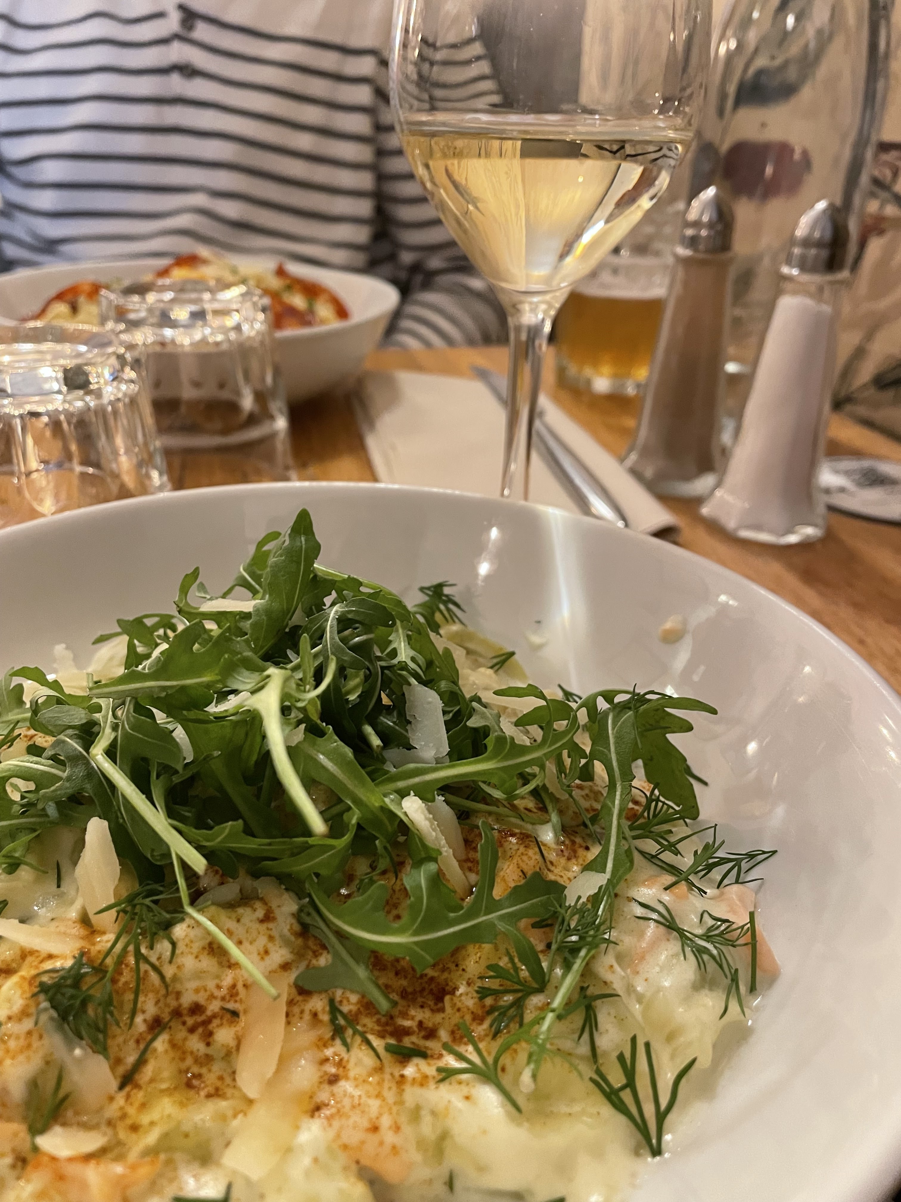 Il y avait des raviolis aux truffes et ils naviguaient dans la crème. Pas frais du tout et le goût n'était pas génial. Le vin était bon marché et tout était trop cher.