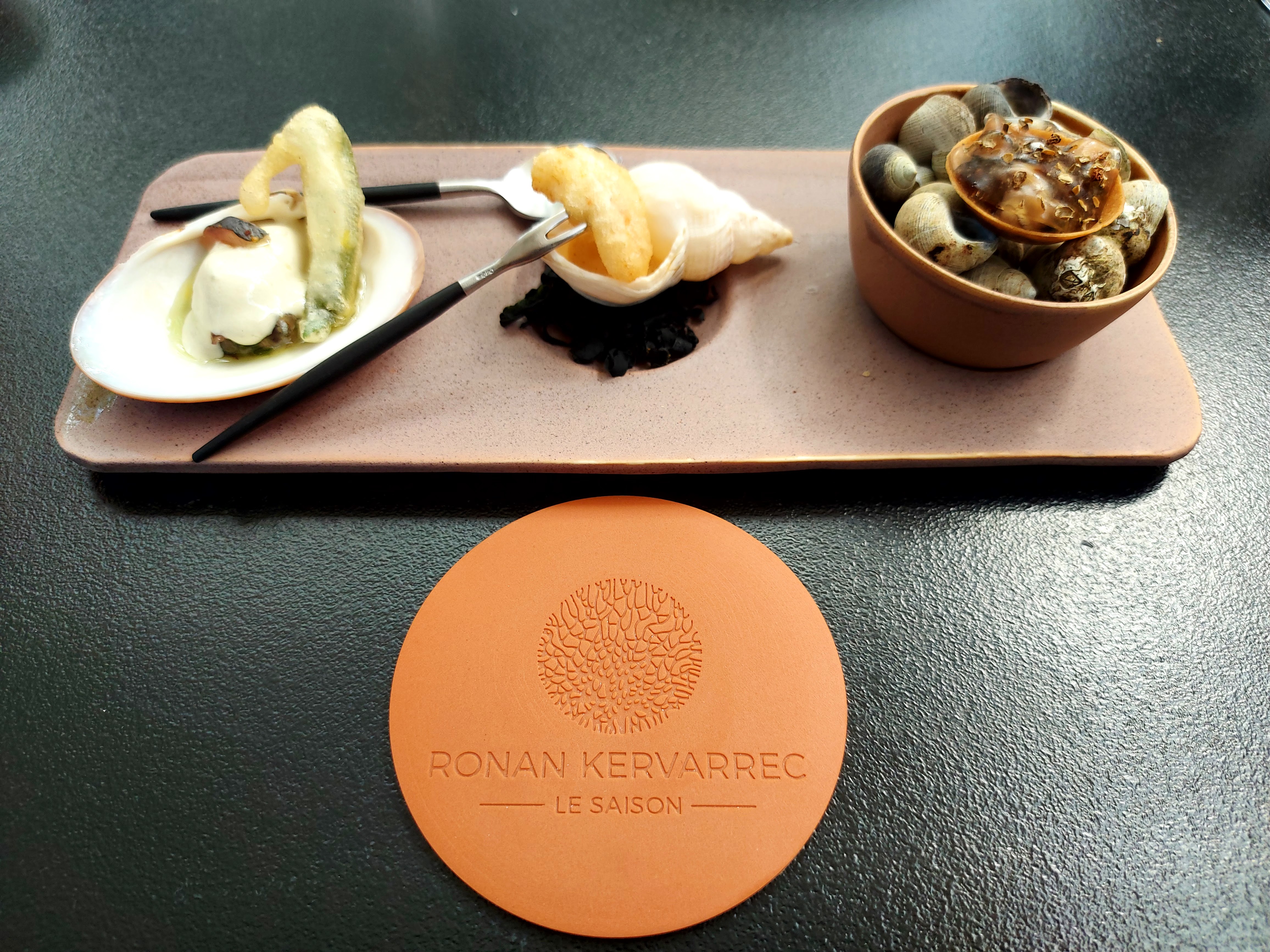 Le bistrotier peut pas toujours nous accueillir avec une bonne tape sur l'épaule ou en hurlant bienvenu l'ami de derrière son contuche, alors on accepte l'accueil en grande pompe mais c'est l'établissement qui veut ça, et après tout ça fait pas de mal de se sentir important de temps en temps. Pas fâchés avec l'apéritif, on se fait superbement conseiller vers un bon combustible bien tourbé et après un rapide tâtonnement du sommelier le p'tit verre de blanc qui va bien pointe le bout de son pieds. On reste sur le thème de l'apéritif puisque qu'on attaque avec un shot pris directement au cul du bulot, et BAM, on vient se faire napper la goule par 2cl d'un jus divin , on se dit alors que les 3 prochaines heures vont pas être désagréables.... Le passage à table s'opère avec délicatesse, prêt à en découdre après un chouette défilé d'amuse bouche ! Bien grand nous fasse d'avoir pris la mer avec l'option 7 escales. Un beau voyage, pas bien loin hein, car on reste sur les cotes Bretonnes tout au long de notre croisière. La gamelle est ultra locale et quand on remet un pied sur la terre ferme c'est pour déguster un beurre unique fait à 4 minutes de là, ou de l'andouille du pays comme on dit... La mère du défunt veau doit pas paître bien loin non plus. On s'est pas moqué de nous au SAISON, l'ensemble des mets sont des produits raffinés et bien sourcés qu'on retrouve pas dans son écuelle tous les 4 matins. Je vous laisse la surprise sur les produits phares au centre de ces assiettes généralement iodés mais comprenez quand même que ceux ci sont pertinemment accompagnés d'onctueux jus, sauces, émulsions et bouillons. Biens souvent régressifs, tantôt troublants, tantôt saisissants , mais toujours justes et réconfortants. Et bien sûr on sauce ,on est pas des bêtes, et ce serait peu habile d'en laisser pour la plonge…. Aller Chef , une petite remarque quand même; il m'a manqué sur un plat au moins un bon gros coup de twist, les caresses c'est chouette mais de temps en temps on aime bien se faire du mal. Alors j'aurais été friand, certainement avec l'ormeau, que l'algue fasse profil bas au bénéfice d'un kick de piment (y'a des trucs coquins qui titilles chez JP Bocel à Pacé) ou d'un grand coup d'acidité histoire de se prendre une petite tempête au milieu de la balade en pêche-promenade :) On s'étale pas sur la déco et les détails, d'une j'y connais rien et de deux vous vous doutez que vous allez pas souper avec un couteau à steak dans une vieille bicoque délabrée. Bref Je bosse pas encore chez l'autre tas de pneus mais ca vaut bien au dessus d'une seule ⭐ Bravo et merci à l'équipage