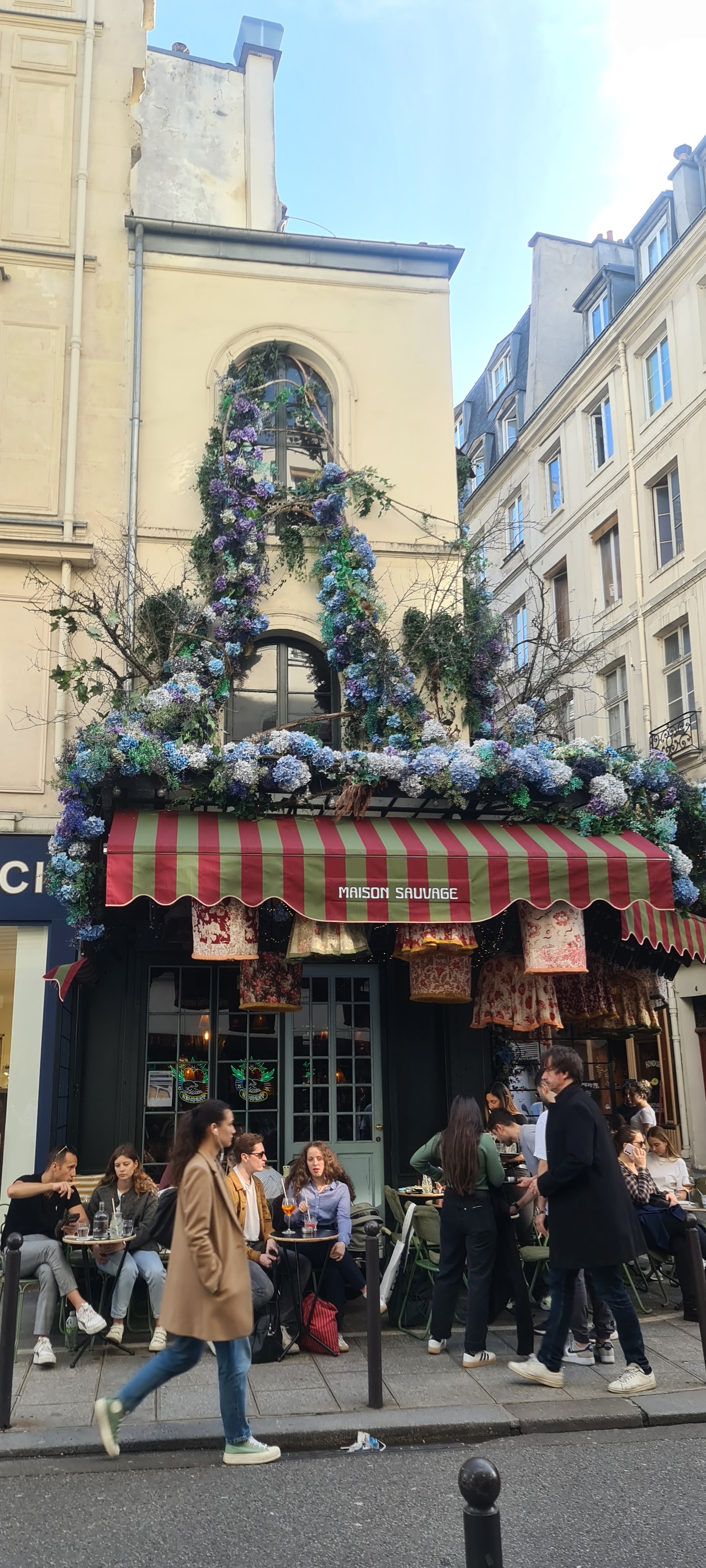 Maison Sauvage avec son décoration florale attire des gens pour goûter ses plats, pour prendre un ☕ avec 📖 et juste poser s'asseoir et regarder le défilé les gens dans la Rue Bucci