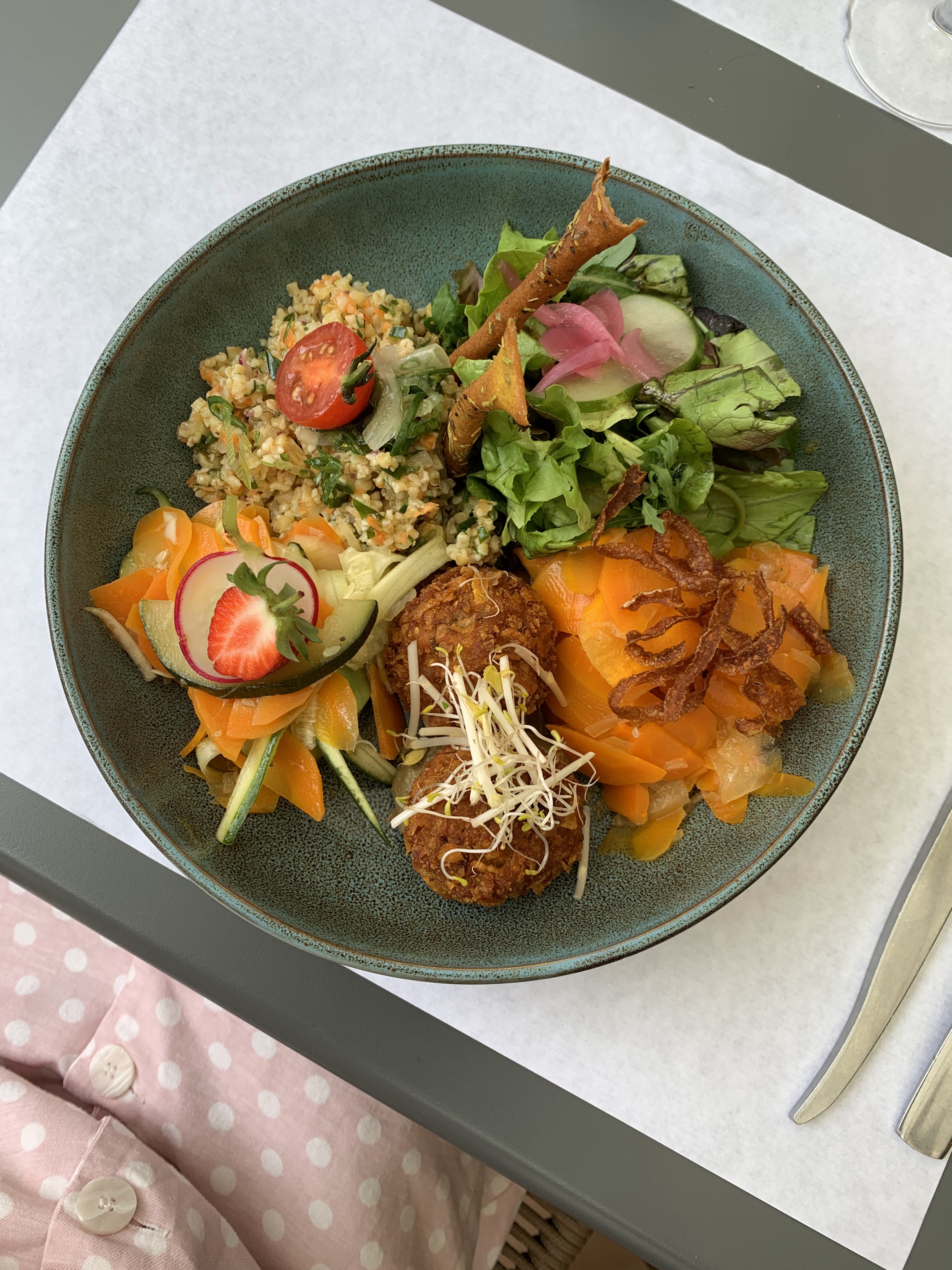 Repas au top dans ce restaurant situé sur la place du marché ! Option vegan avec le Buddha Bowl qui était délicieux ! Desserts succulents également. Service agréable.