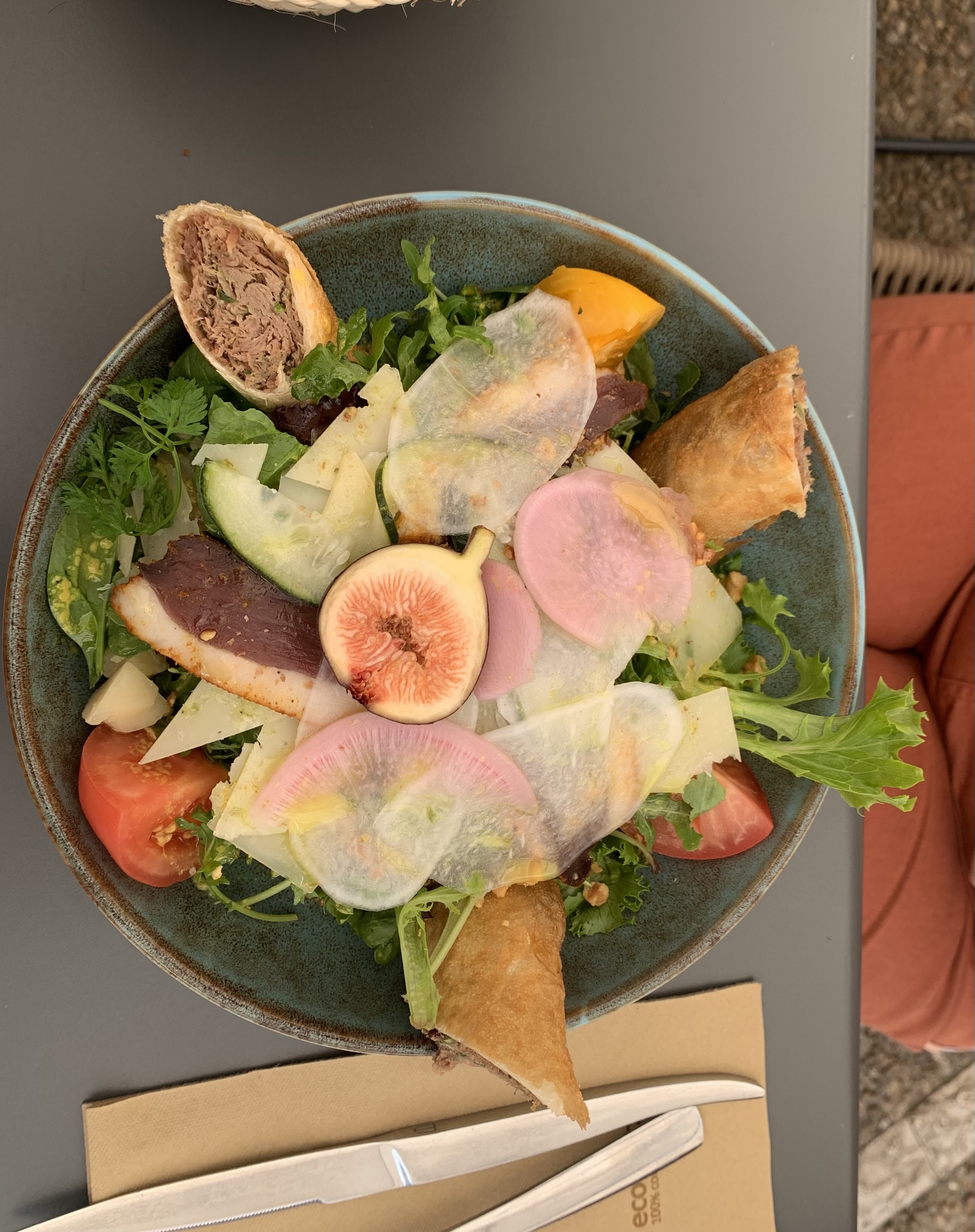 Déjeuner en terrasse avec vue sur la très belle halle de Martel. Service rapide et agréable malgré l'affluence, très bons conseils. Les nems de confit de canard sont excellents avec une petite salade de lanières de légumes crus très rafraîchissante, belle assiette de Sophie originale et goûteuse à base de produits locaux. J'ai recommandé ce restaurant à des amis qui ont également adoré.