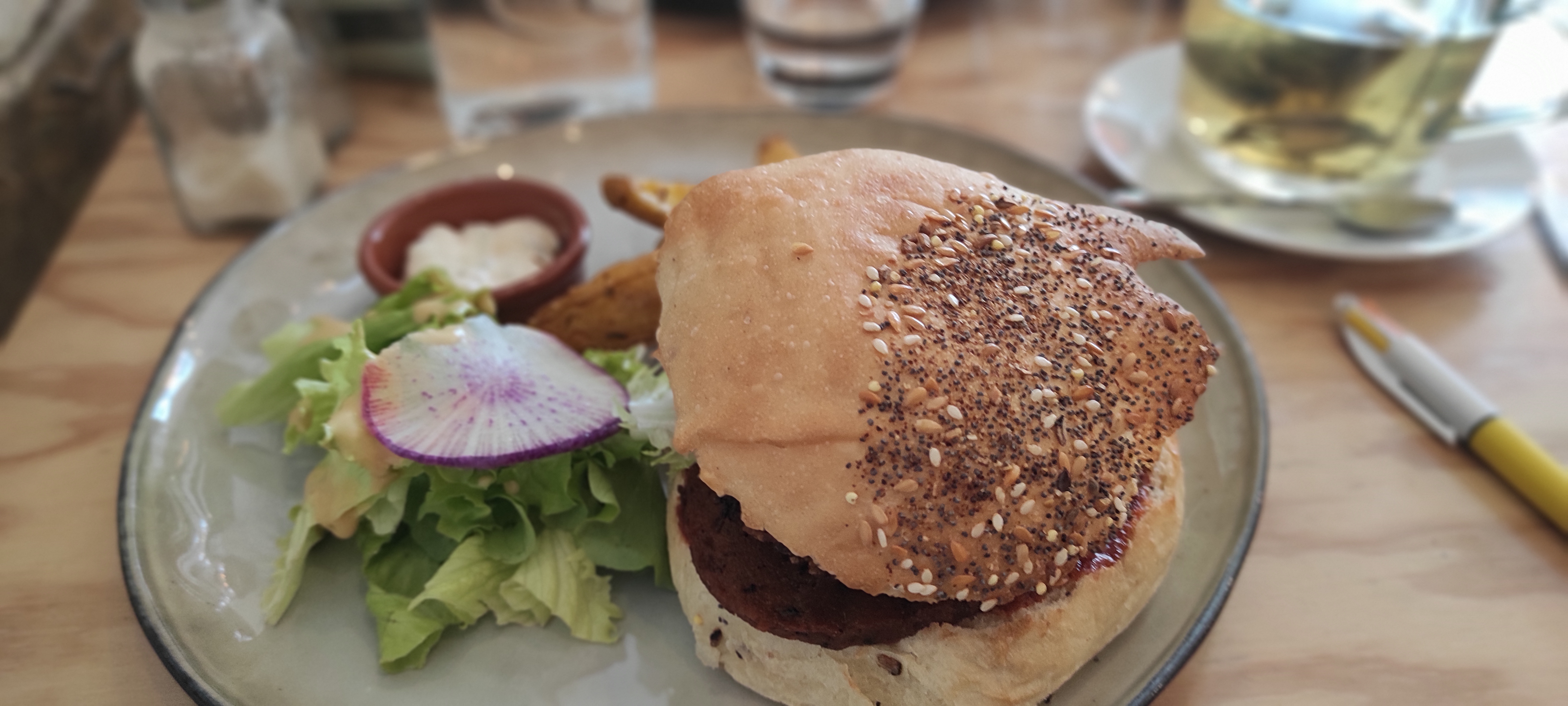 En attendant le train, ptit restau vegan trop cool ! La serveuse est trop gentille, la nourriture super bonne et quantité idéale. Le lieu est spacieux et agréable, un sans faute :) Le pain du burger est incroyable et le muffin au citron miam !