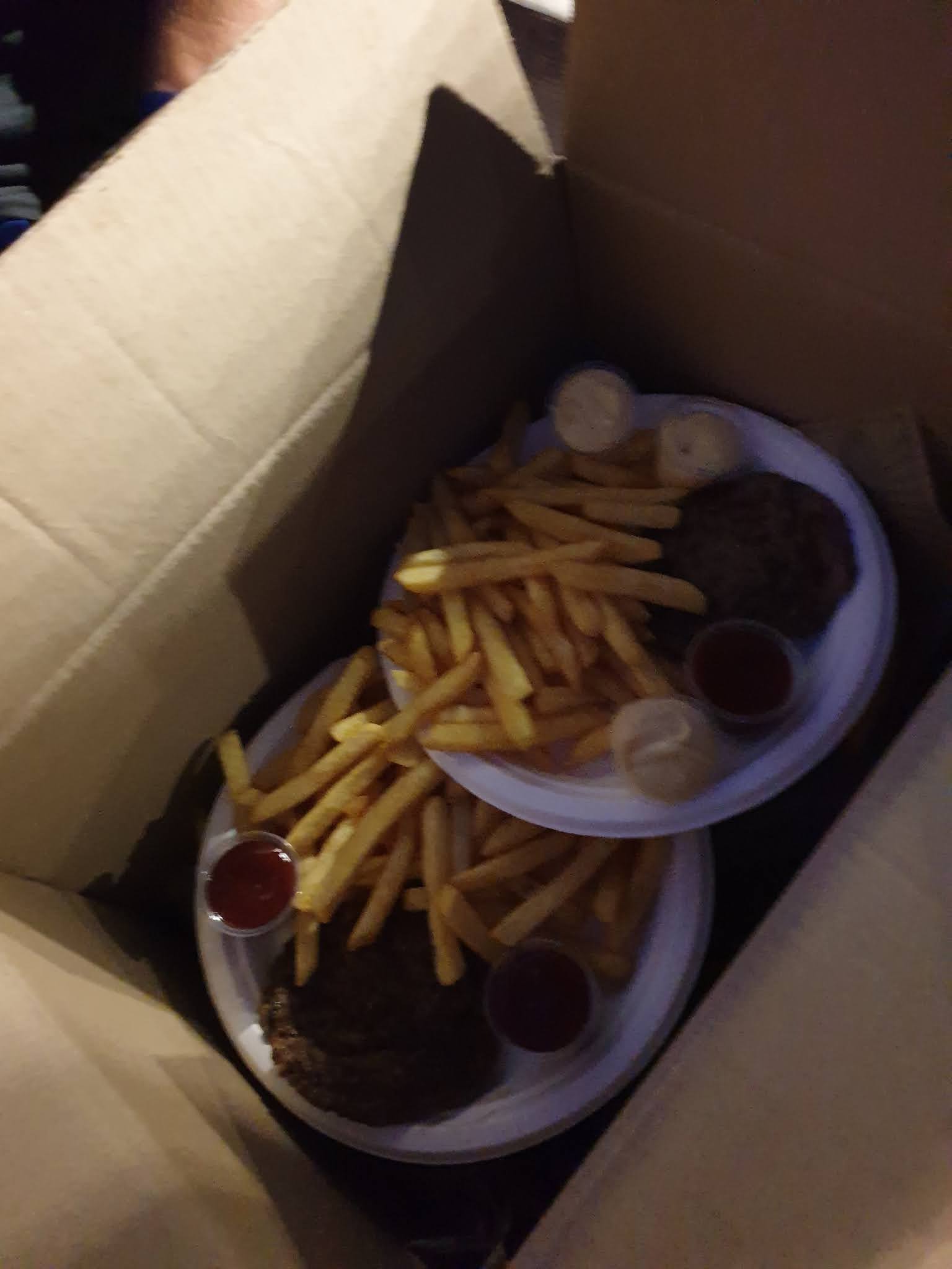 Commande à emporter pour 5 personnes empliée dans un carton de frites congelés. La cuisson des steaks n'est pas respectée (j'avais demandé à point, et non pas cru). Ils ont vu qu'on était ensemble à parler et non pas demandé si toutes les commandes étaient ensembles... ils l'ont déduis d'eux même. De plus, les distanciations sociales des autres clients de sont pas respecter.