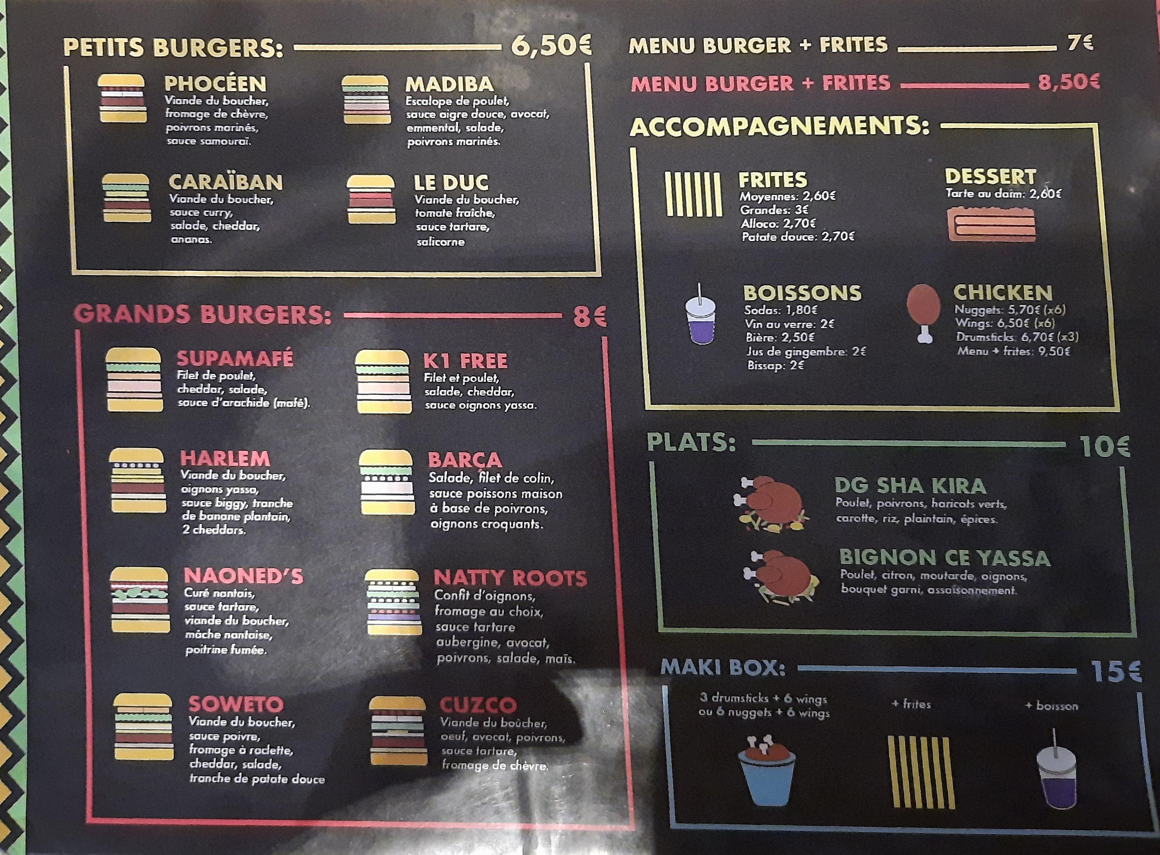 Voulez vous manger des burgers qui changent de l'ordinaire avec des frites à se rouler par terre ? Foncez au Maki Burger, et n'oubliez pas de prendre un verre de bissap ! Comme toutes les bonnes choses, les plats prennent le temps, mais vous ne regretterez pas d'avoir patienter un peu plus longtemps plutôt que d'avoir foncé au premier kebab pour vous rassasier. Prenez le temps, mangez lentement, et allez au Maki Burger