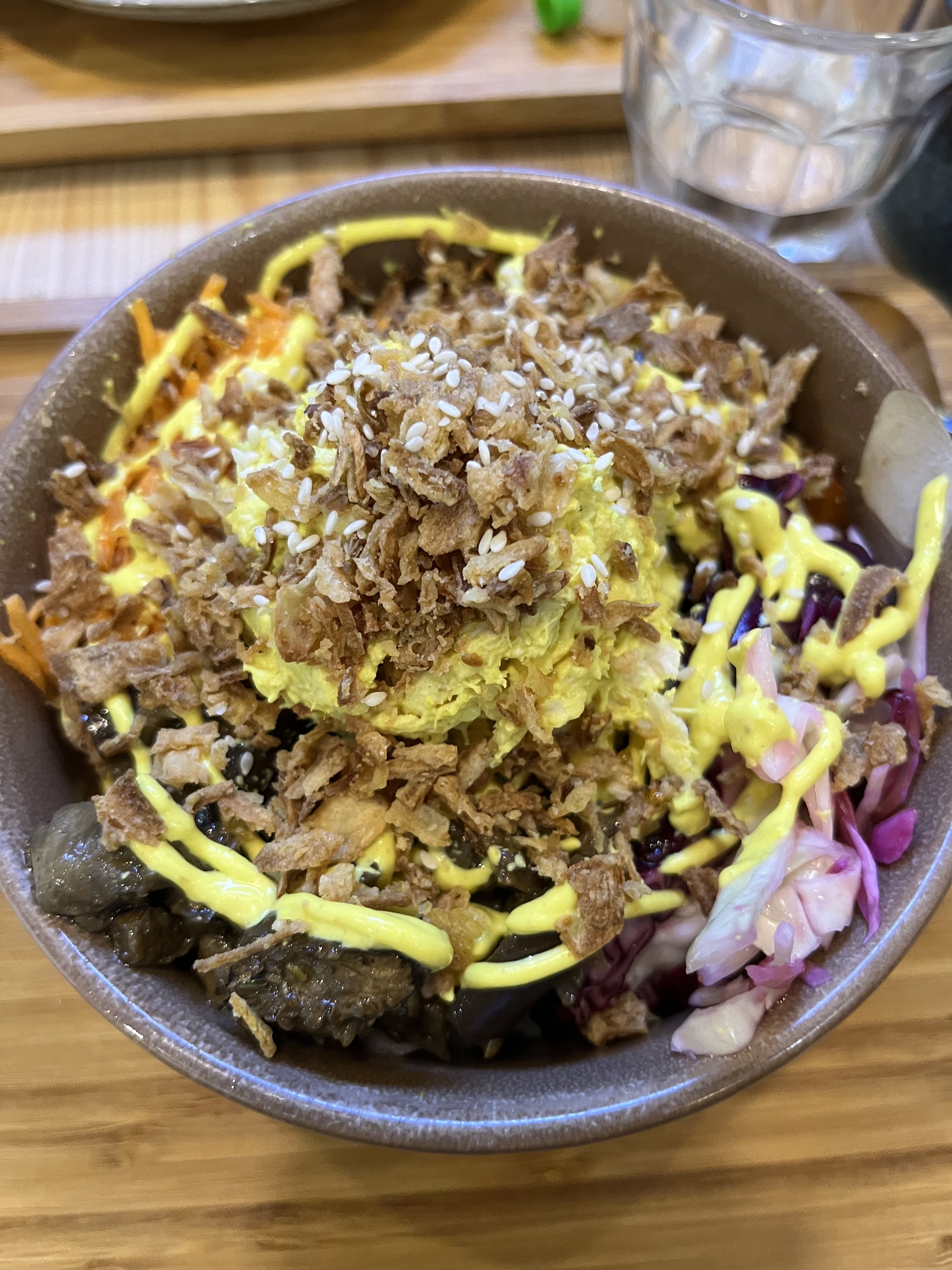 Excellent pokebool, frais, copieux et généreux en garniture. Pas de riz à outrance et Excellent mélange ! J etais seule donc côté ambiance c'était calme mais les gérants sont sympas.