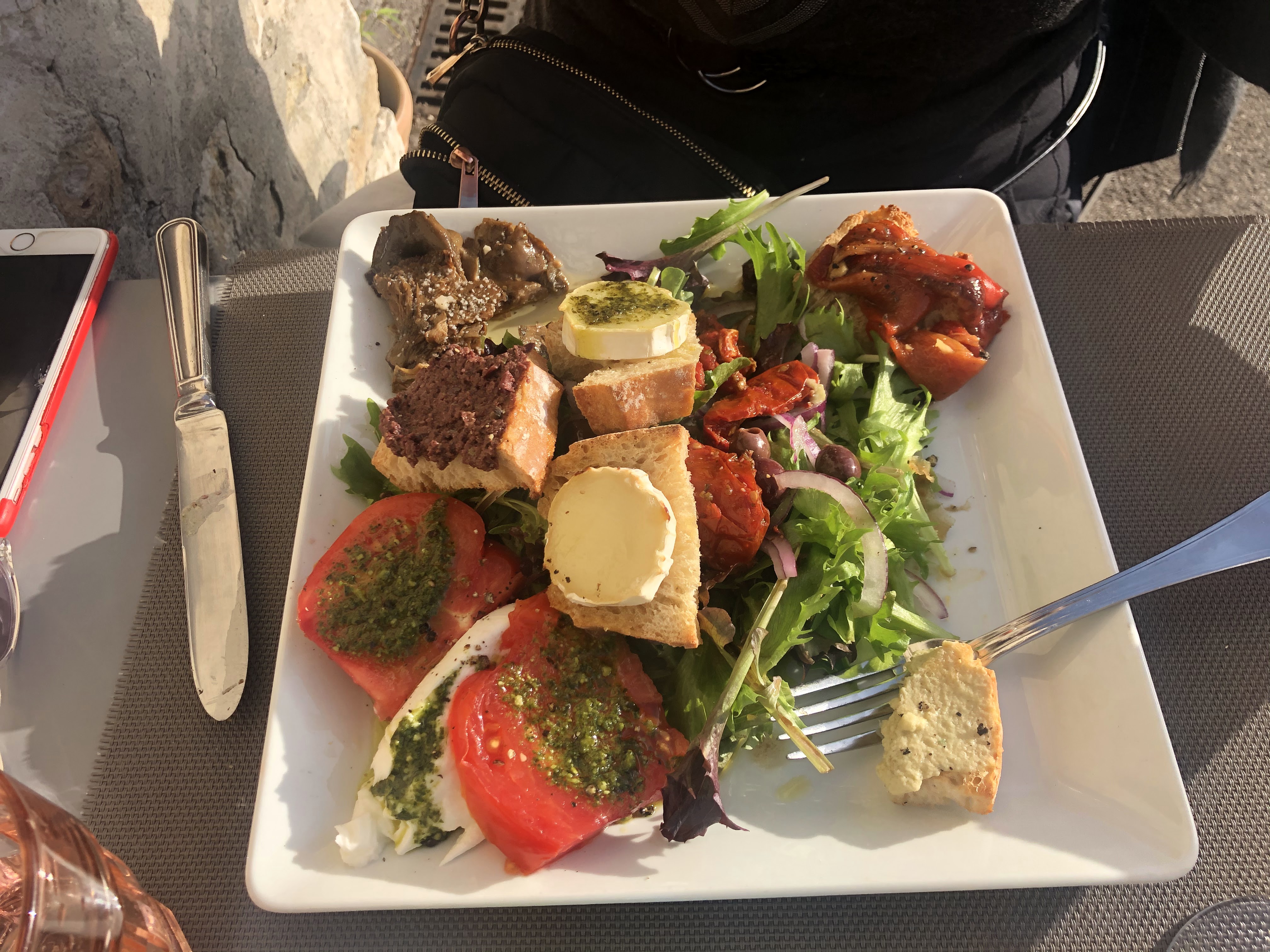 Nous avons très bien mangé, partis en visite dans le village nous étions à la recherche d'un plat frais. Chose faite avec la salade provençale et ses légumes grilles, sanguins, poivrons et les petites tartines sauce pesto, un régal ! La décoration est très jolie aussi !